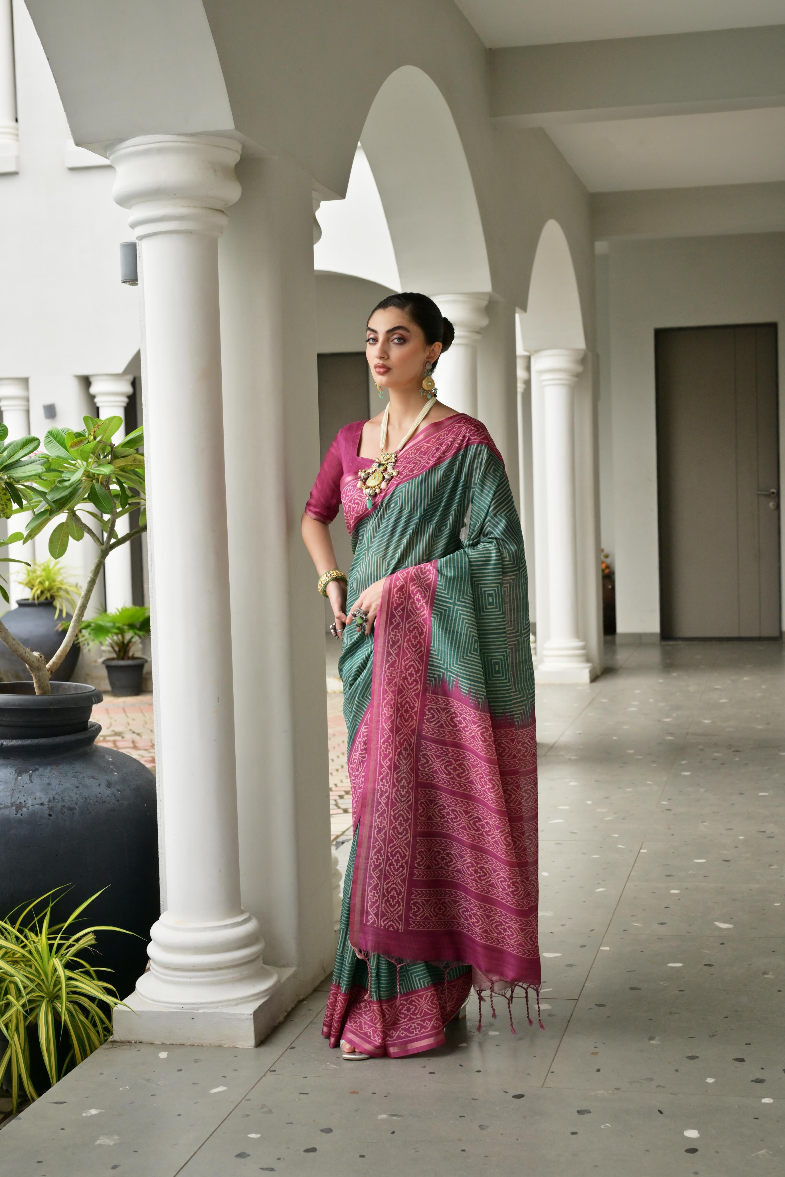 Green Color Tussar Silk Fabric Ikkat Printed Traditional Ethnic Saree