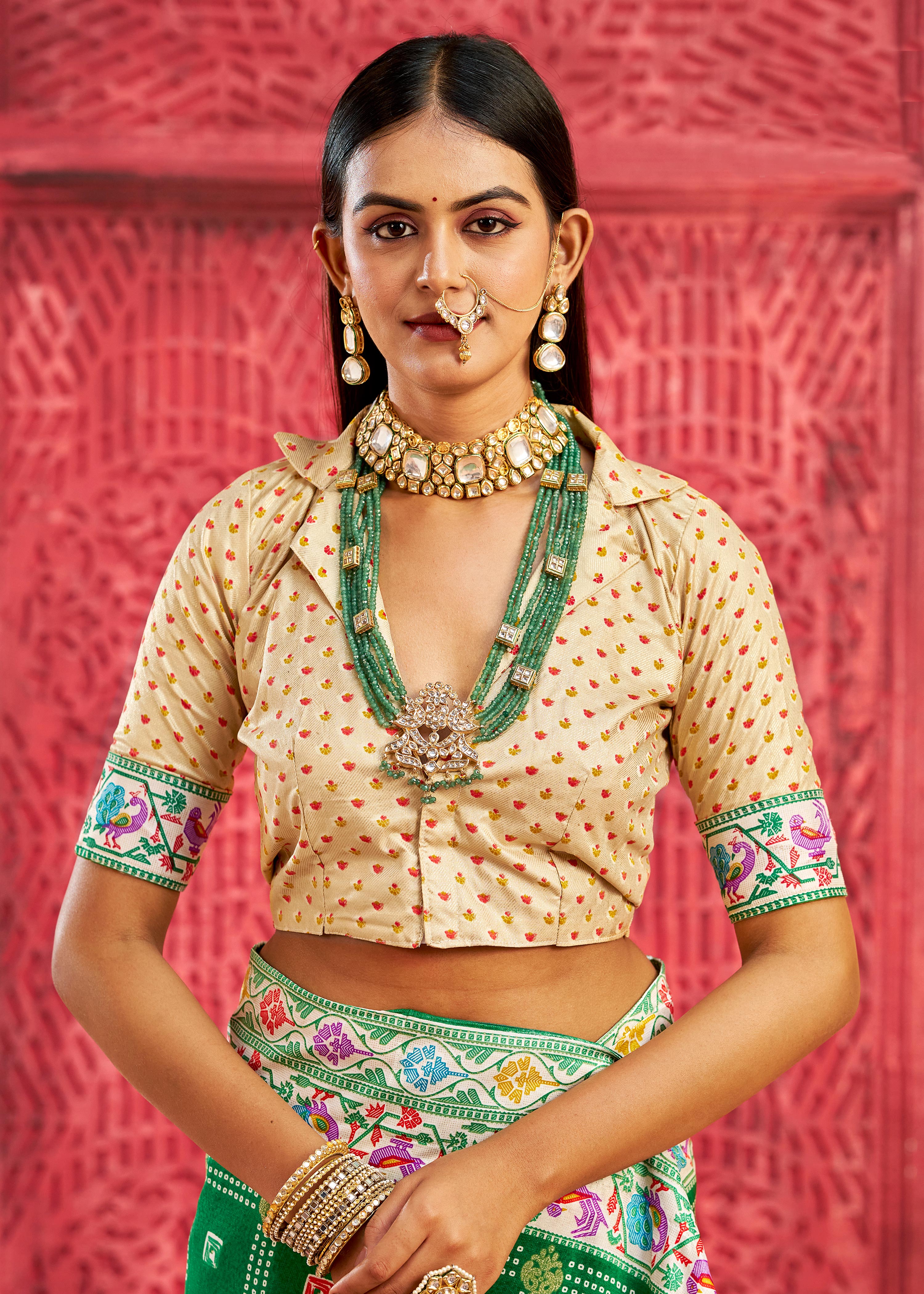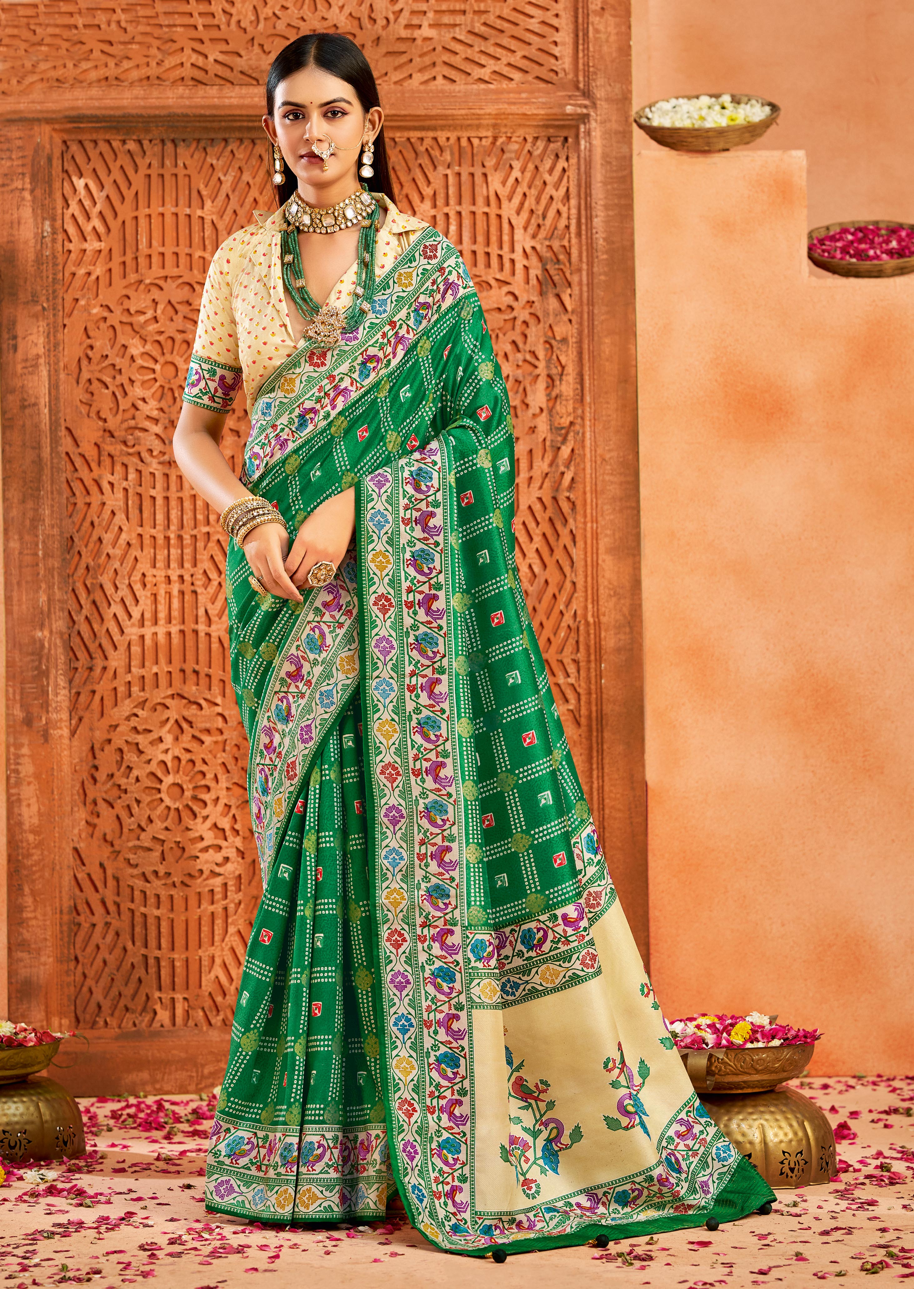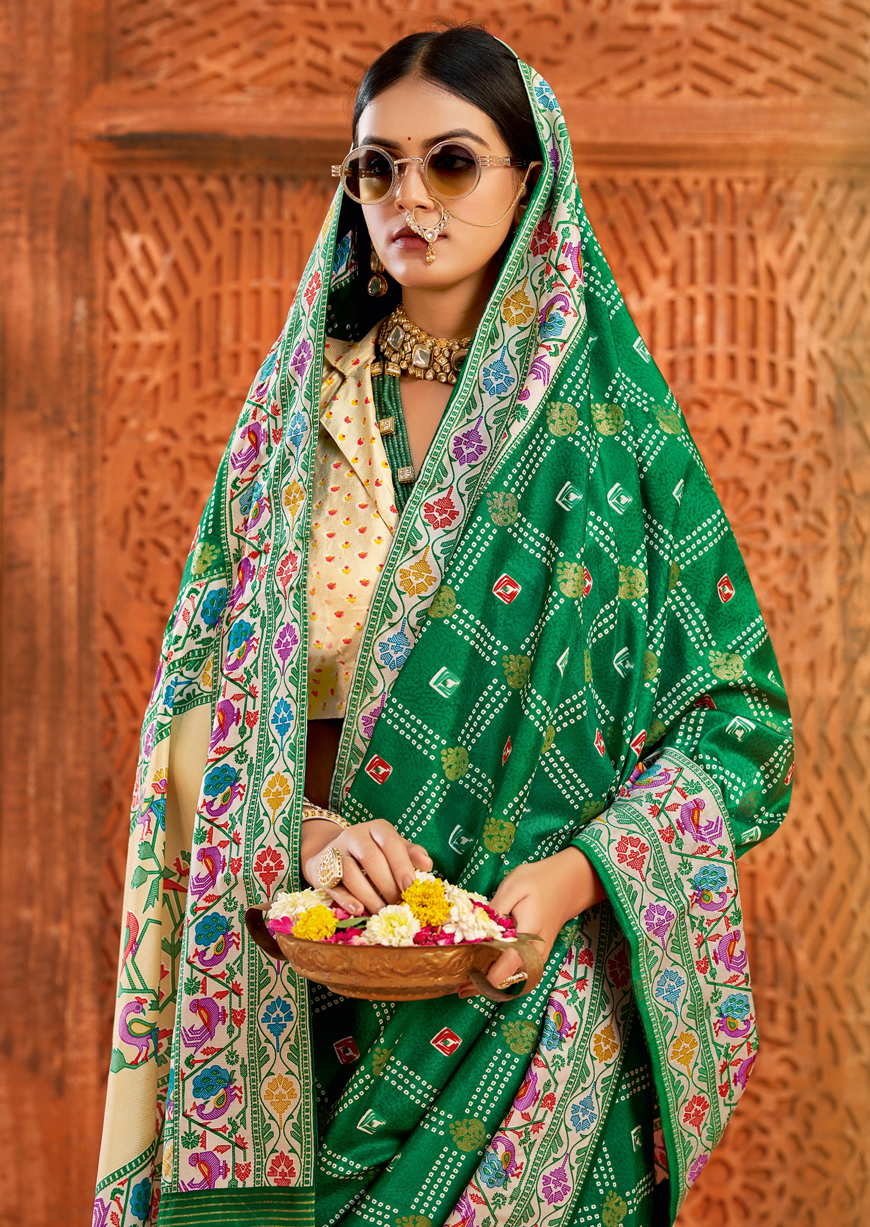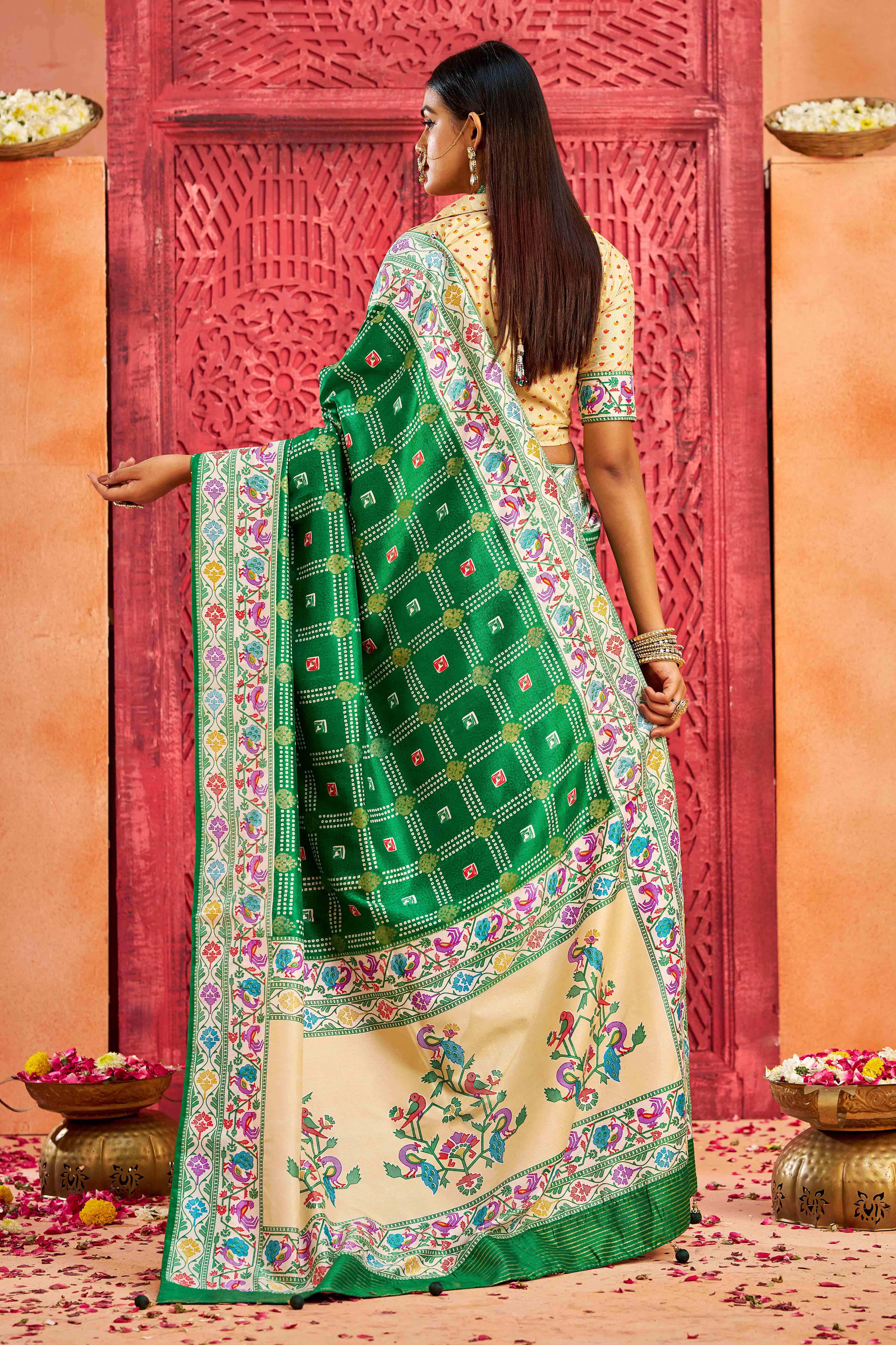 Green Color Velvet Tussar Silk Fabric Partywear Saree With Paithani Pallu And Traditional Ghatchola Print