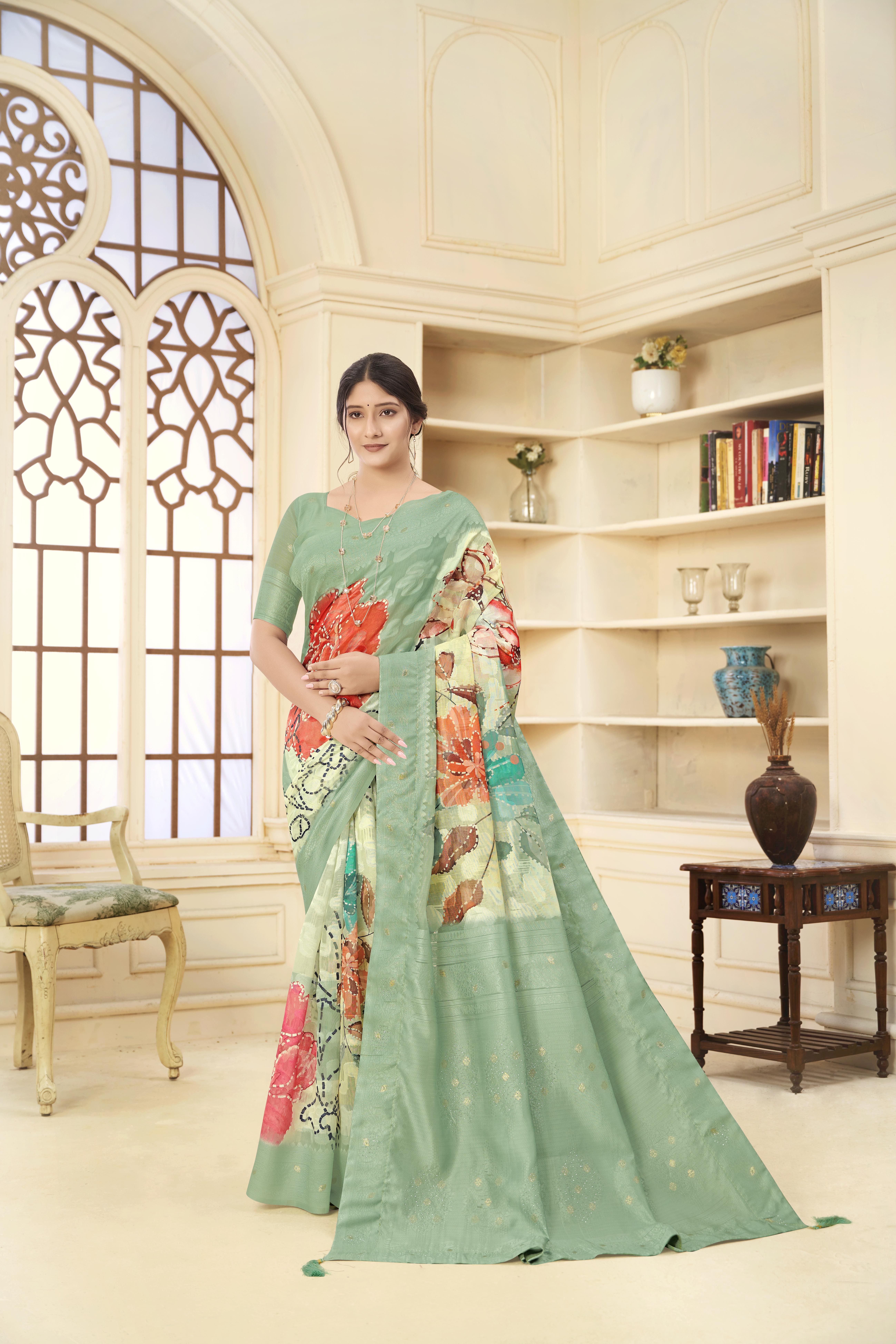 Green Color Wevon Jacquard Designer With Printed Rich Silk Fabric Stylish Ceremonial Saree
