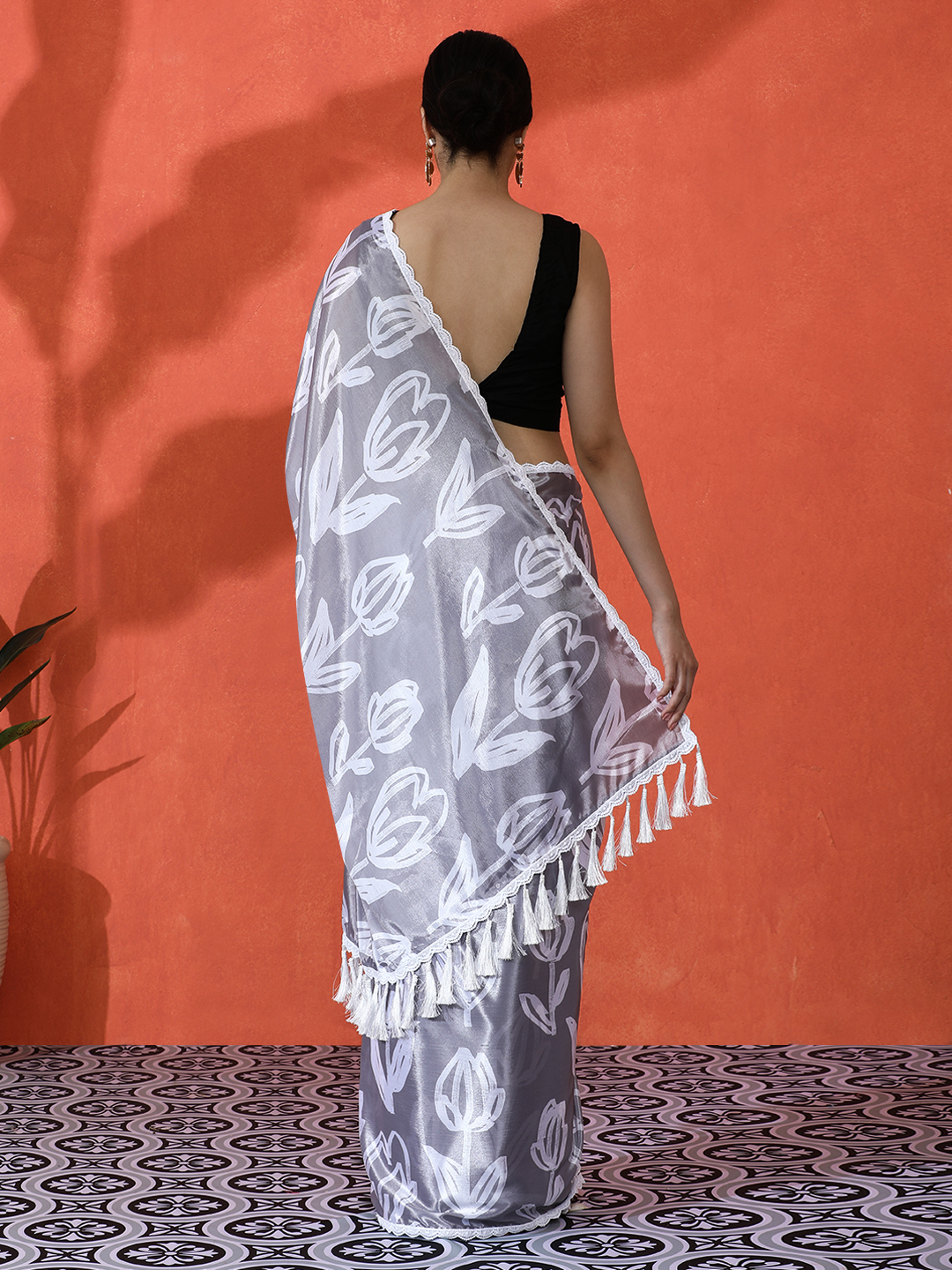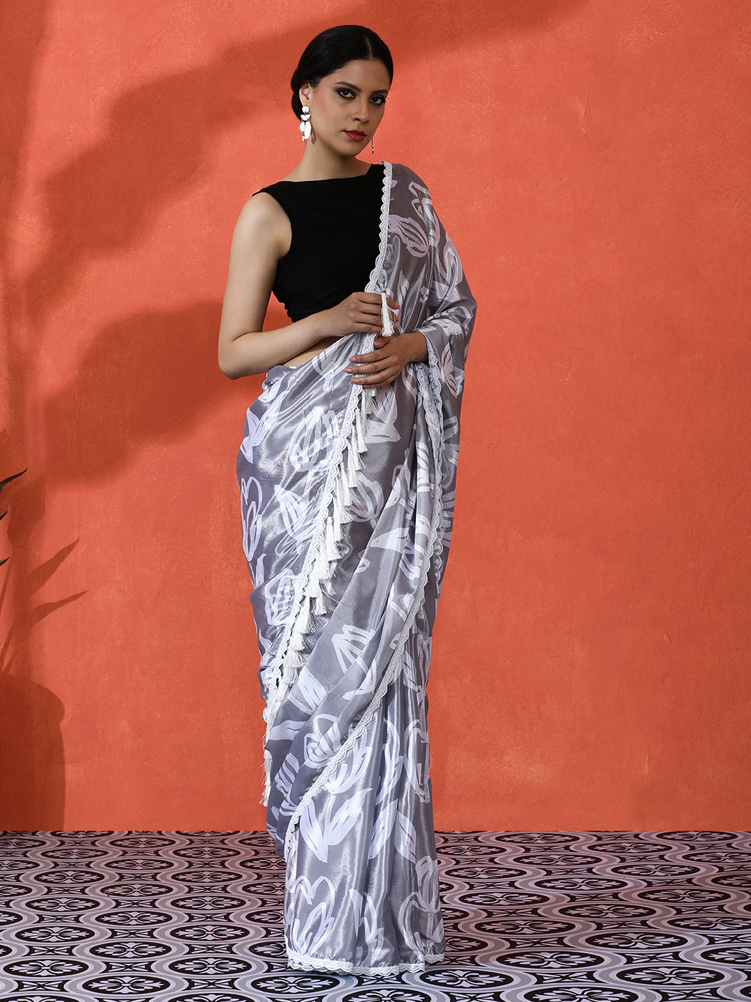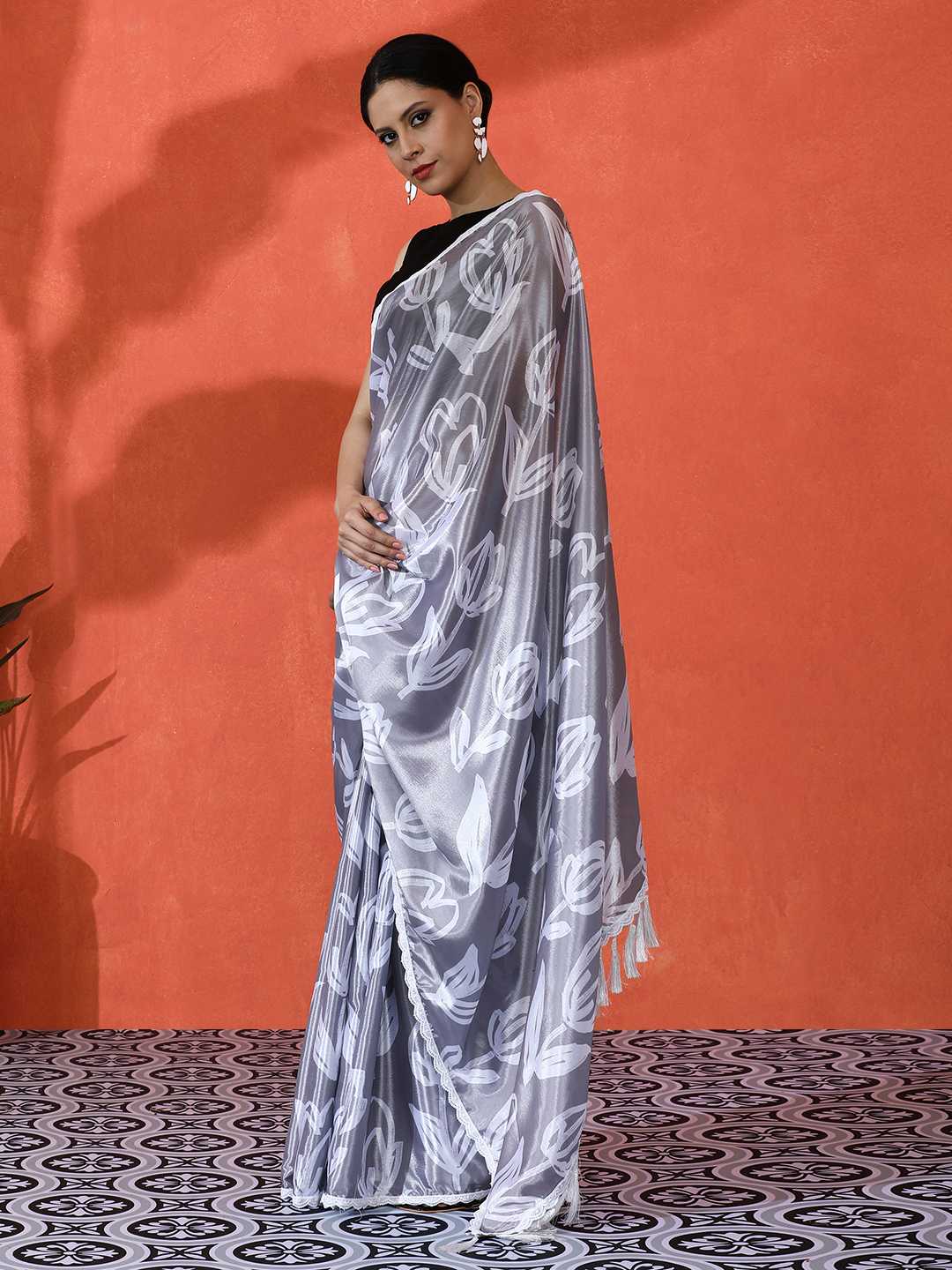 Grey Color Chinon Fabric Saree With Beautiful Digital Print For Ceremonial Wear