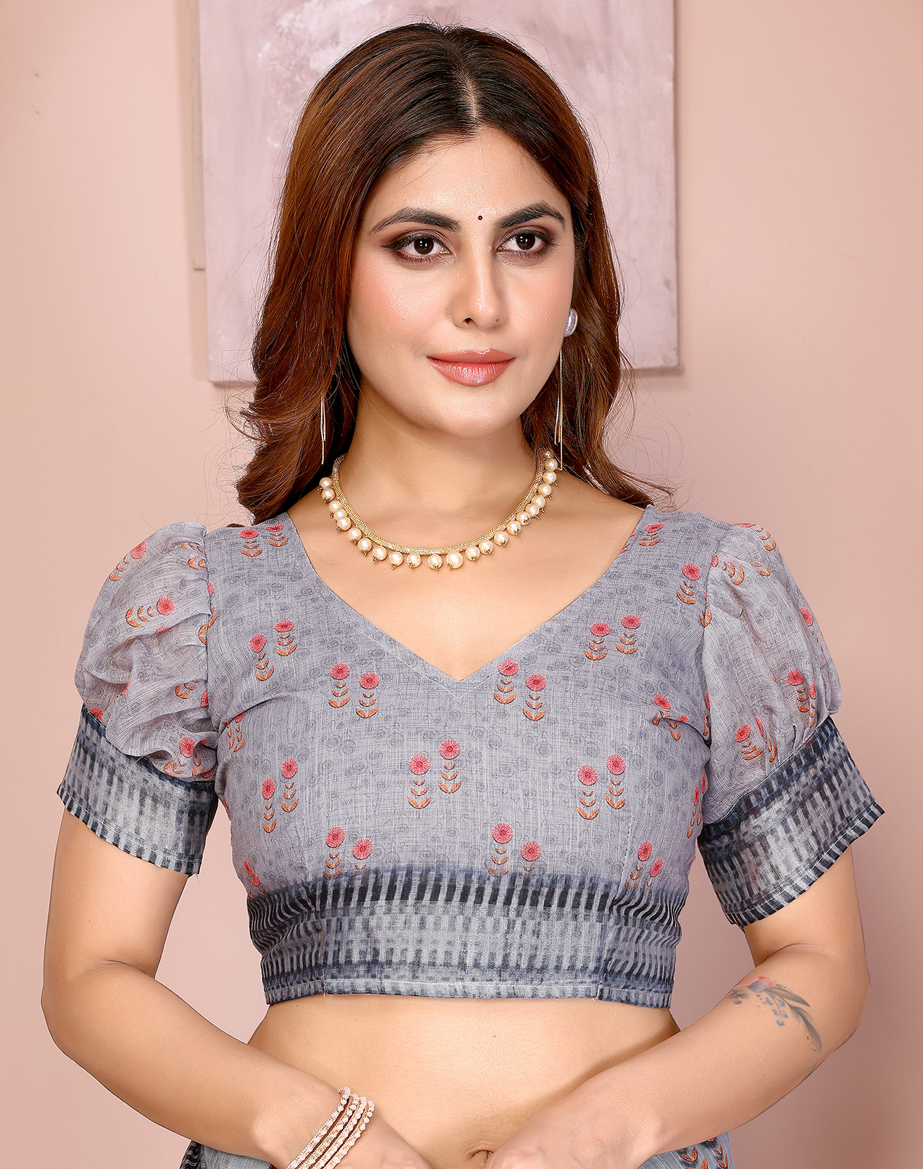 Grey Color Linen Cotton Fabric Festive Looks Printed Saree