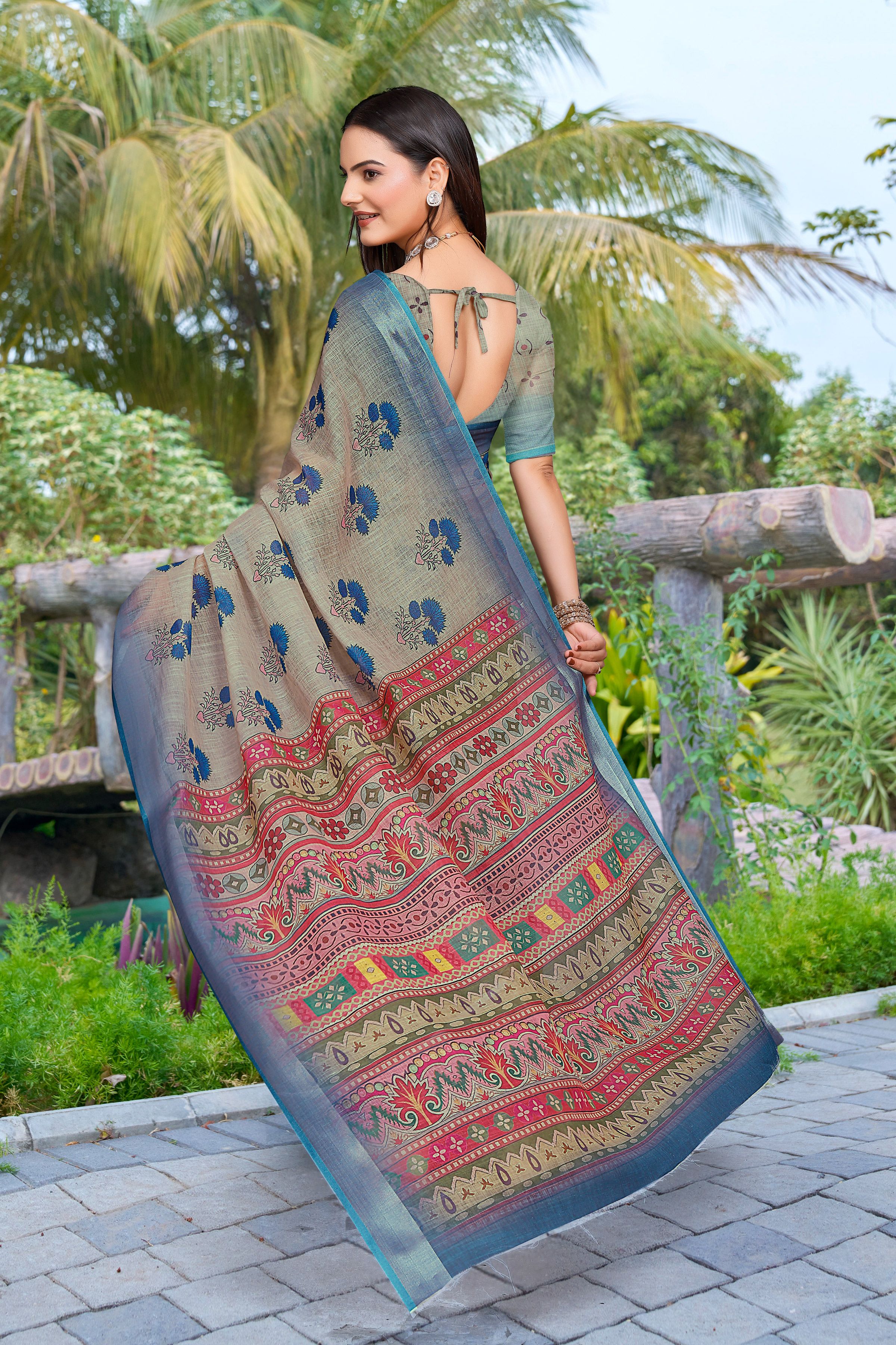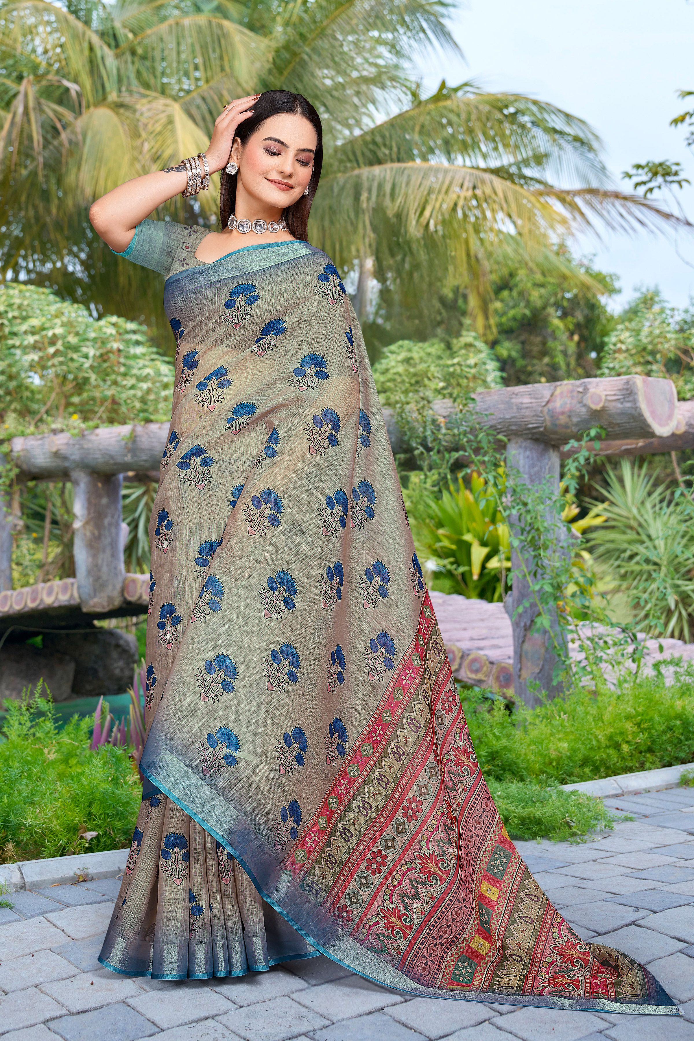 Look These Festive Saree in Fine Colored.These Saree Are Linen Cotton And Blouse is Fabricated On Linen Cotton Pair.Its Beautified With Woven Jari Border With Designer Digital Printed.