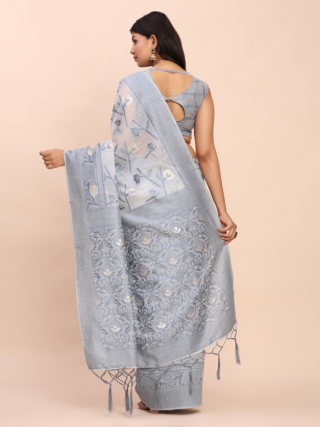 Grey Color Linen Cotton Fabric Woven Designer Saree