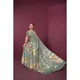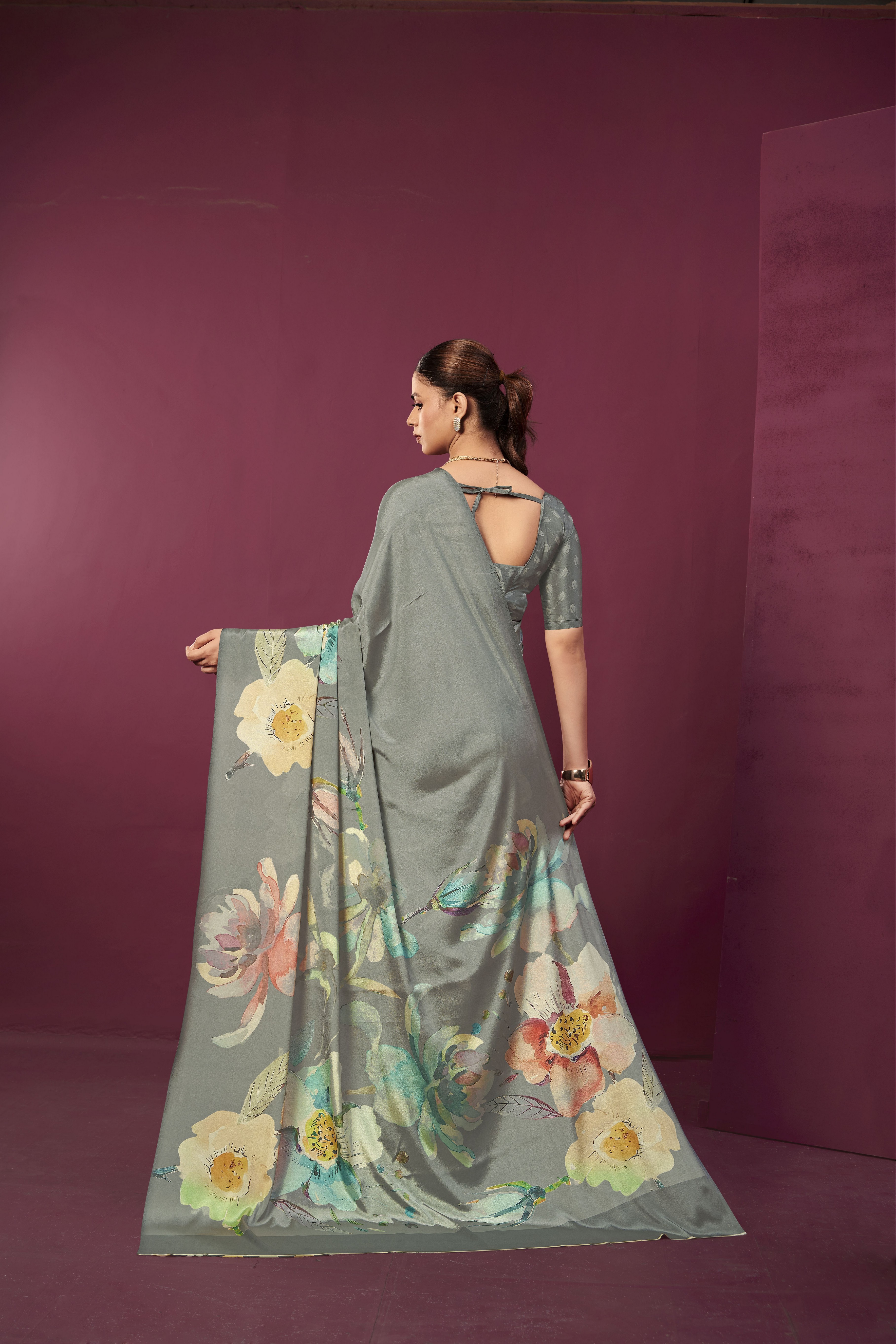 Grey Color Malai Crepe Silk Fabric Designer Digital Printed Ceremonial Partywear Saree