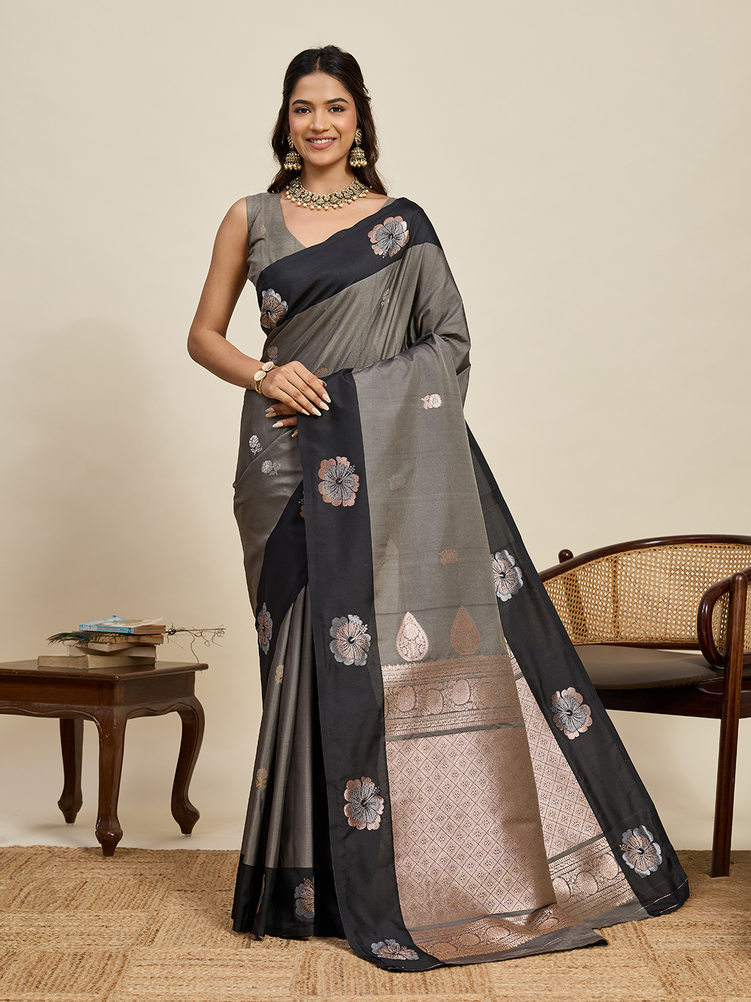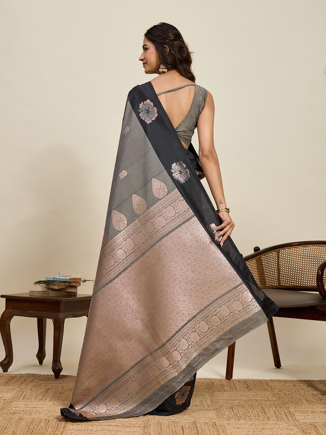 Grey Color Soft Silk Fabric Woven Jari Designer Ethnic Indian Saree