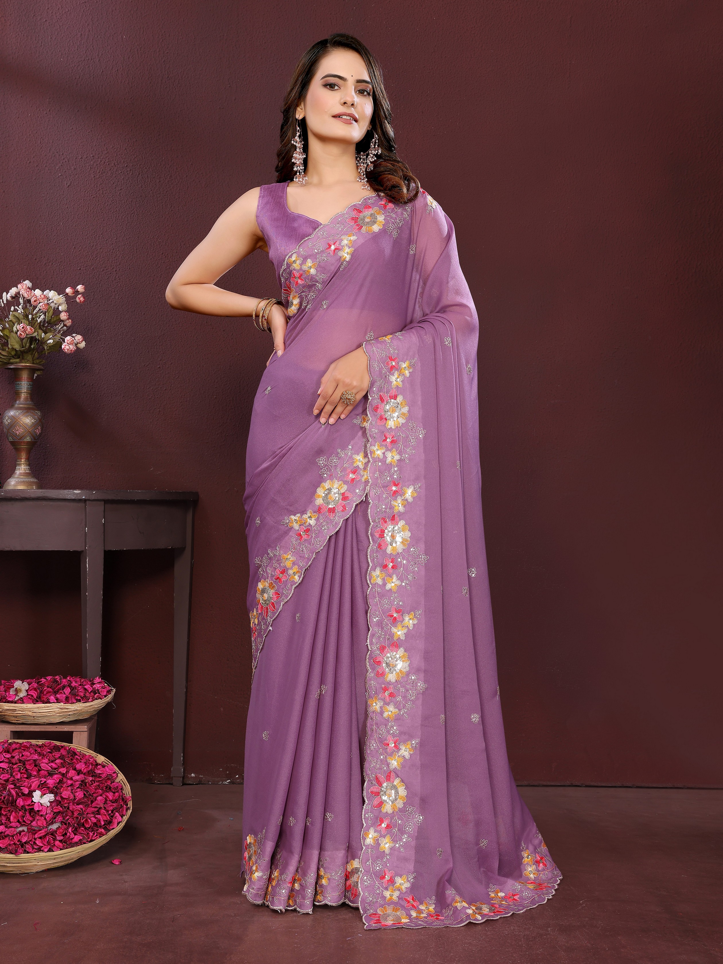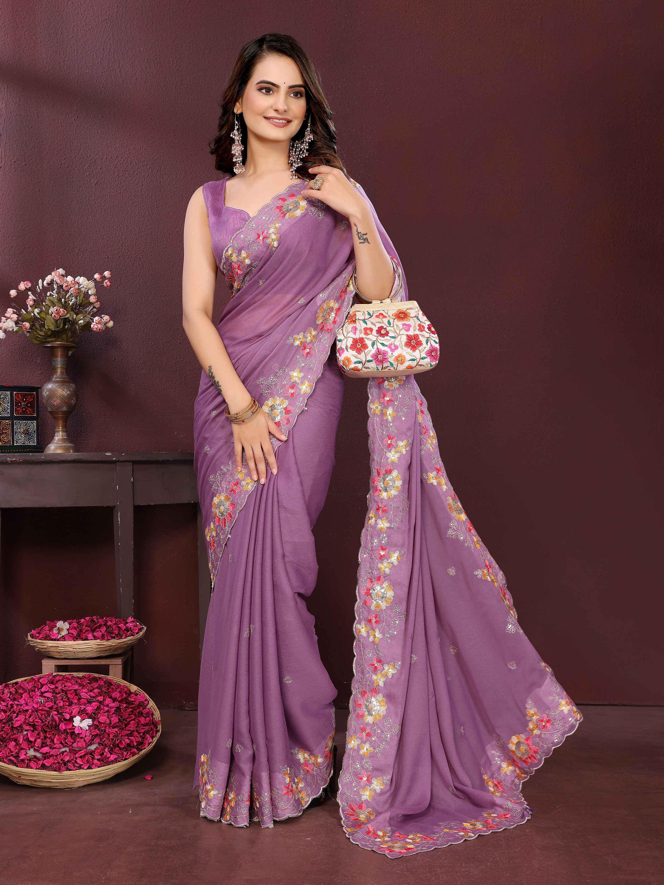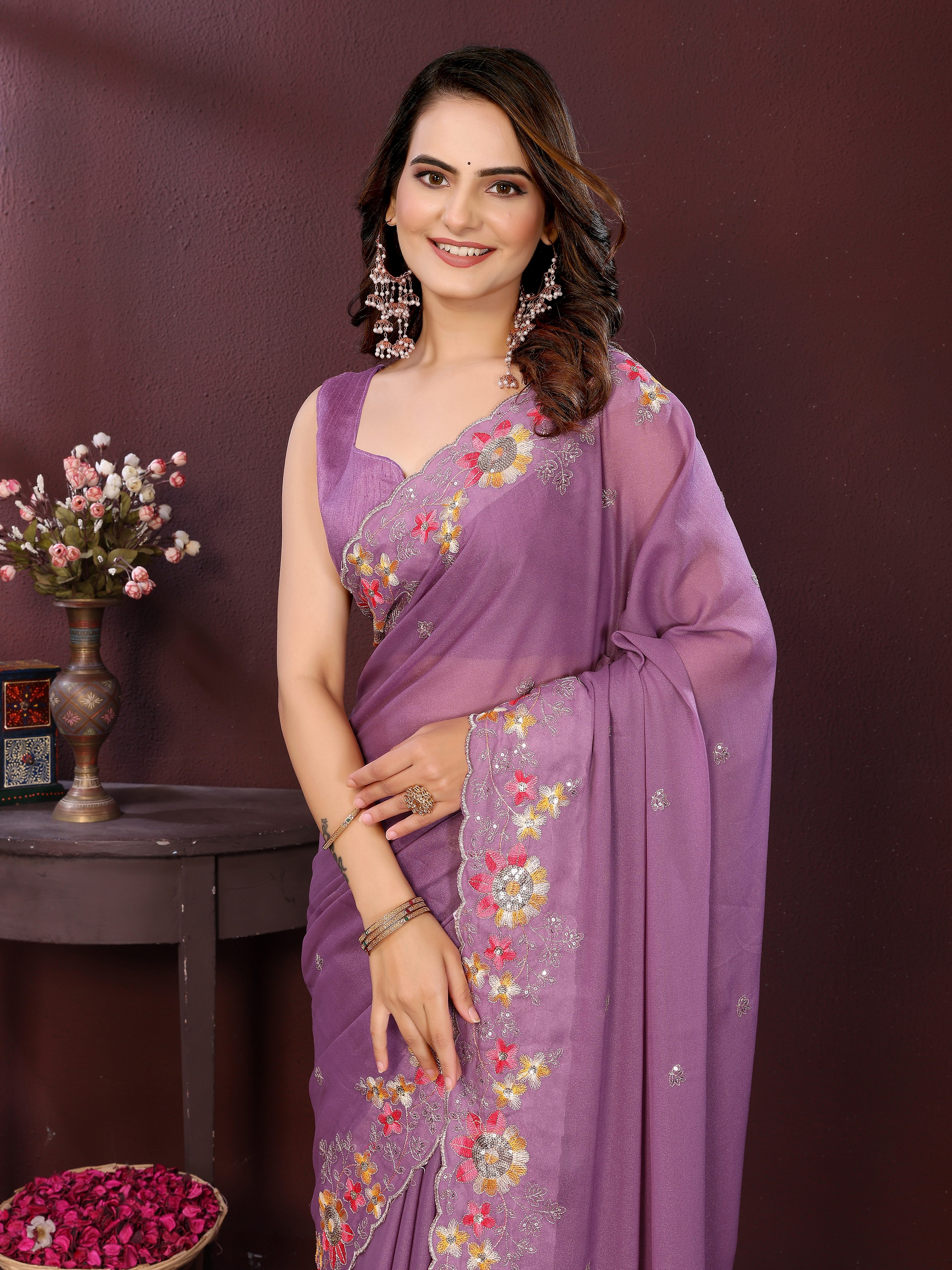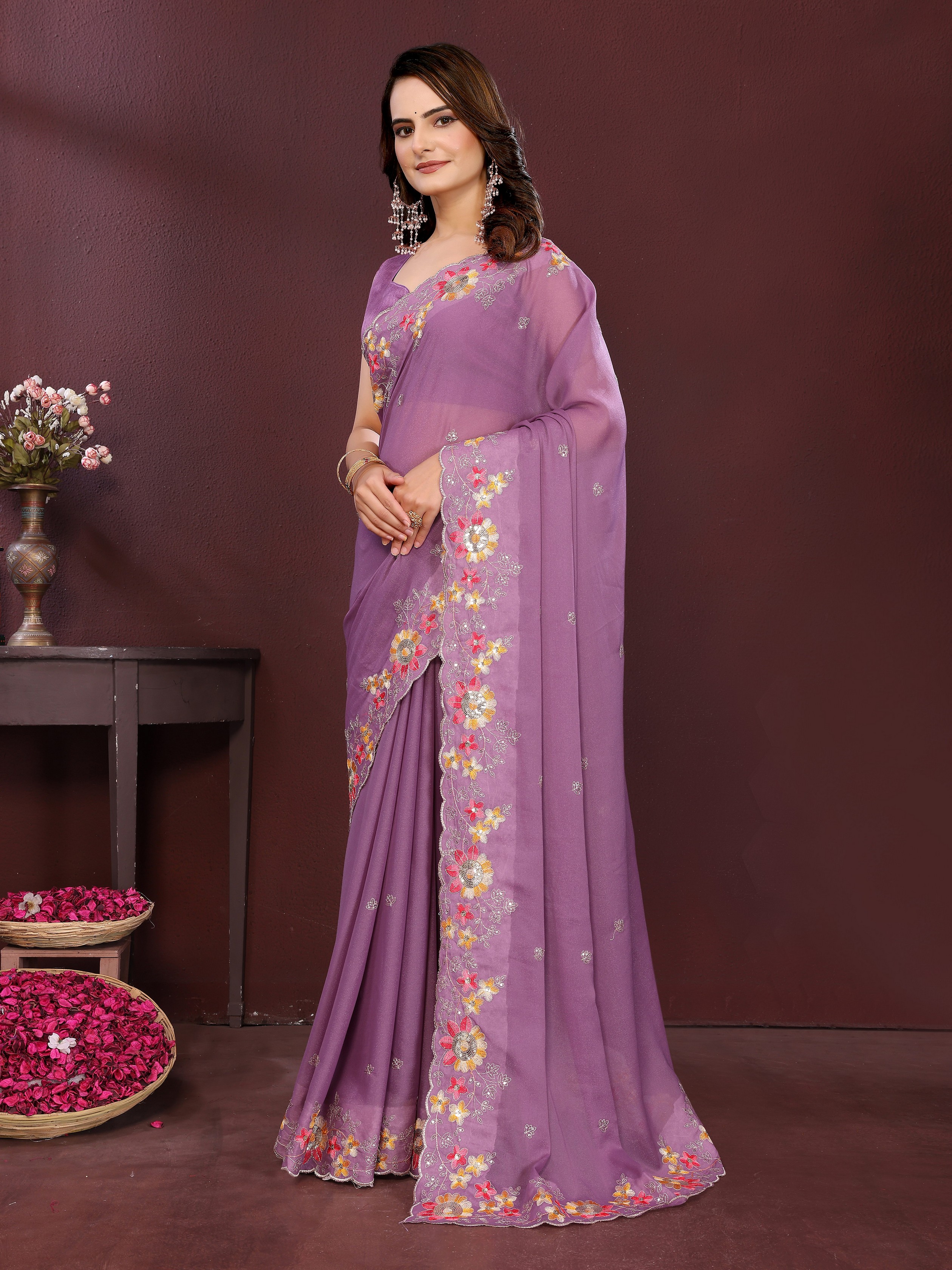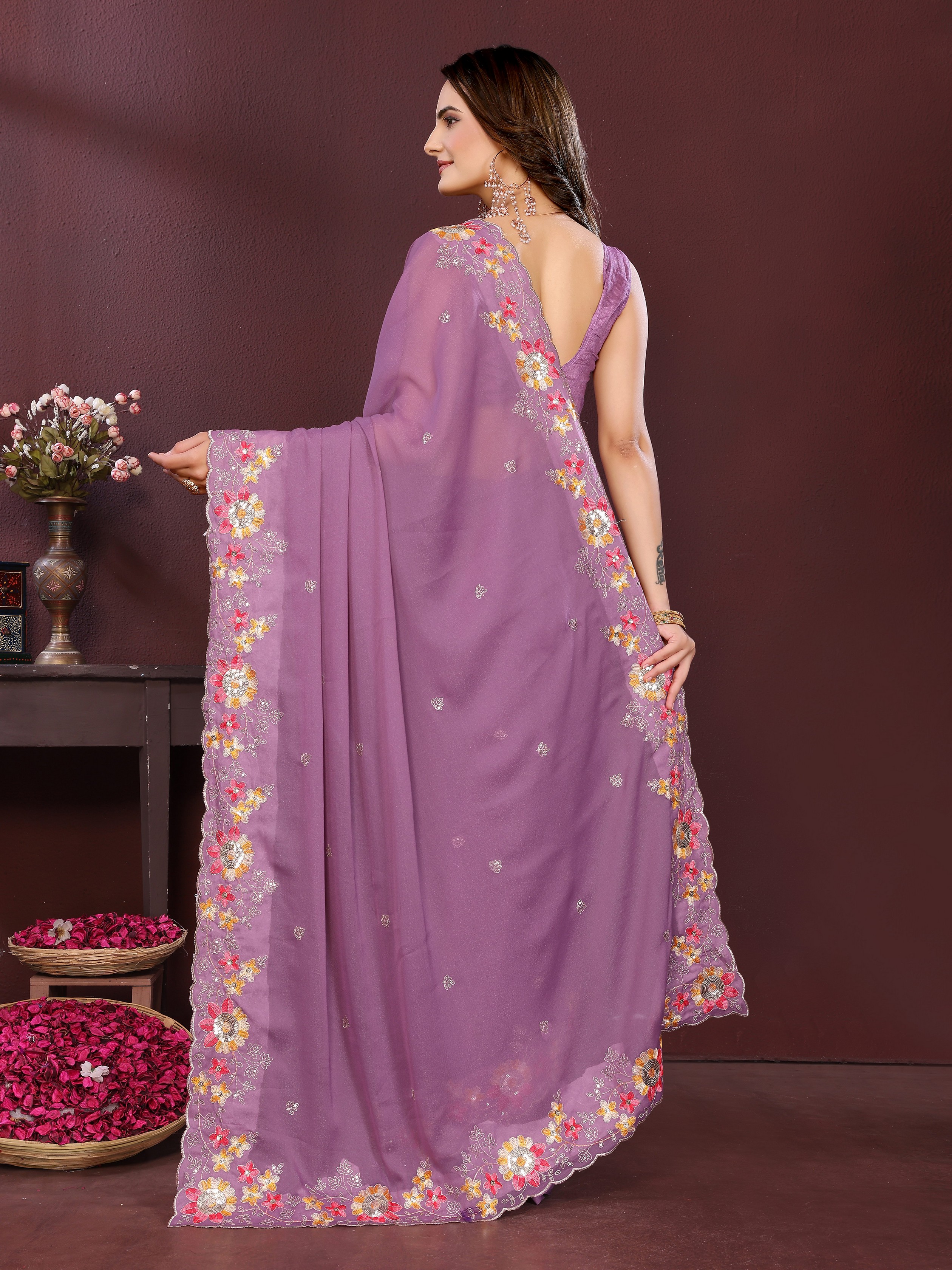 Lavender Color Star Georgette fabric Designer Embroidery Work Ethnic Partywear Saree