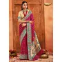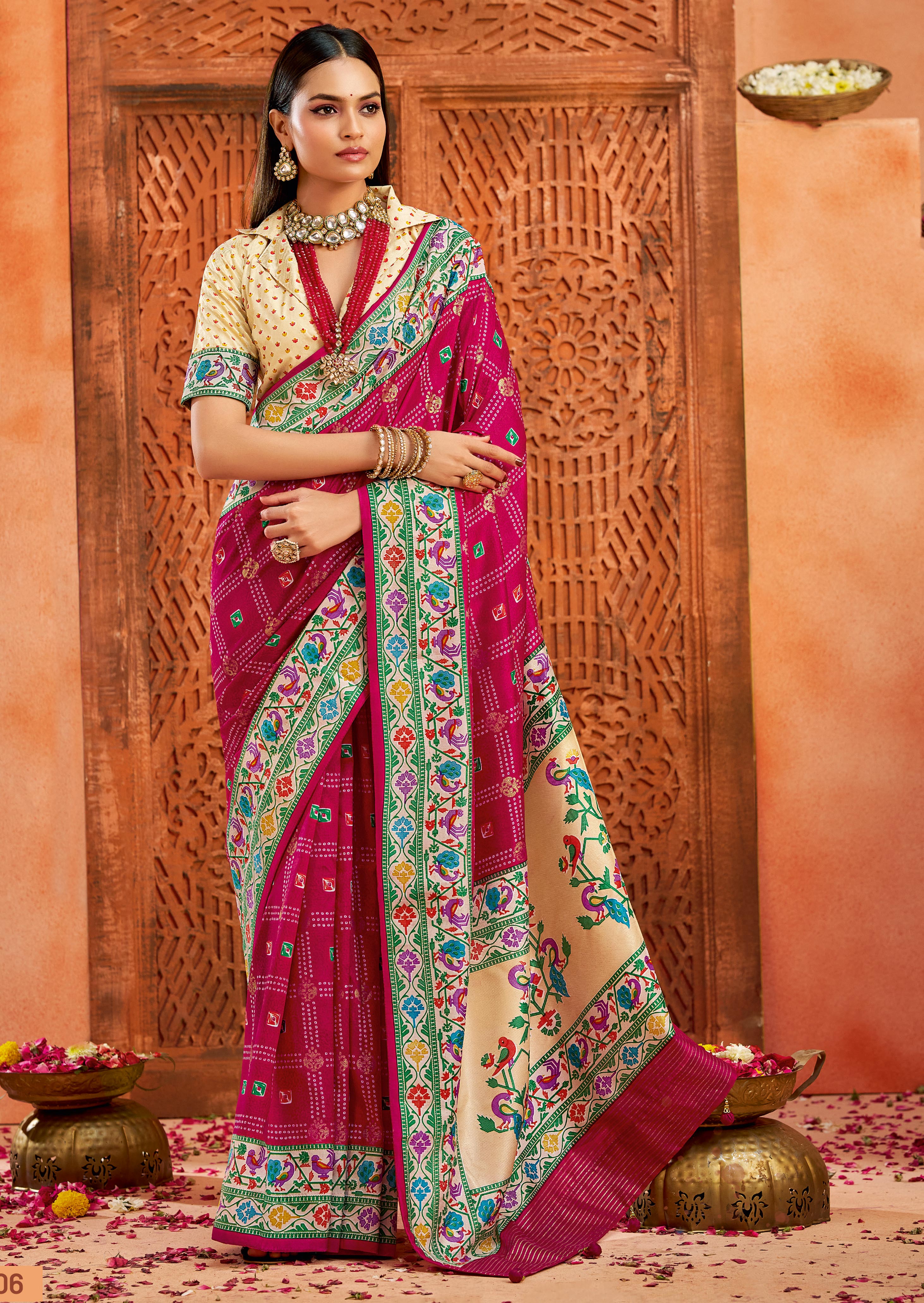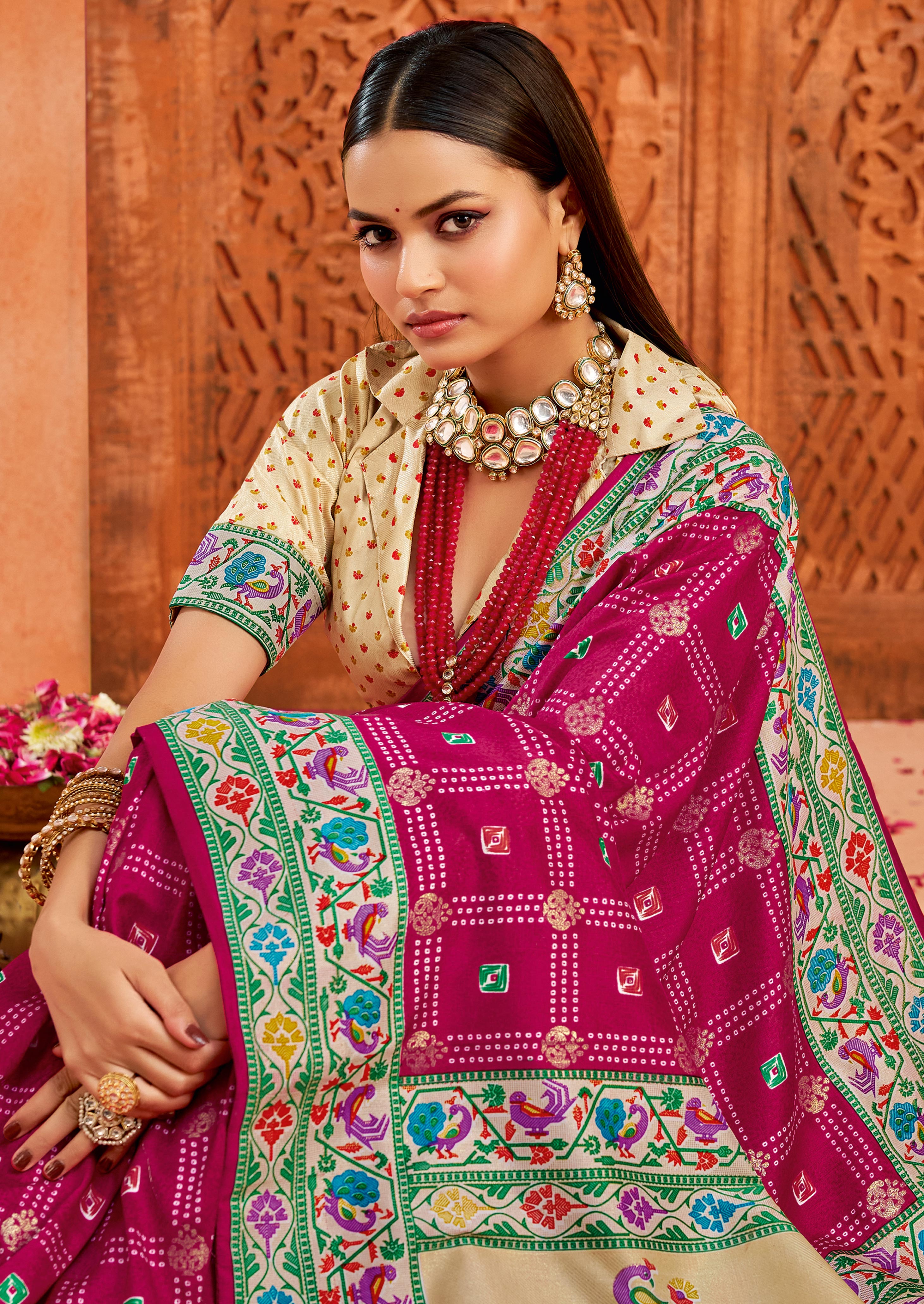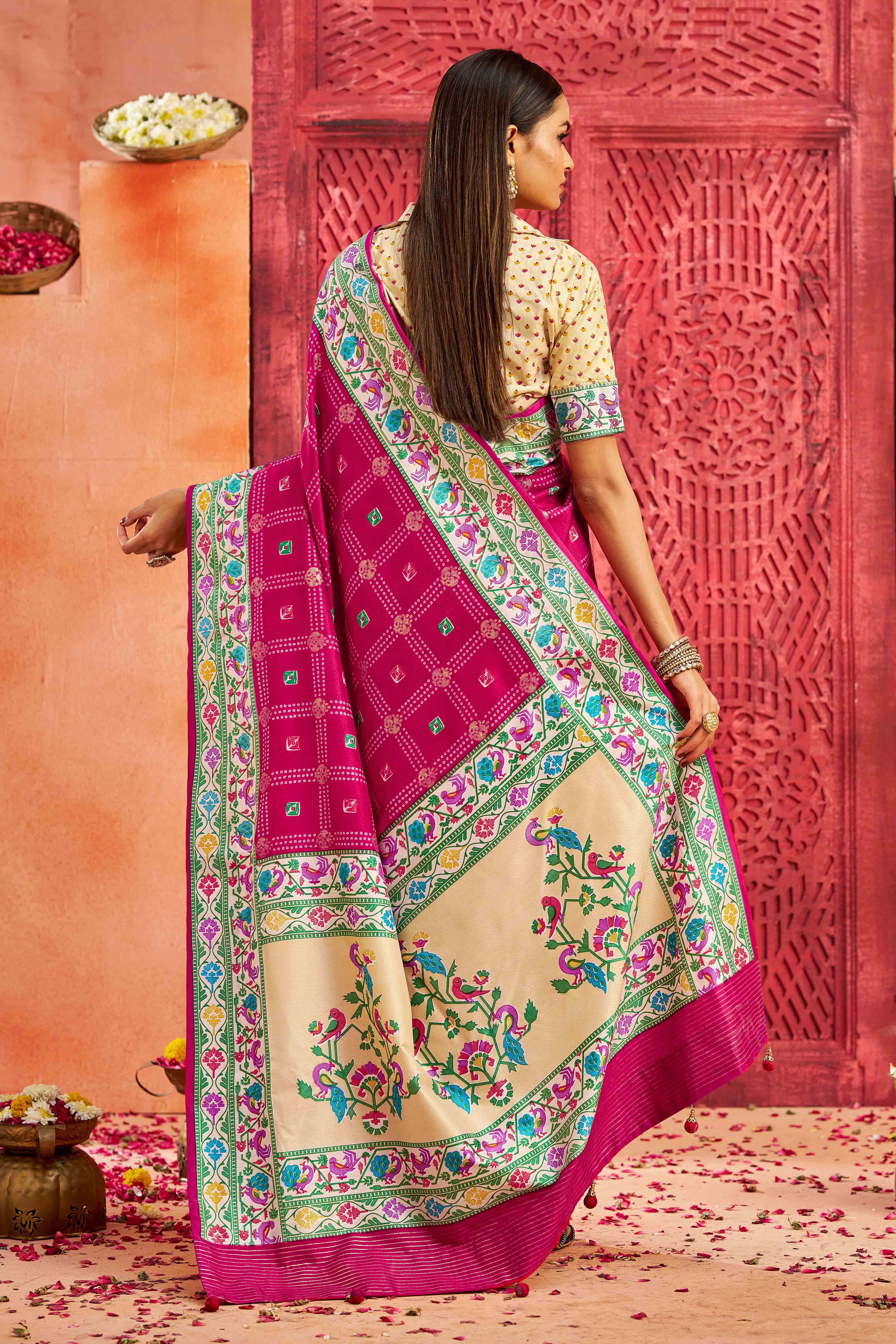 Magenta Rose Color Velvet Tussar Silk Fabric Partywear Saree With Paithani Pallu And Traditional Ghatchola Print