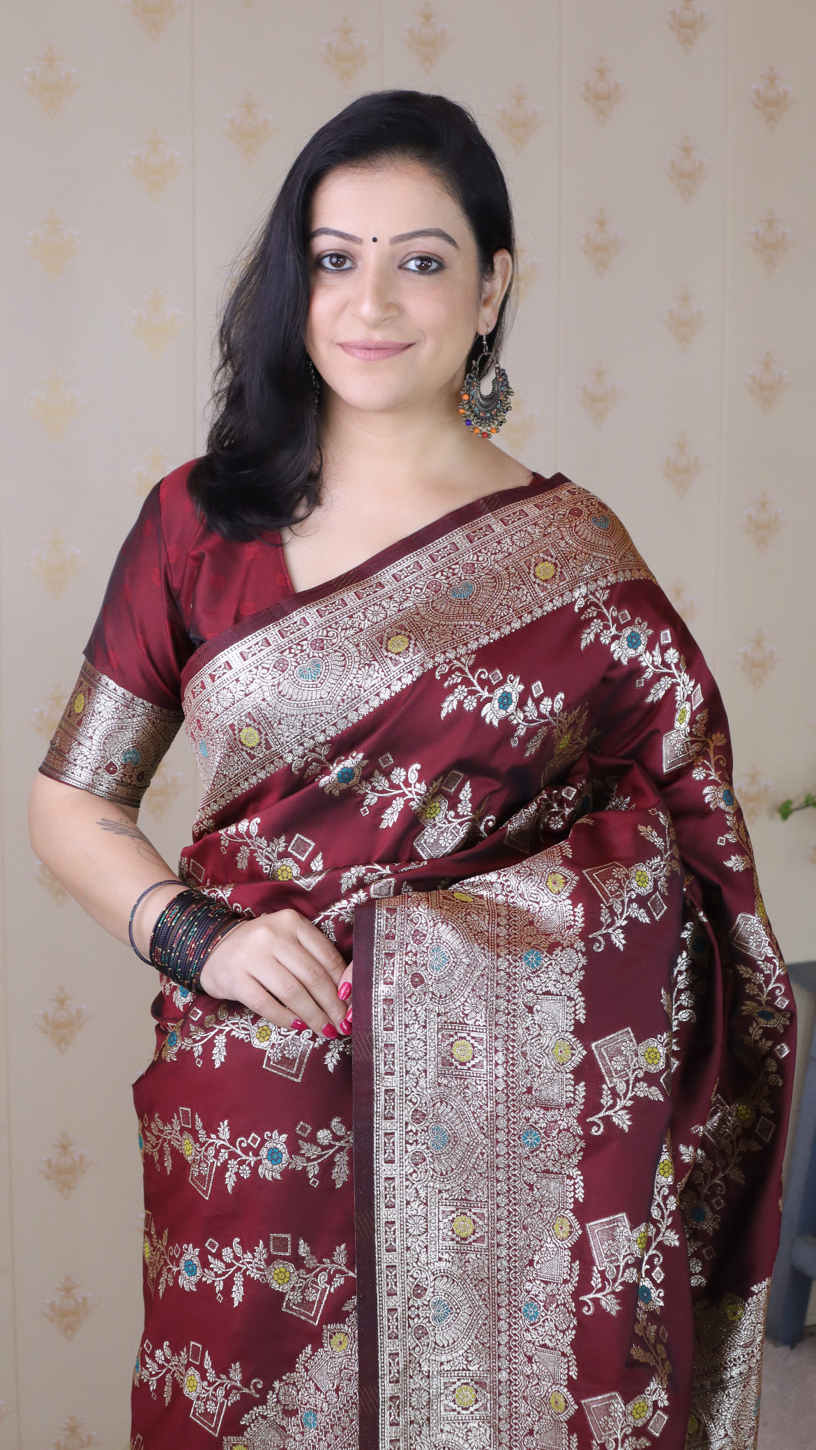 Maroon Color Woven Silver Jari Designer Banarasi Silk Ceremonial Saree