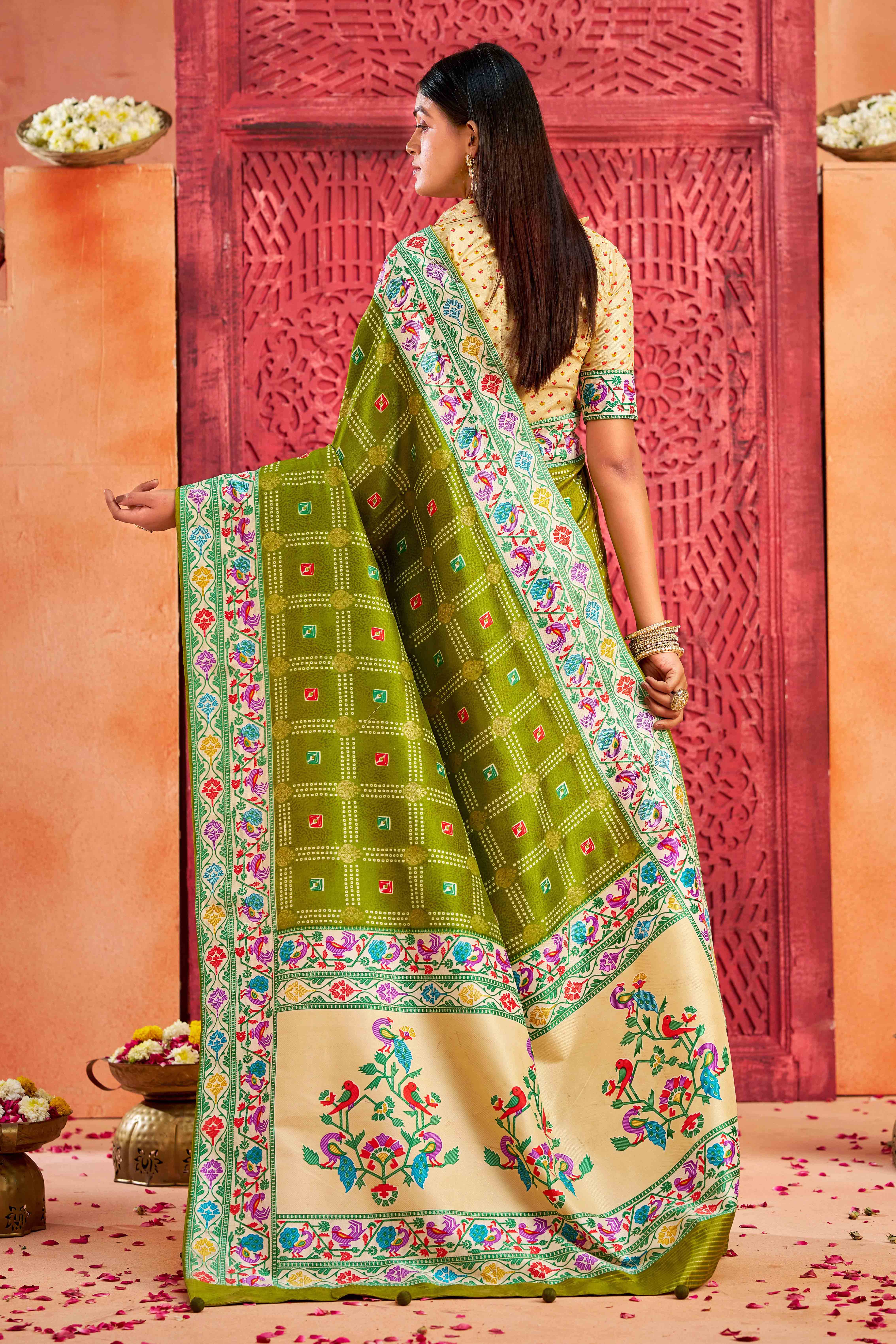 Mehandi Color Velvet Tussar Silk Fabric Partywear Saree With Paithani Pallu And Traditional Ghatchola Print