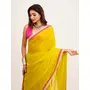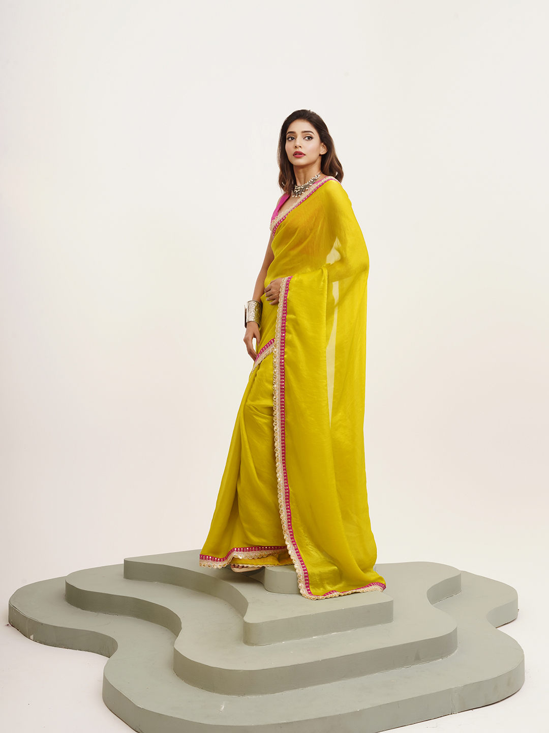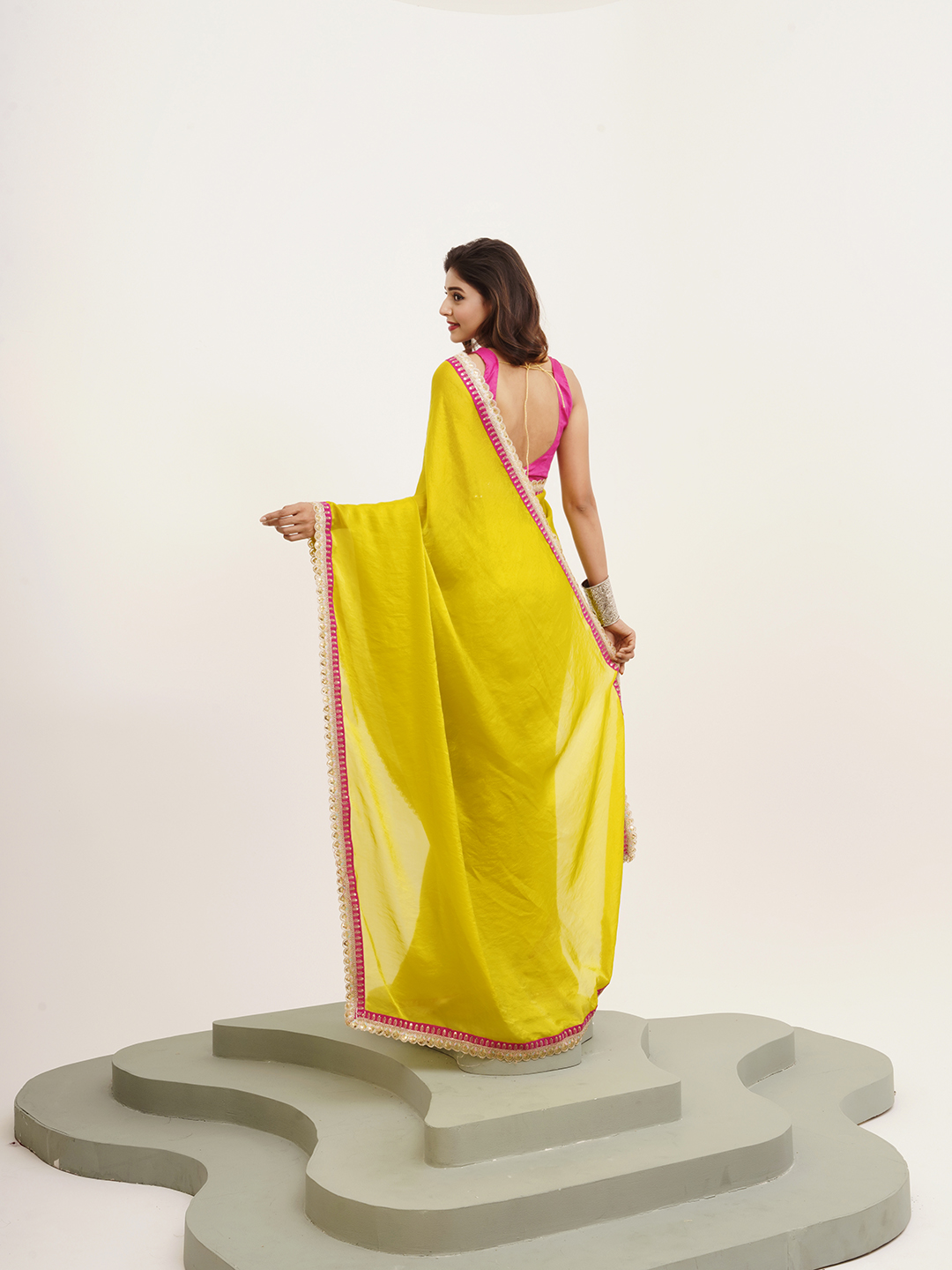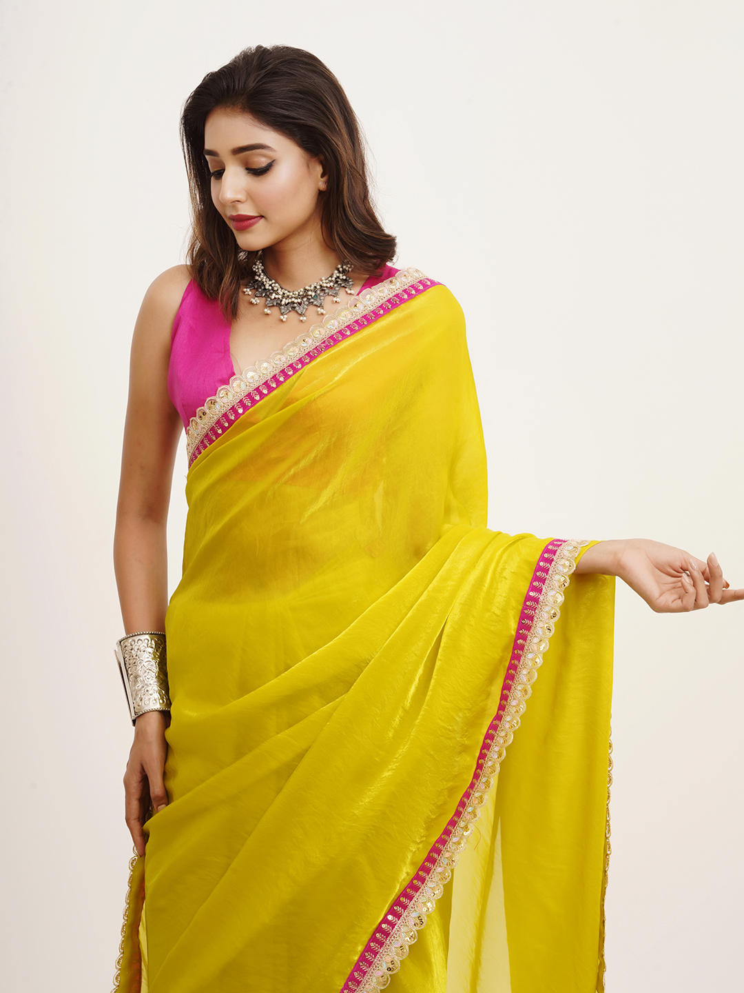 Metallic Yellow Color Beautiful Partywear Embellished Sequinned Satin Saree