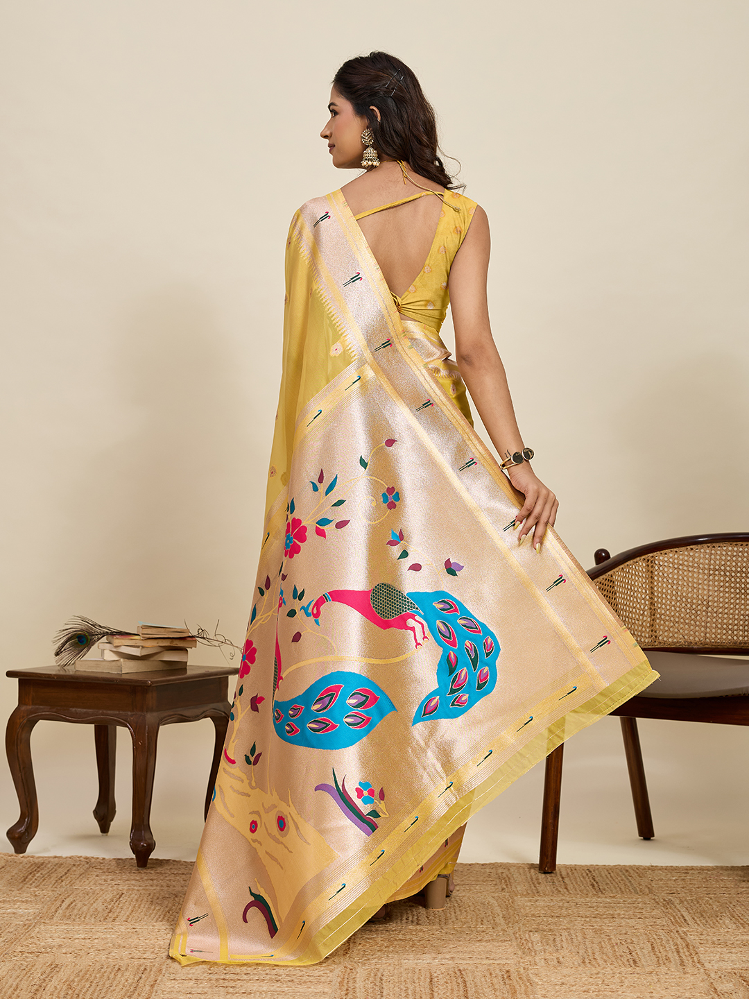 Garb This Party Wear Saree Paired With Blouse.This Saree And Blouse Are Cotton Silk Fabric With Woven Paithani Meenakari Designer. Buy This Pretty Saree Now.