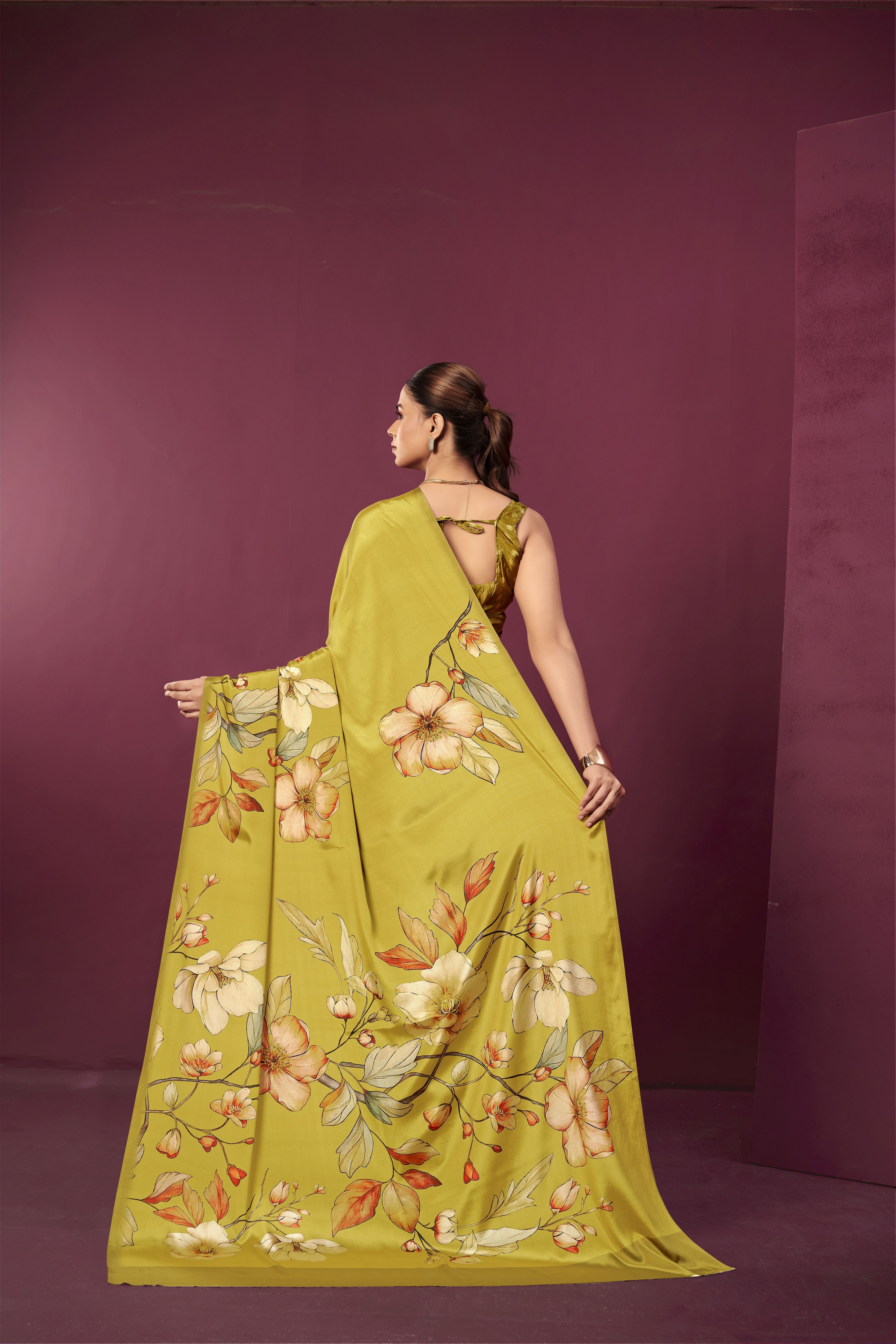 Mustard Color Malai Crepe Silk Fabric Designer Digital Printed Ceremonial Partywear Saree
