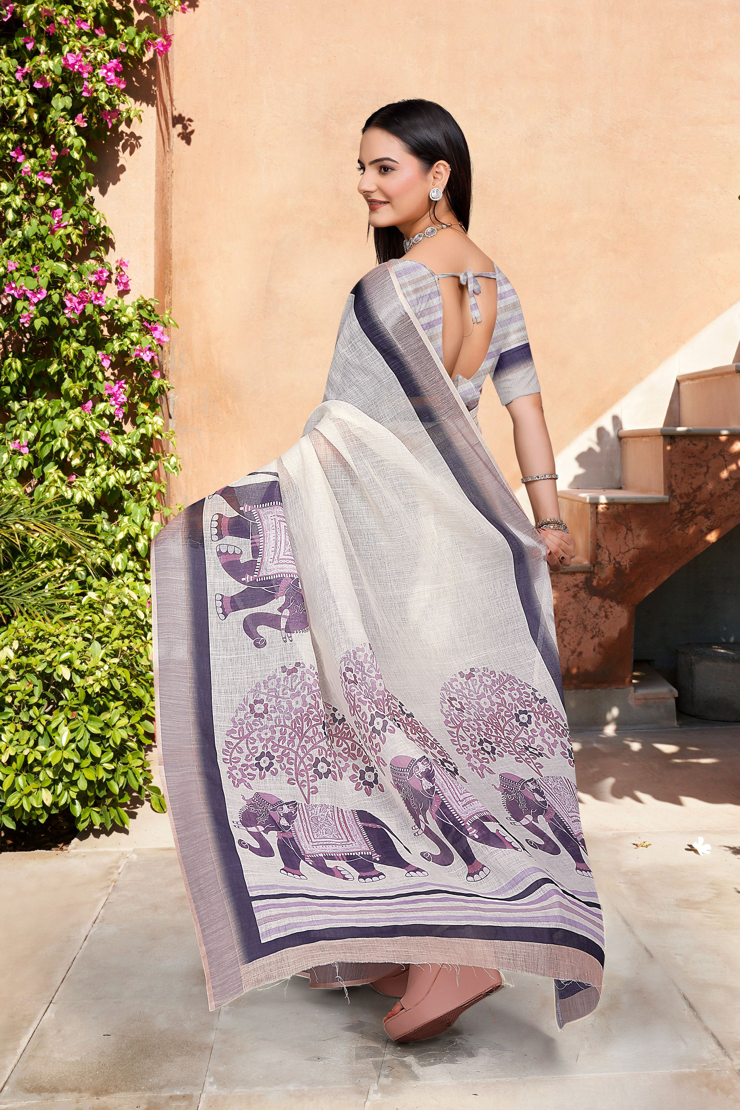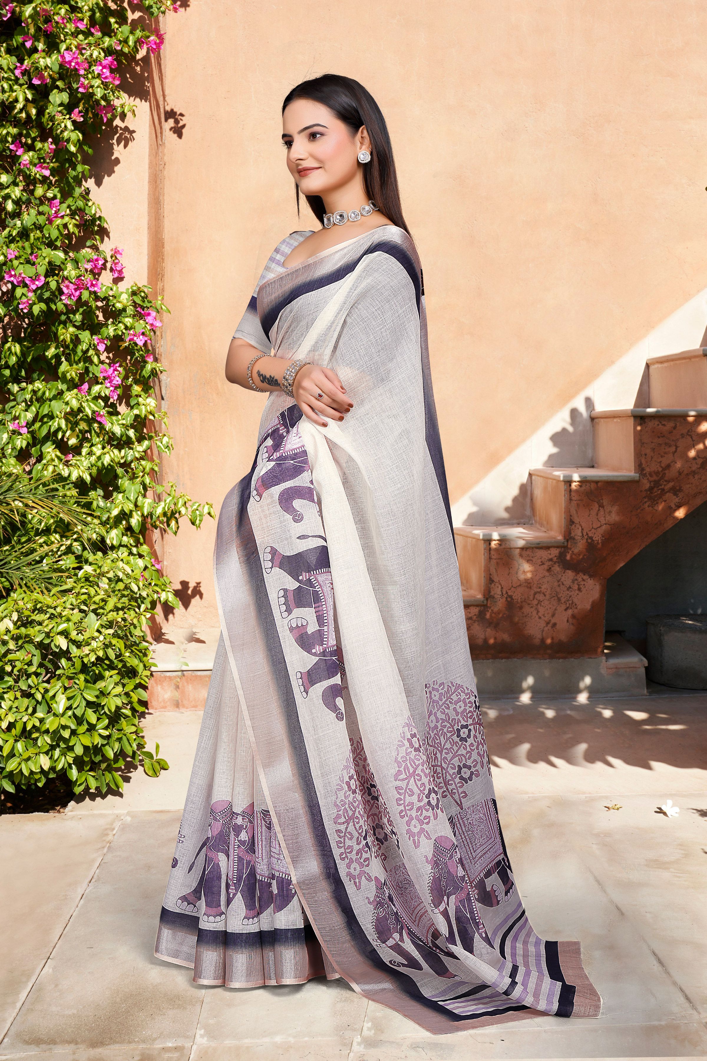 Look These Festive Saree in Fine Colored.These Saree Are Linen Cotton And Blouse is Fabricated On Linen Cotton Pair.Its Beautified With Woven Jari Border With Designer Digital Printed.