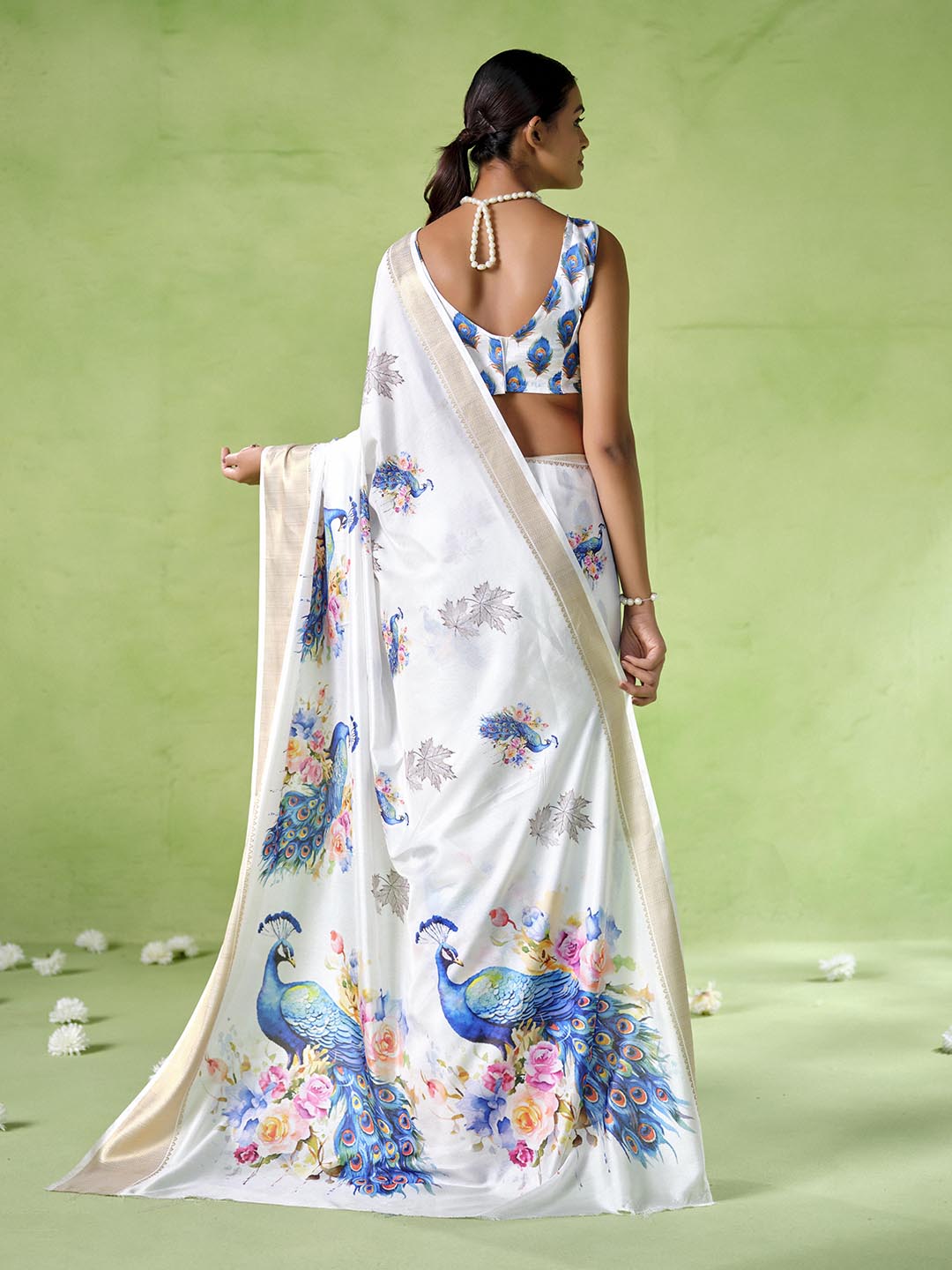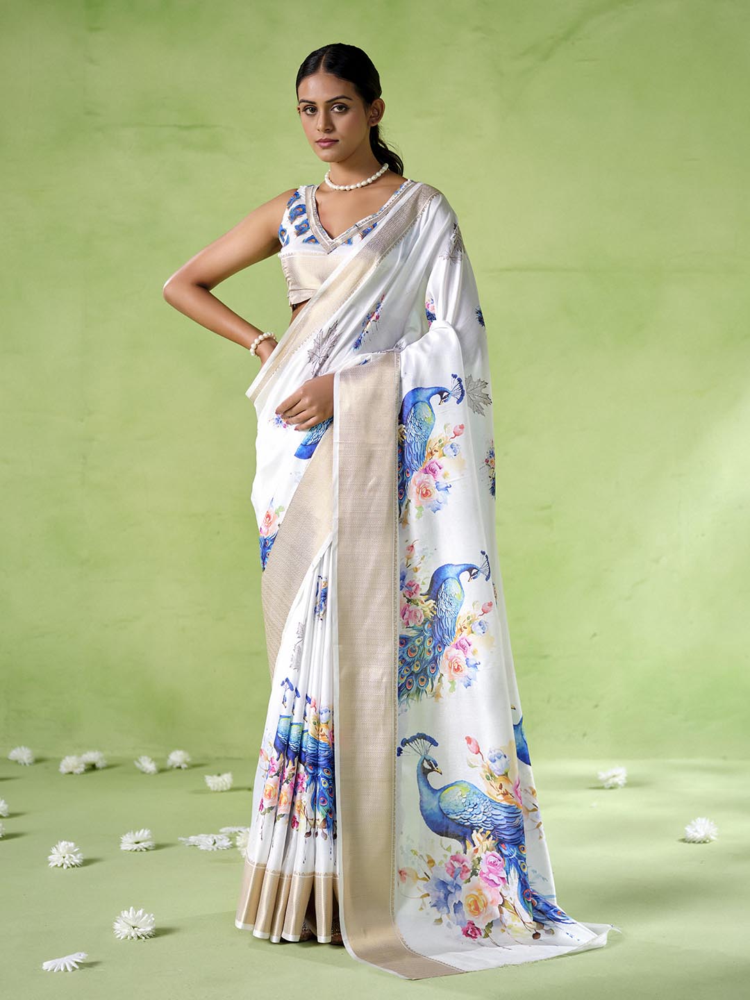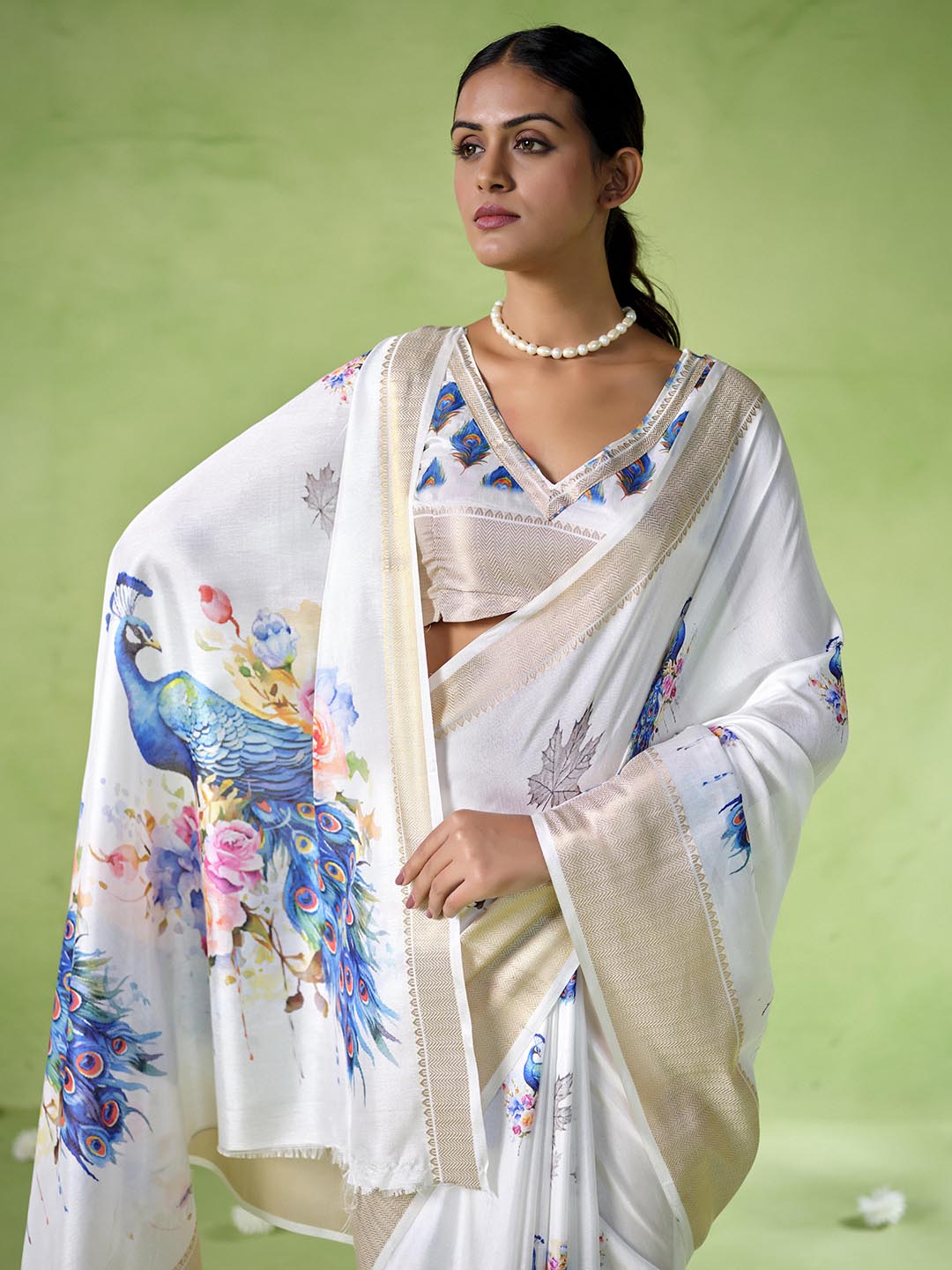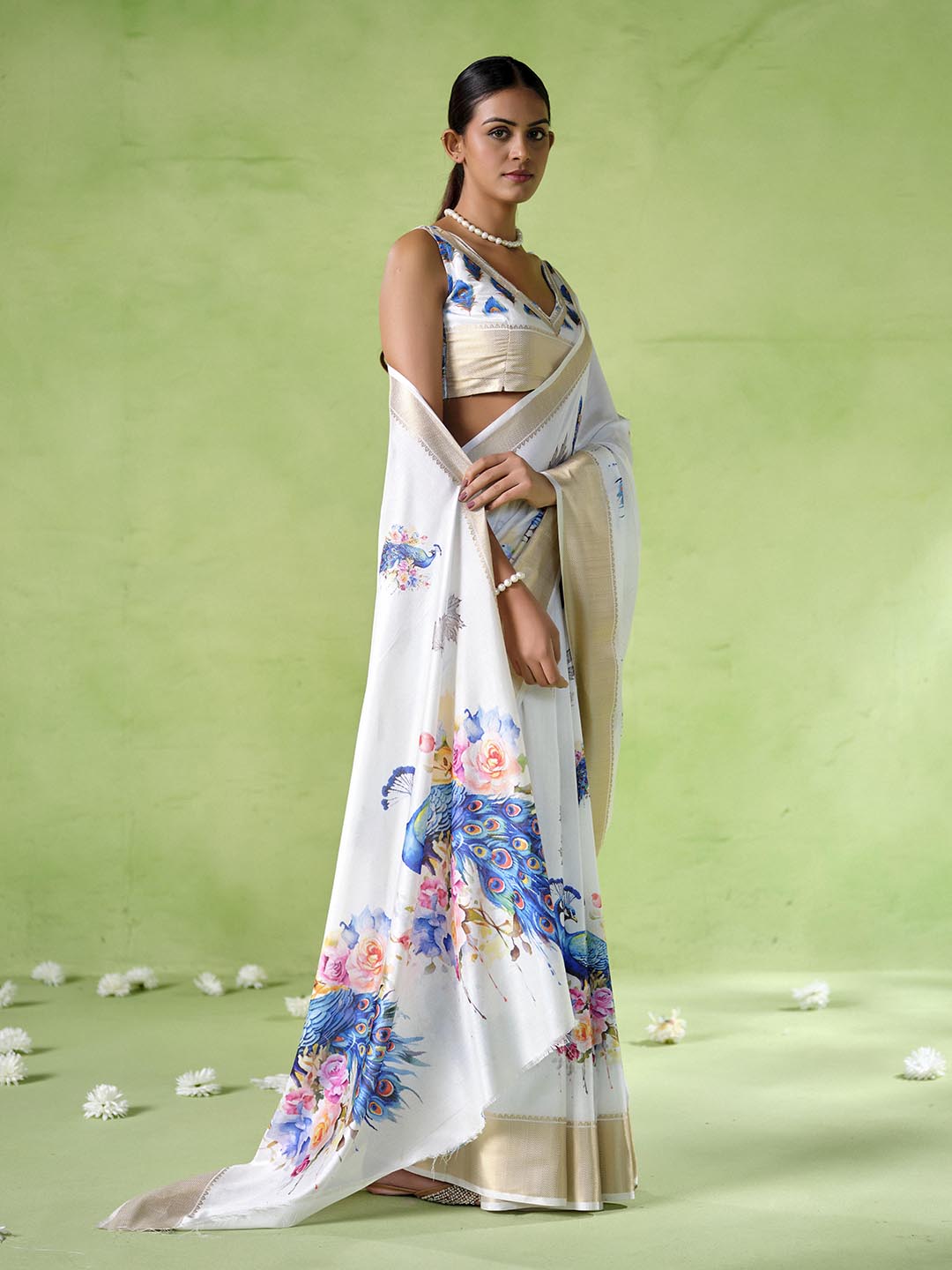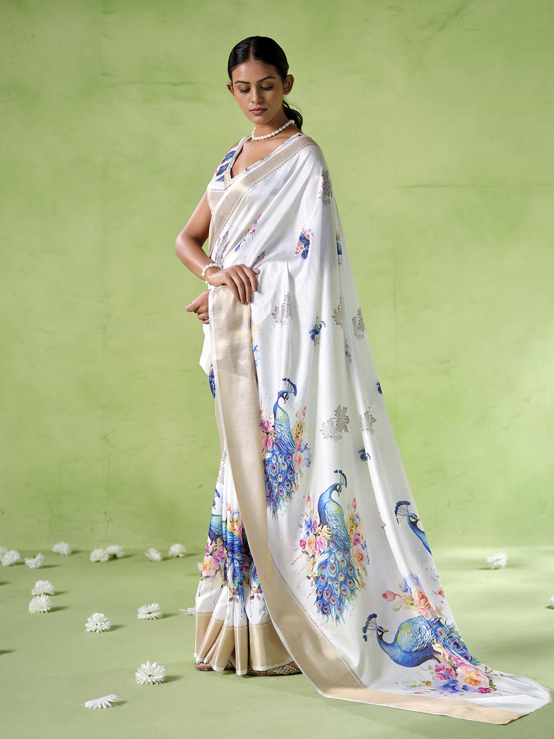 Off White Color Silk Blend Girlie Designer Printed Saree For Rich Sophisticated Looks