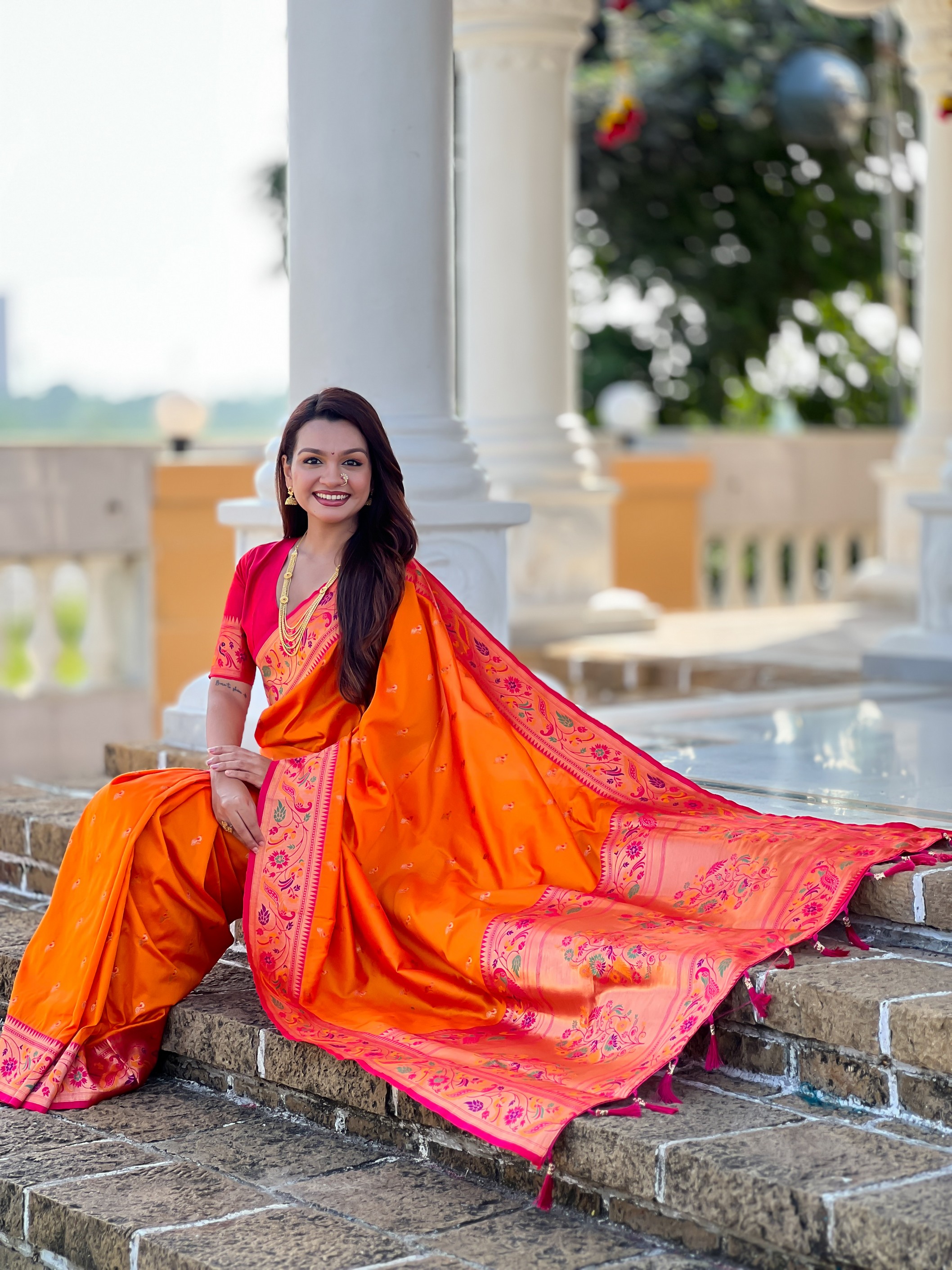 Orange Color Paithani Silk Fabric Woven Meenakari Jacquard Designer Saree