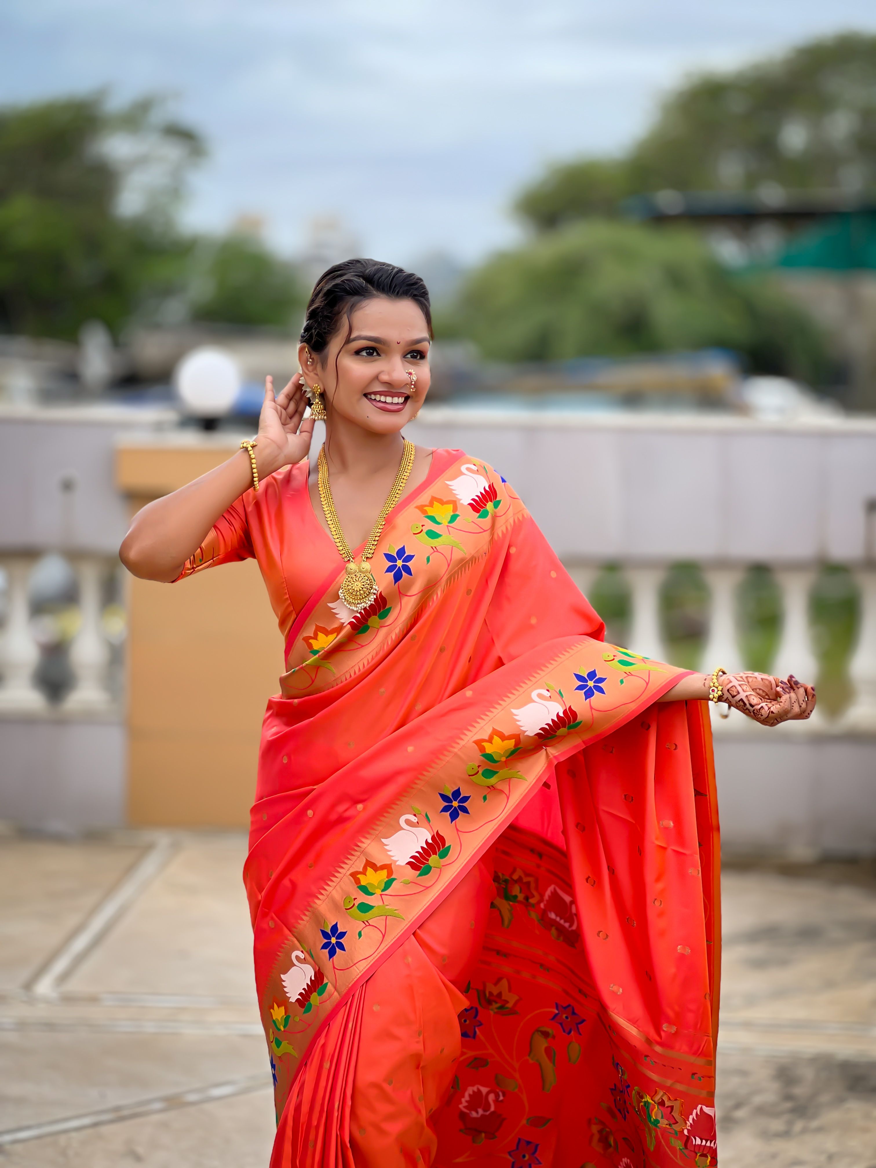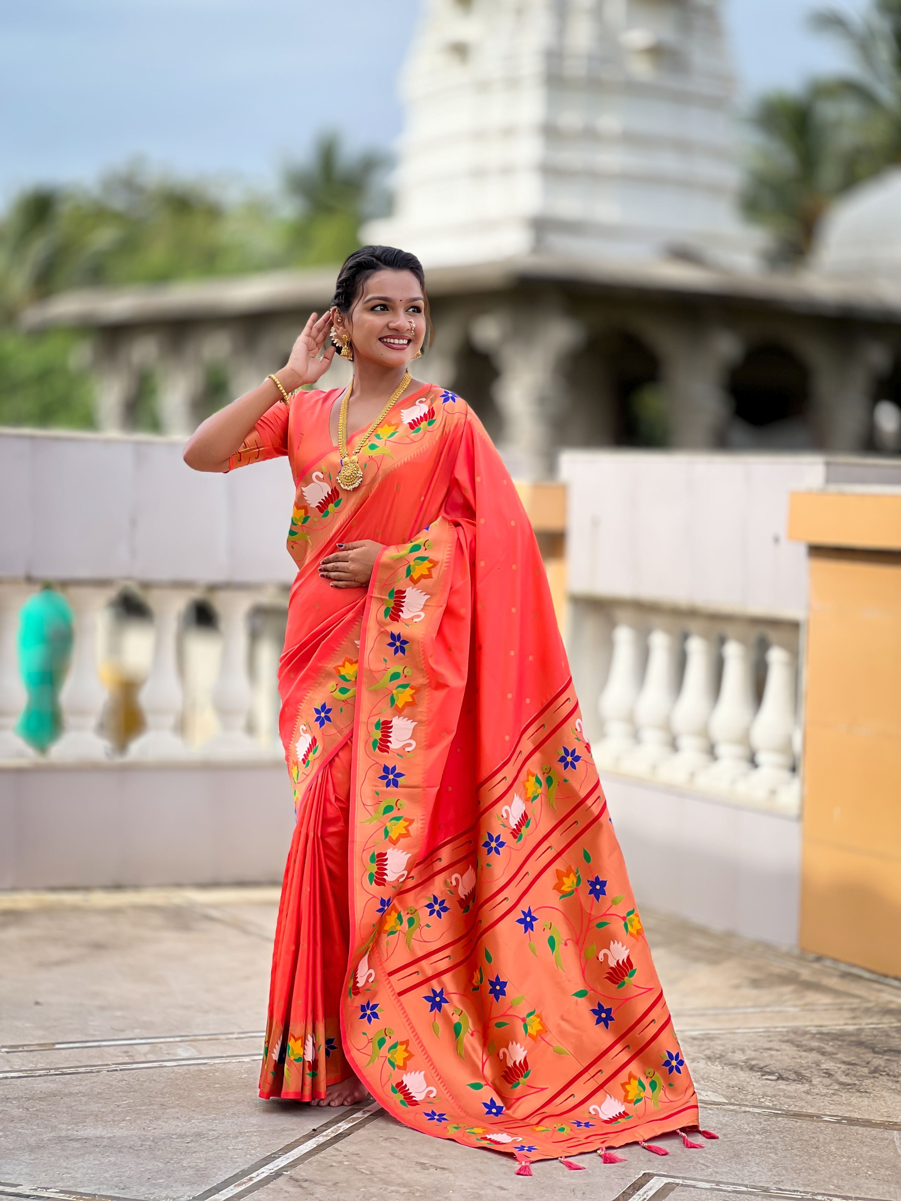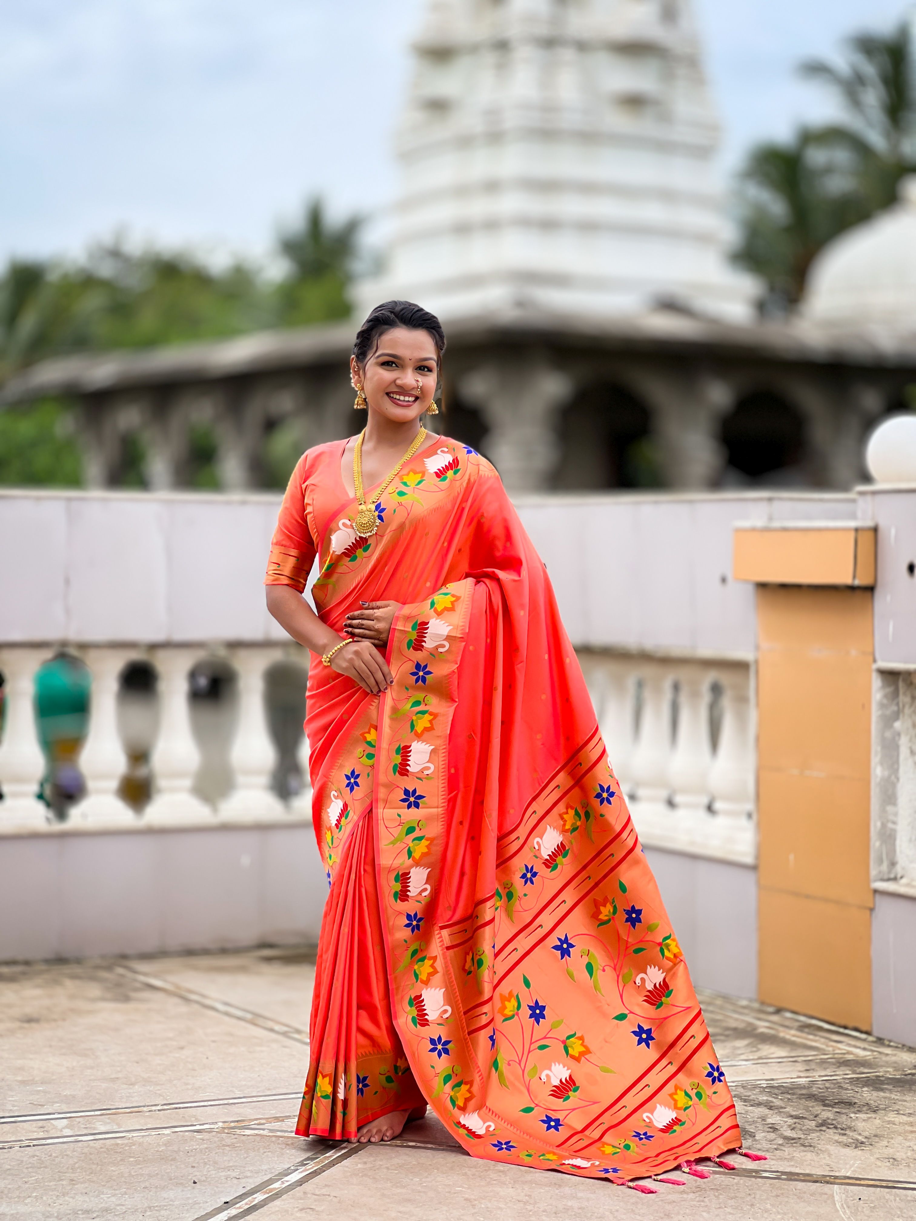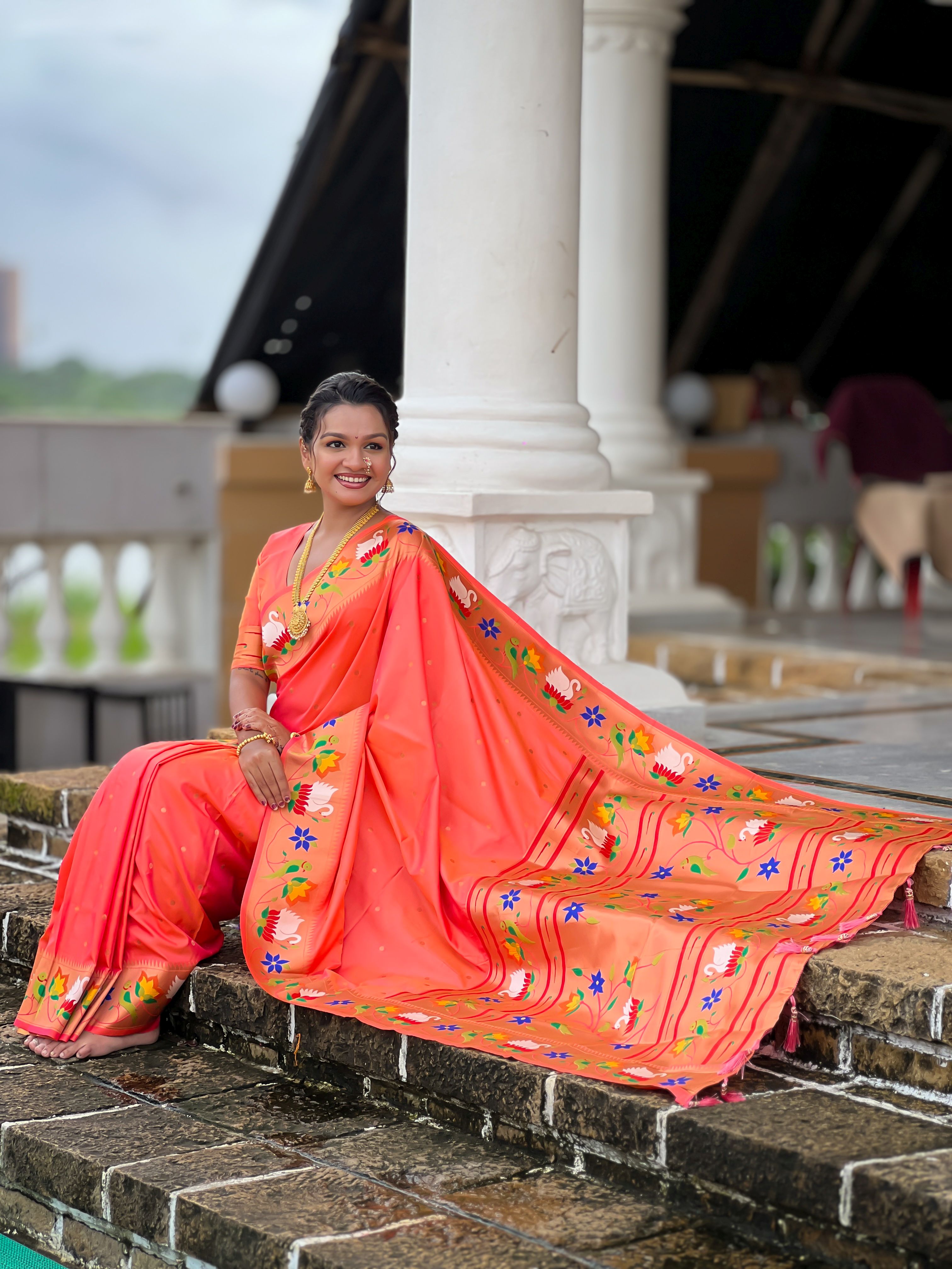 Orange Color Paithani Silk Woven Meenakari Jacquard Designer Heavy Wedding Special Saree