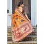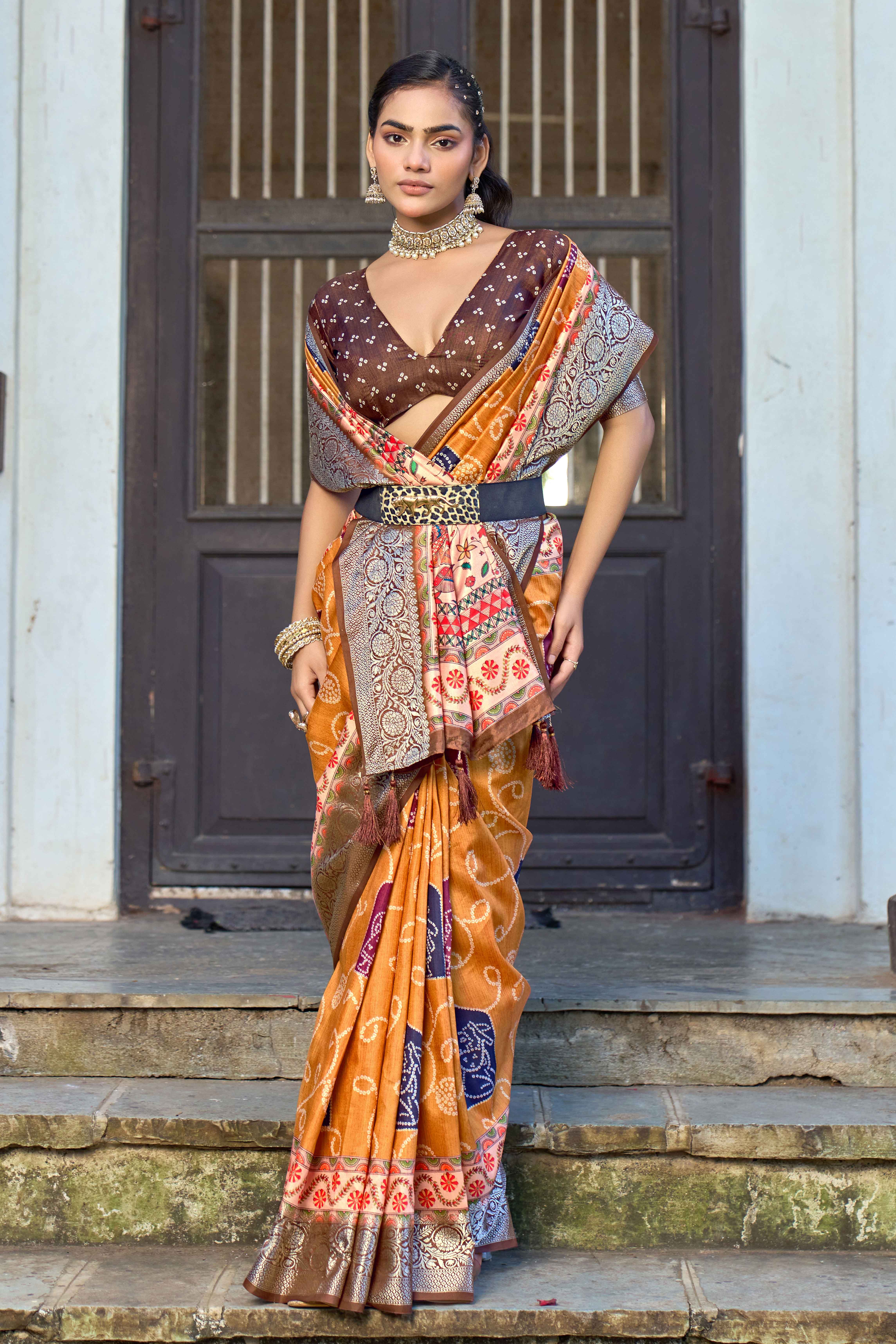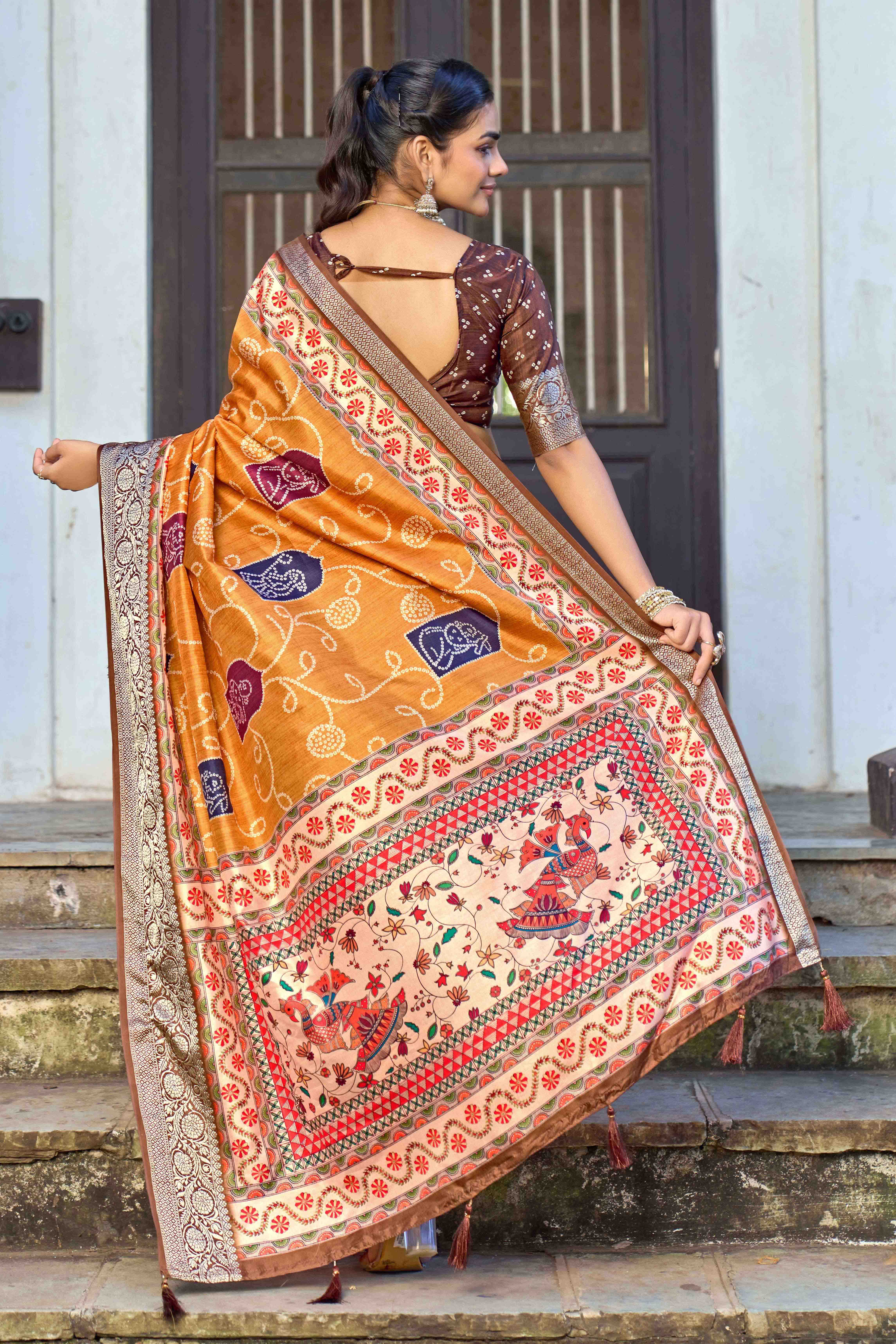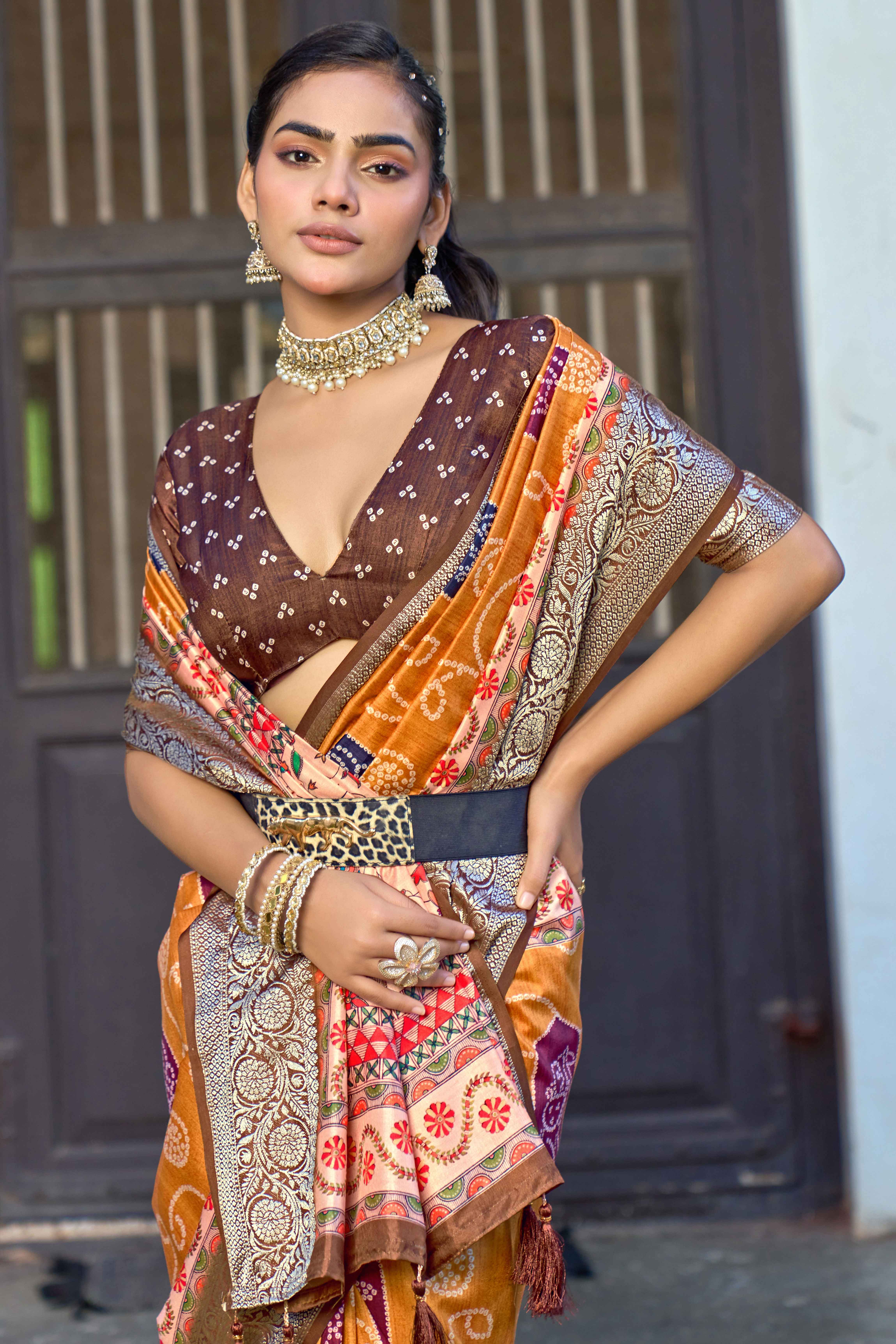 Orange Color Silk Blended Traditional Bandhani Ajrakh Printed Saree