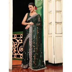 Green Color Embroidery Work Organza...