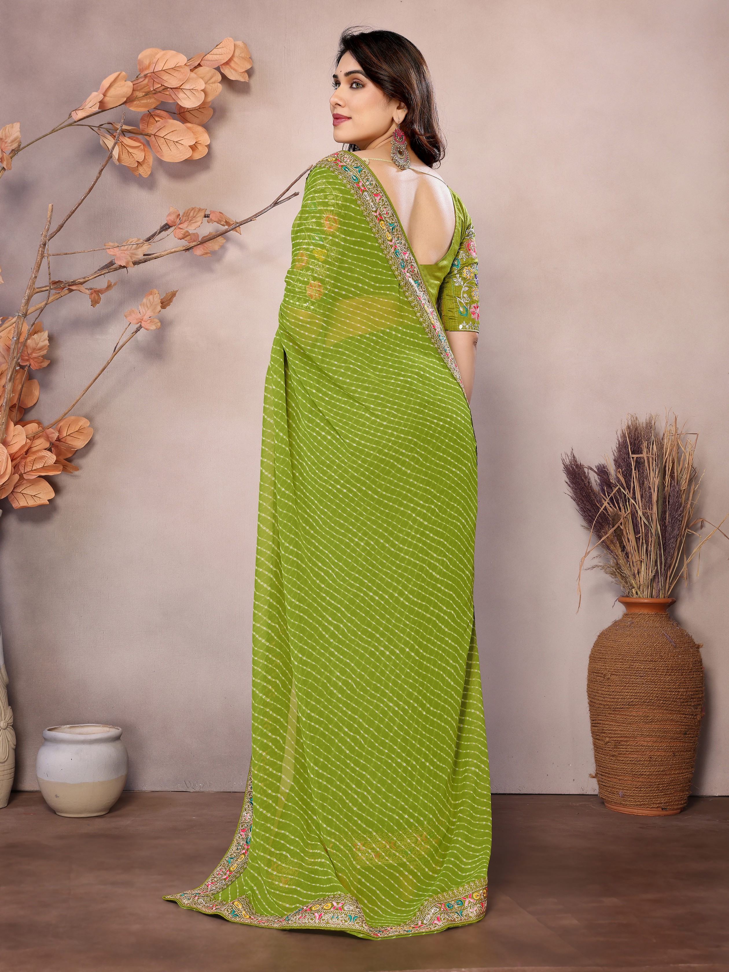 Parrot Green Color Georgette Fabric Designer Embroidered Traditional Leheria Saree