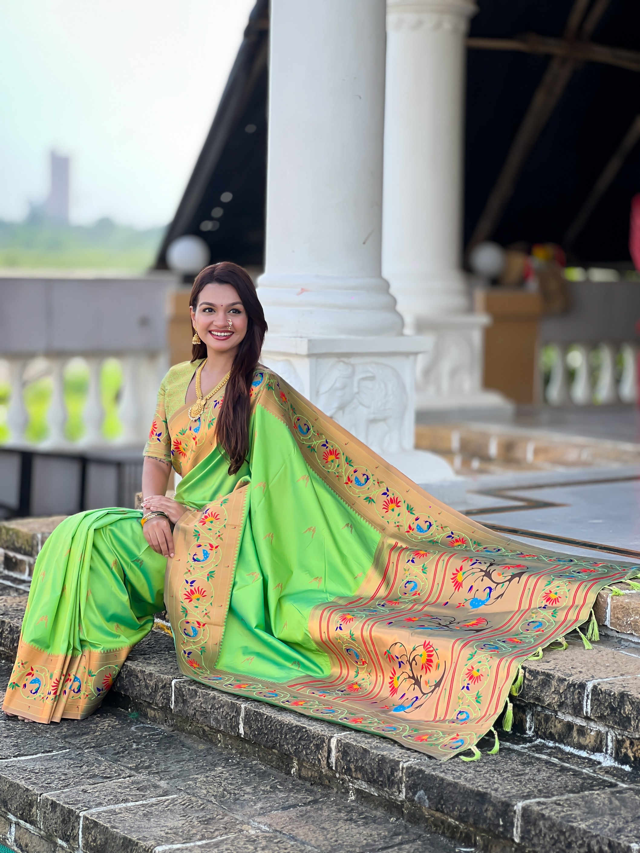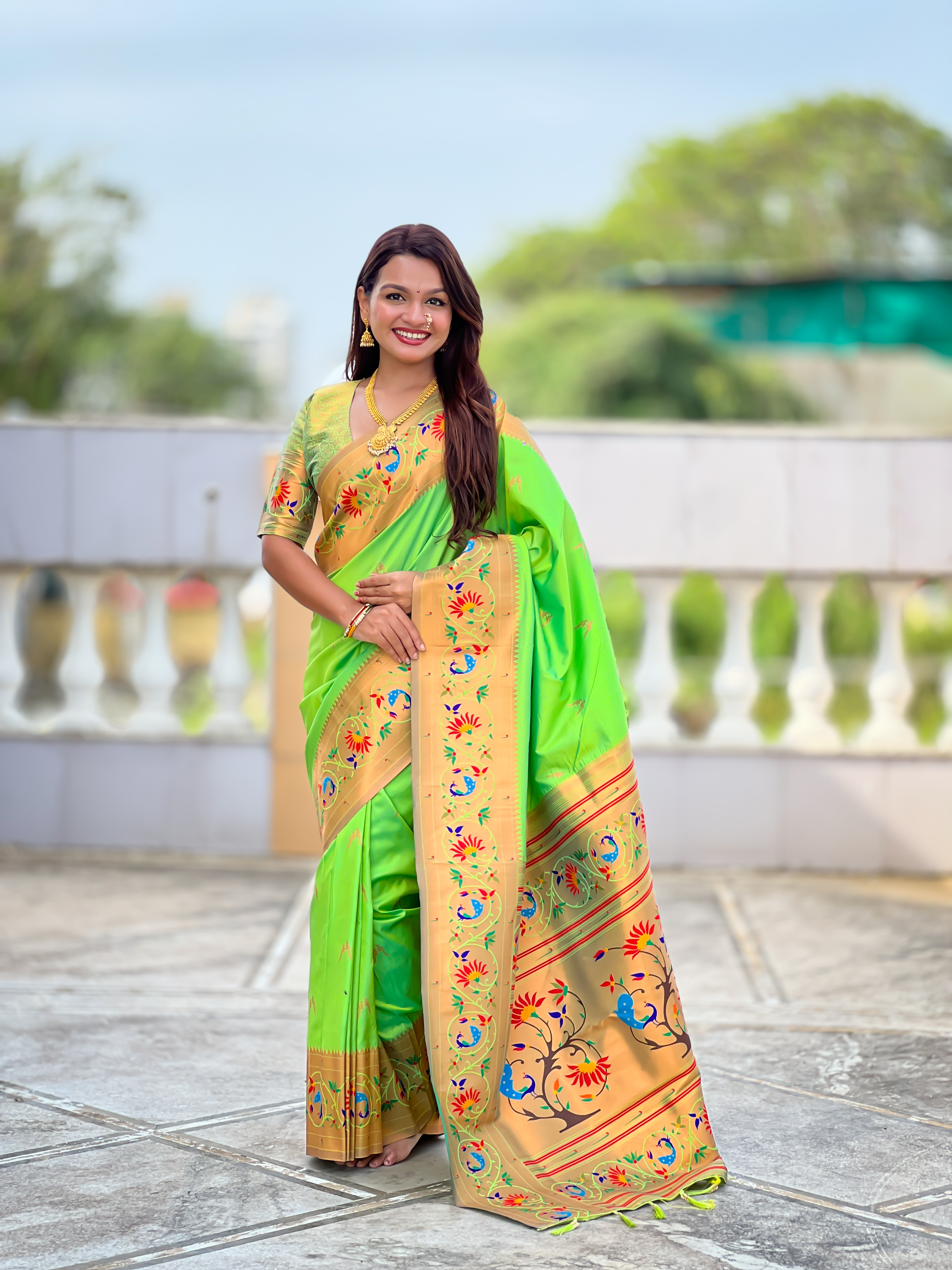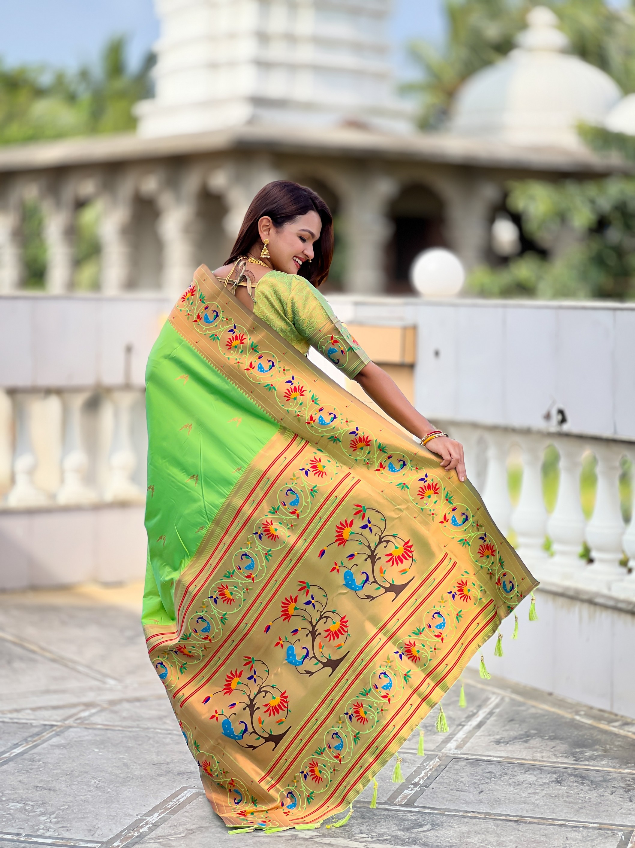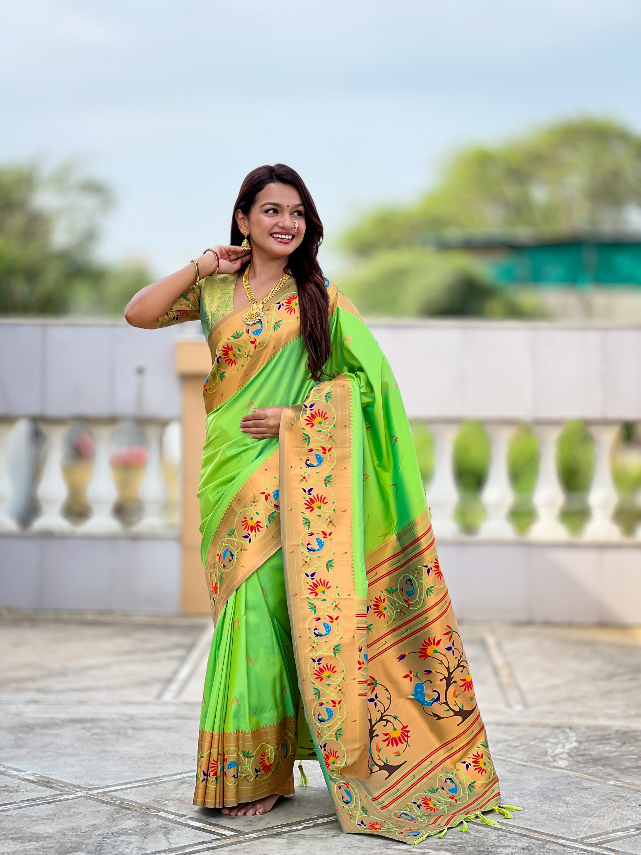 Parrot Green Color Paithani Silk Fabric Woven Meenakari Jacquard Designer Graceful Wedding Saree