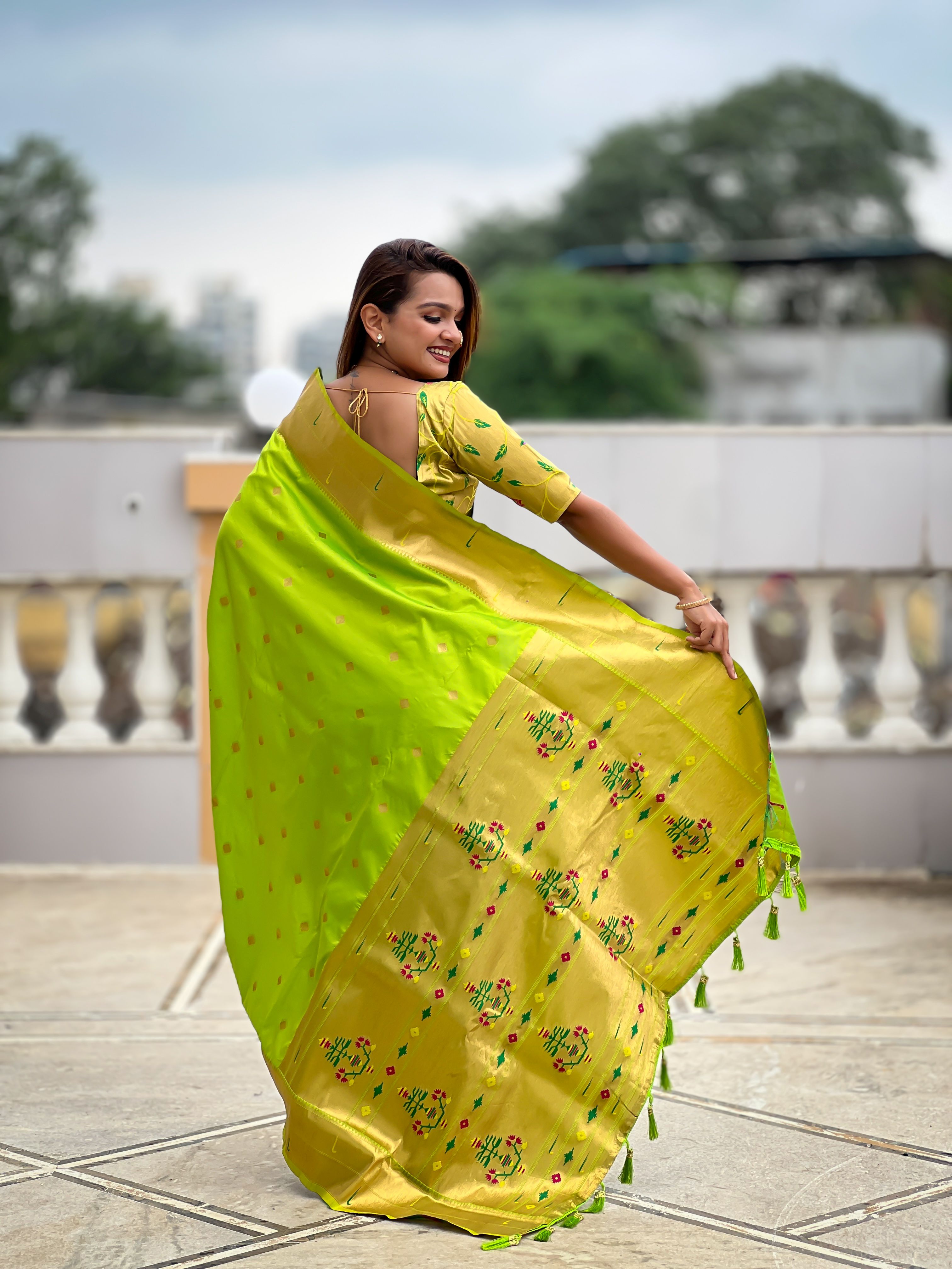 Parrot Green Color Paithani Silk Woven Jacquard Jari Designer Ethnic Saree