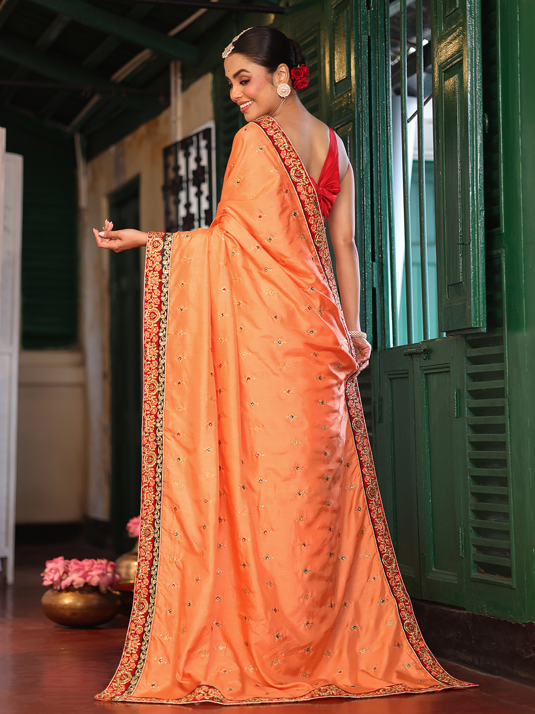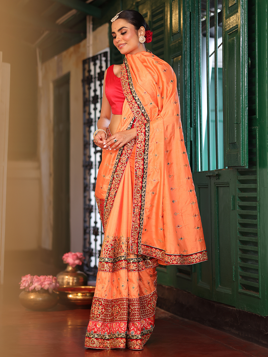 Peach Color Designer Silk Blend Fabric Saree For Ceremonial Looks