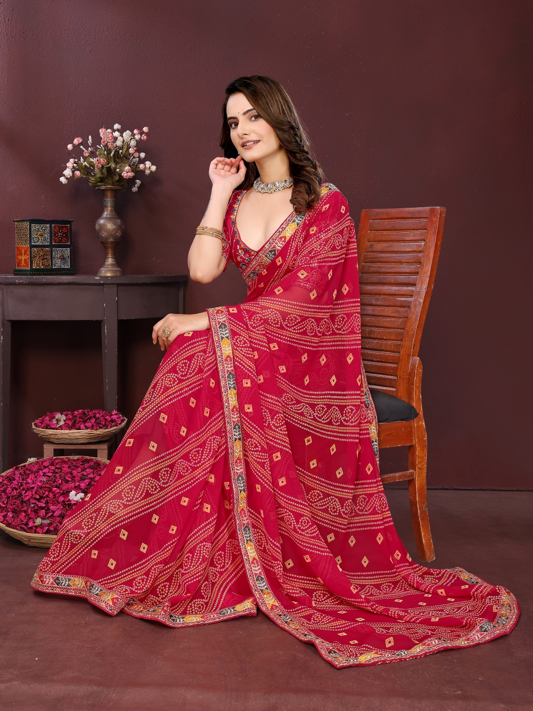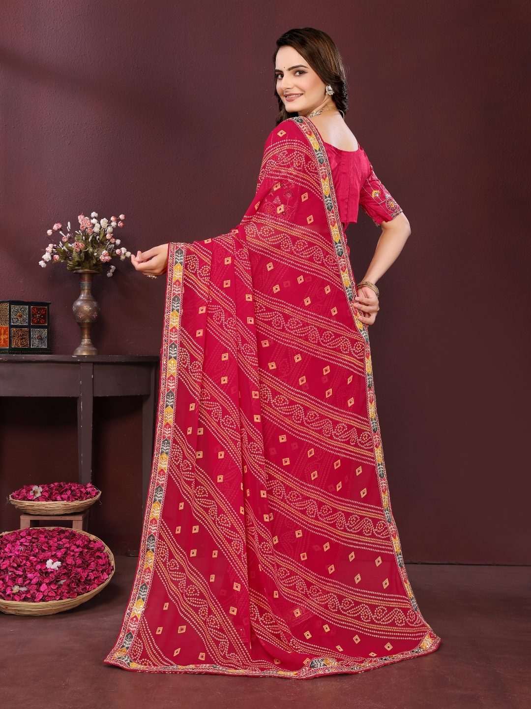 Pink Color Georgette Fabric Bandhej Printed Traditional Saree