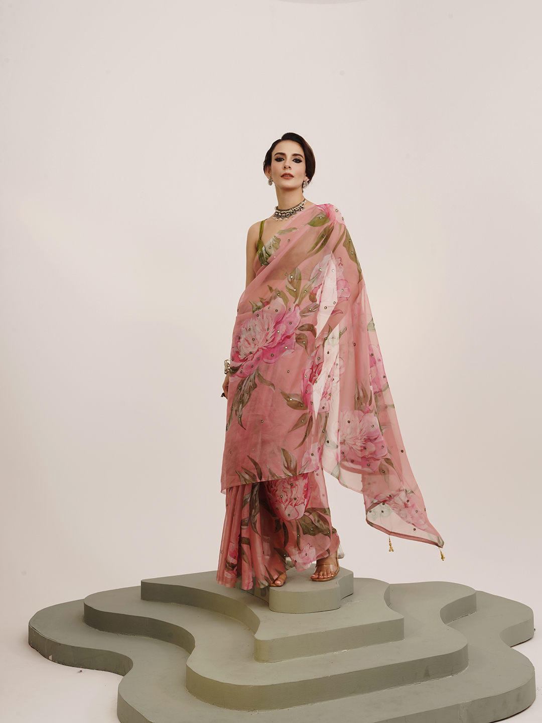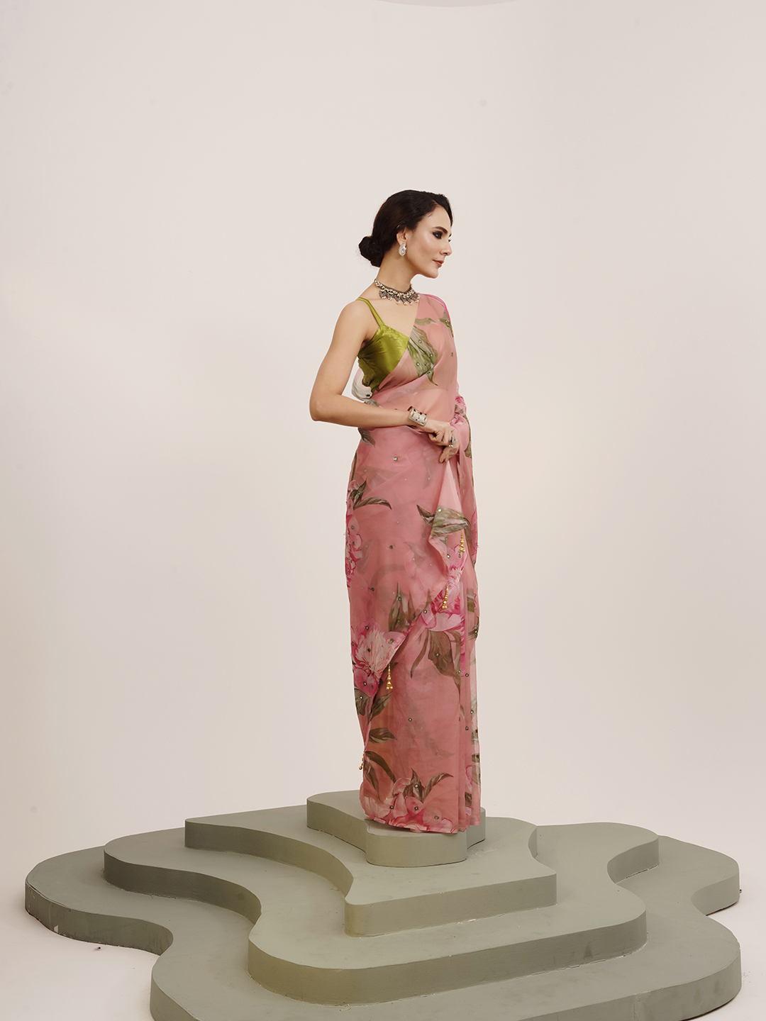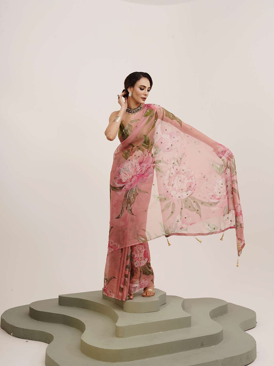 Pink Color Mirror work Floral Organza Saree For Beautiful Partywear Saree