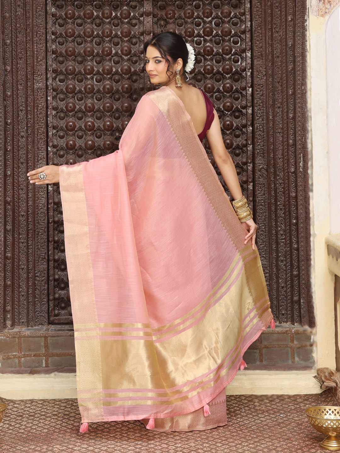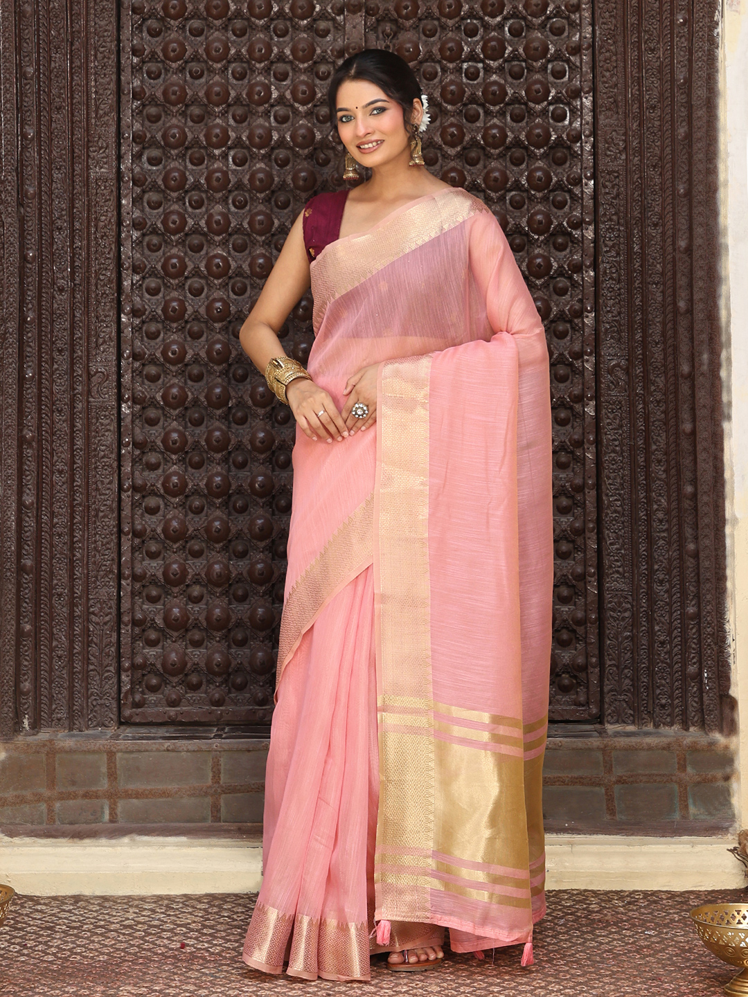 Pink Color Rich Ethnic Cotton Based Saree with Rich Woven Designer Looks