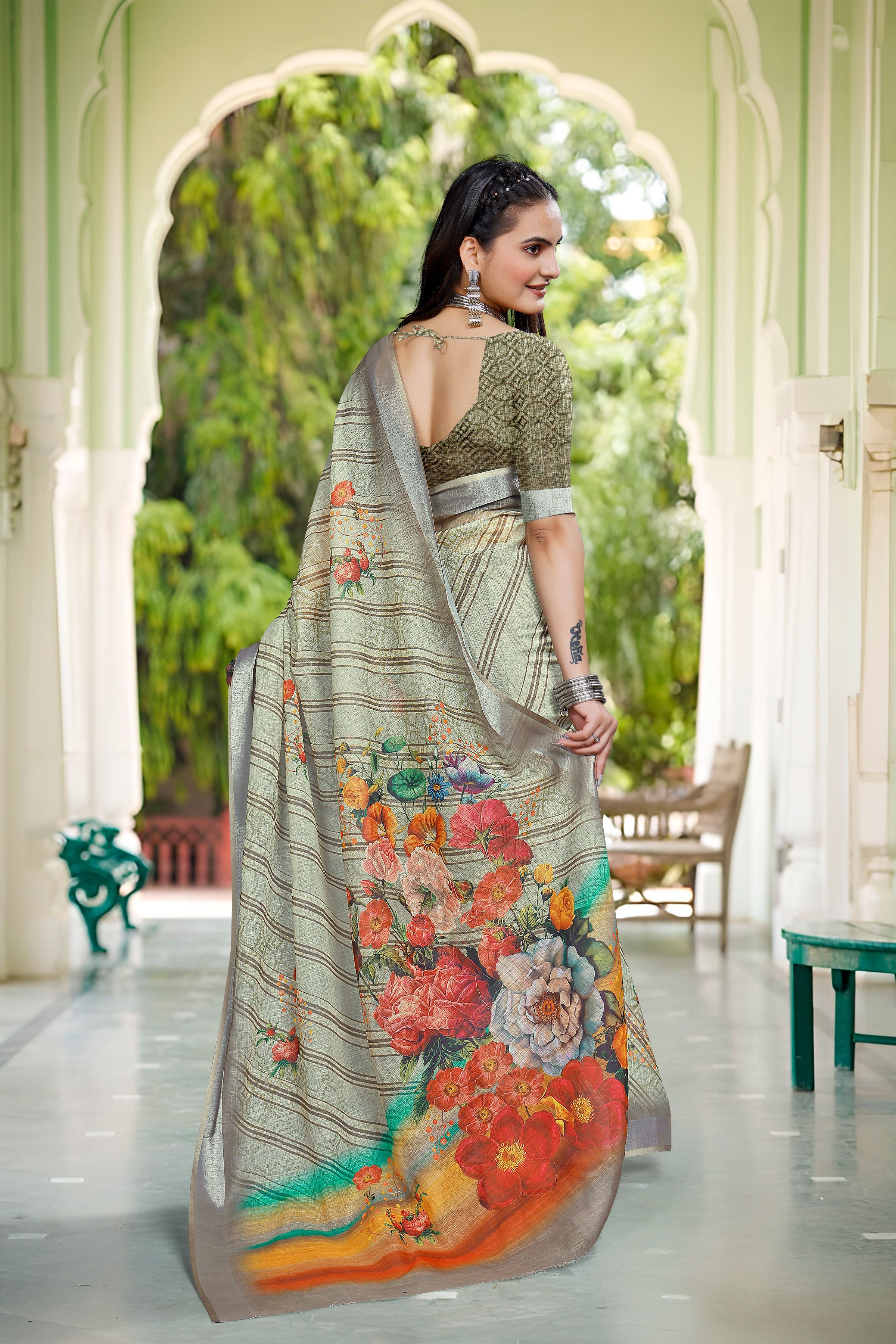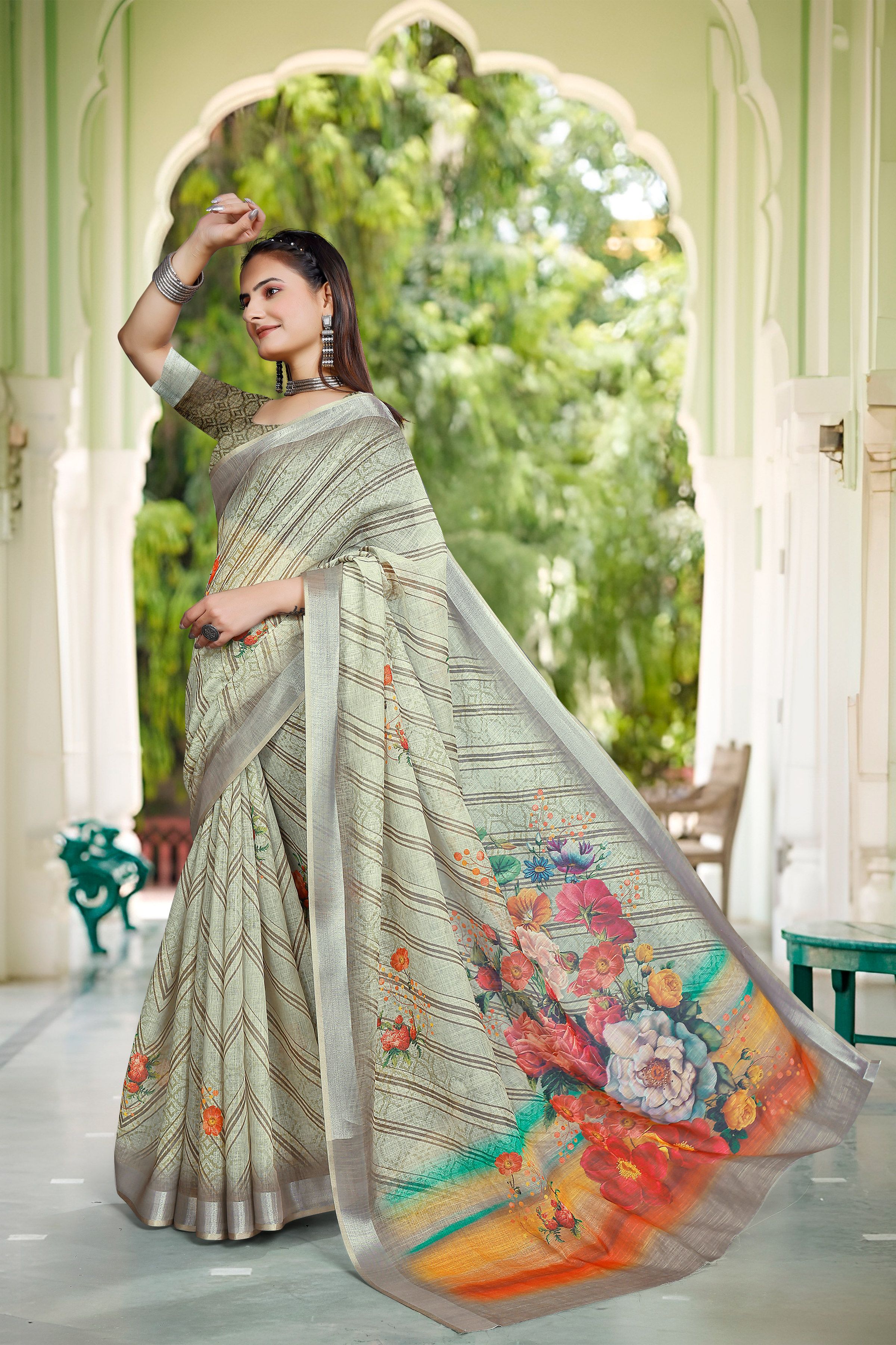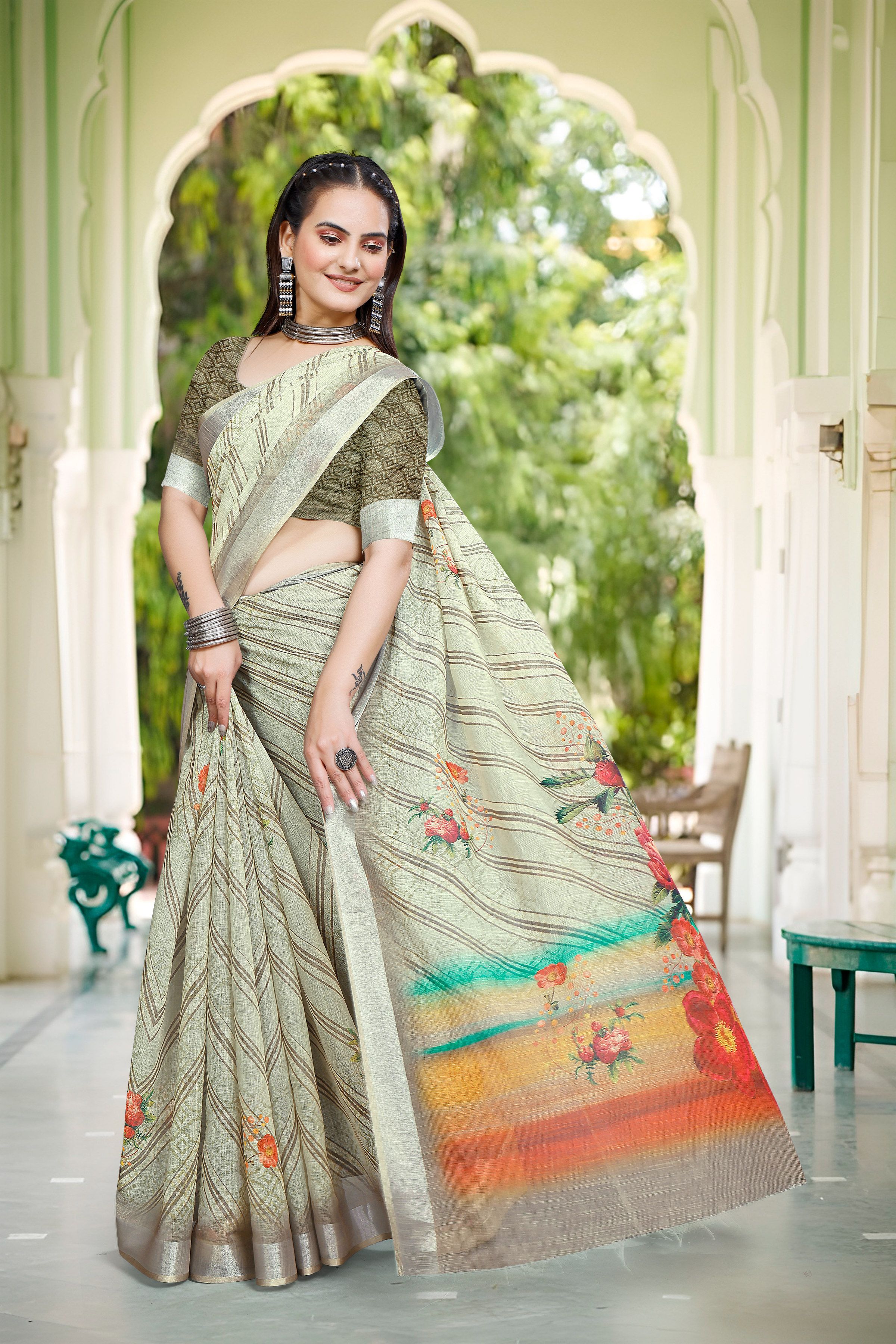 Look These Festive Saree in Fine Colored.These Saree Are Linen Cotton And Blouse is Fabricated On Linen Cotton Pair.Its Beautified With Woven Jari Border With Designer Digital Printed.