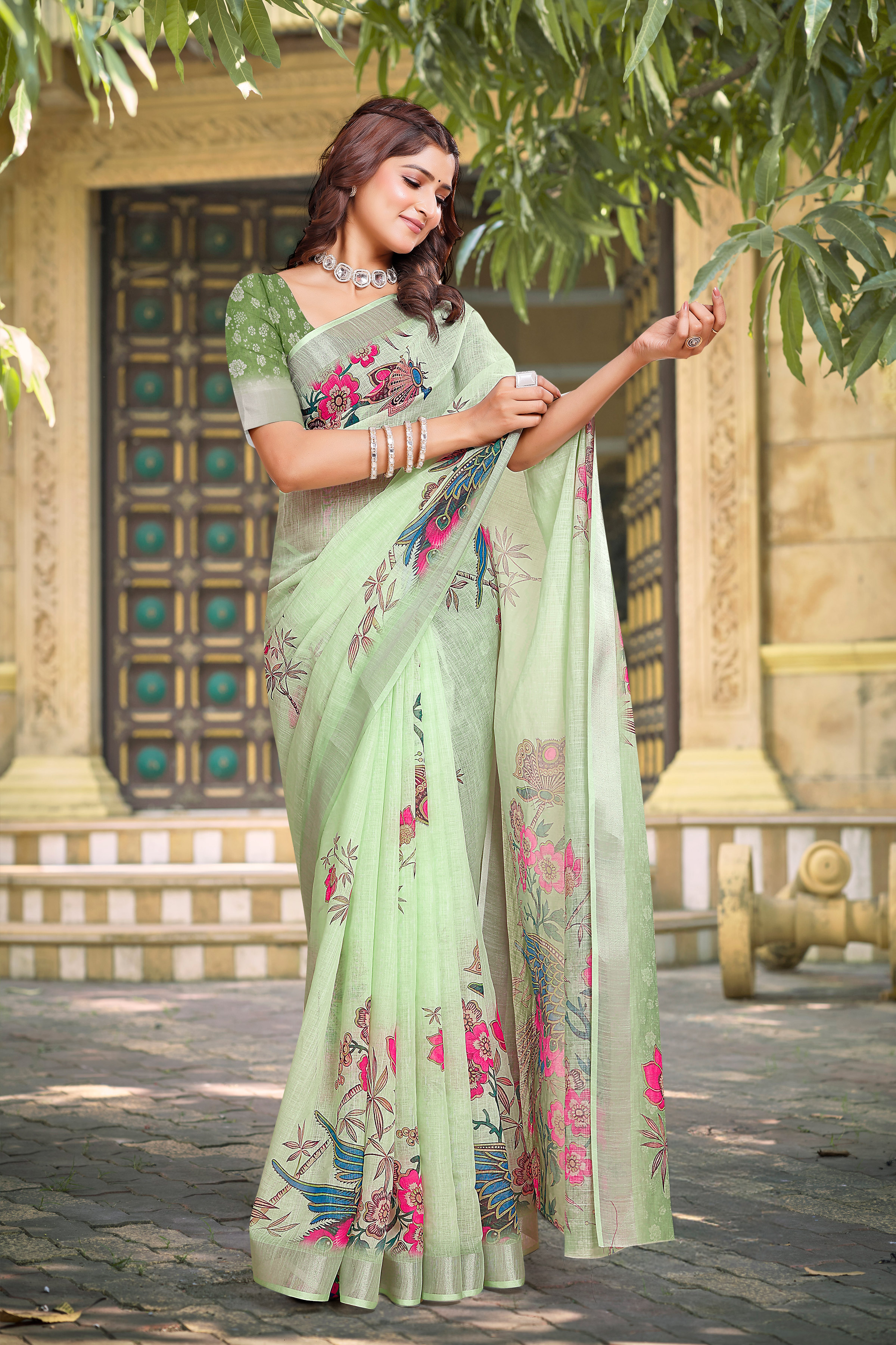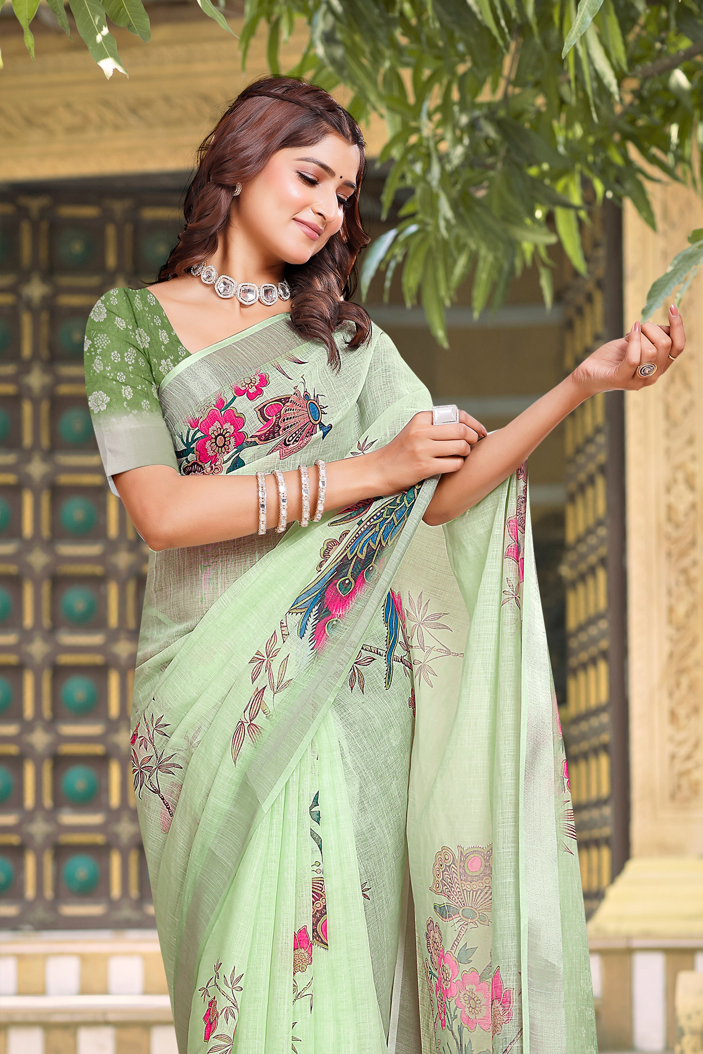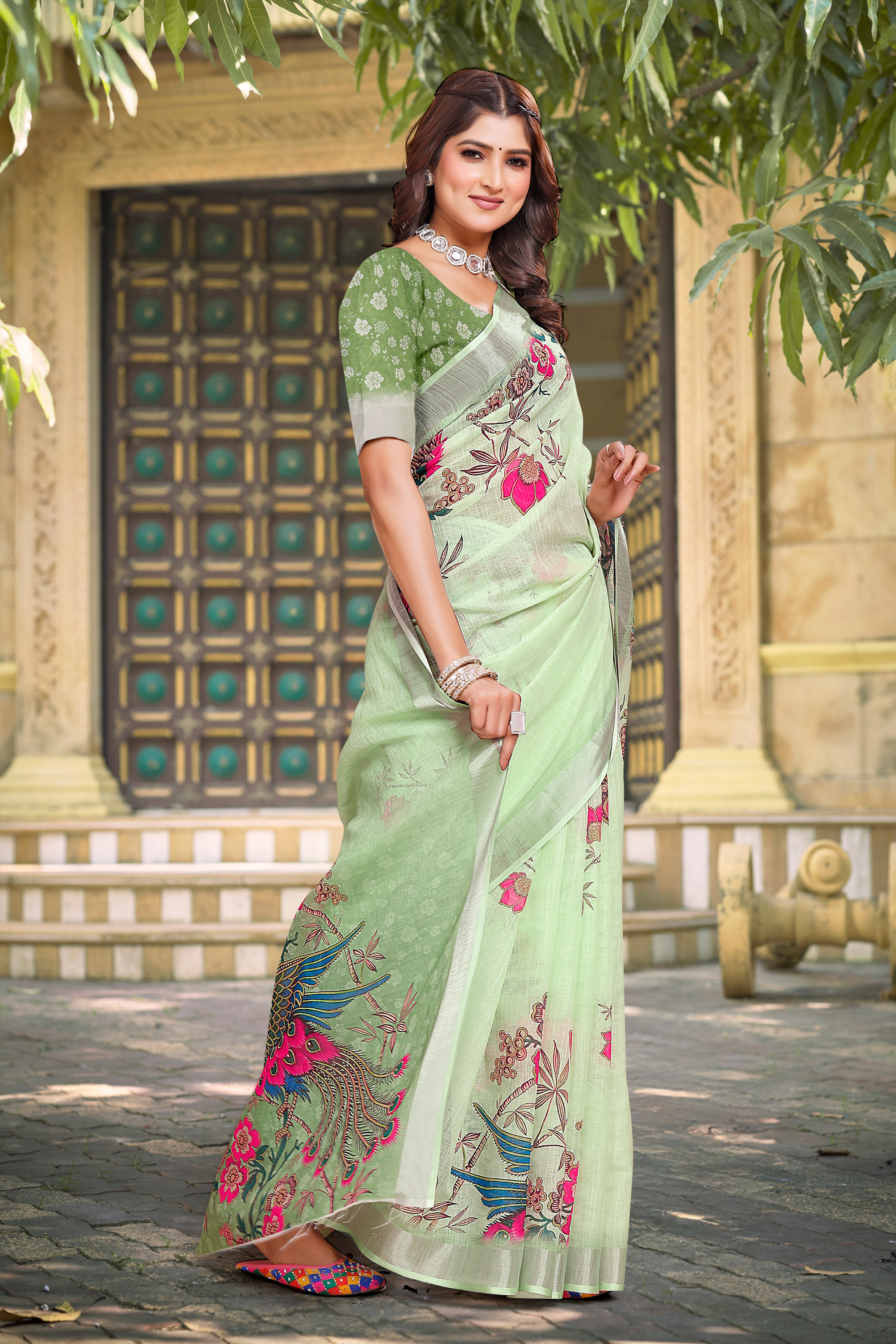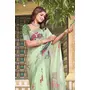 Pista Color Linen Cotton Saree With Smart Partywear Printed Looks