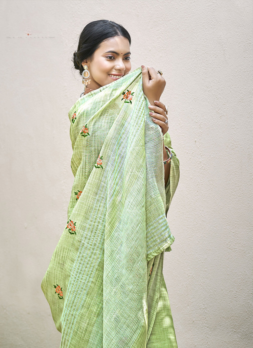 Pista Color Linen Fabric Beautifully Embroidered Ethnic Saree