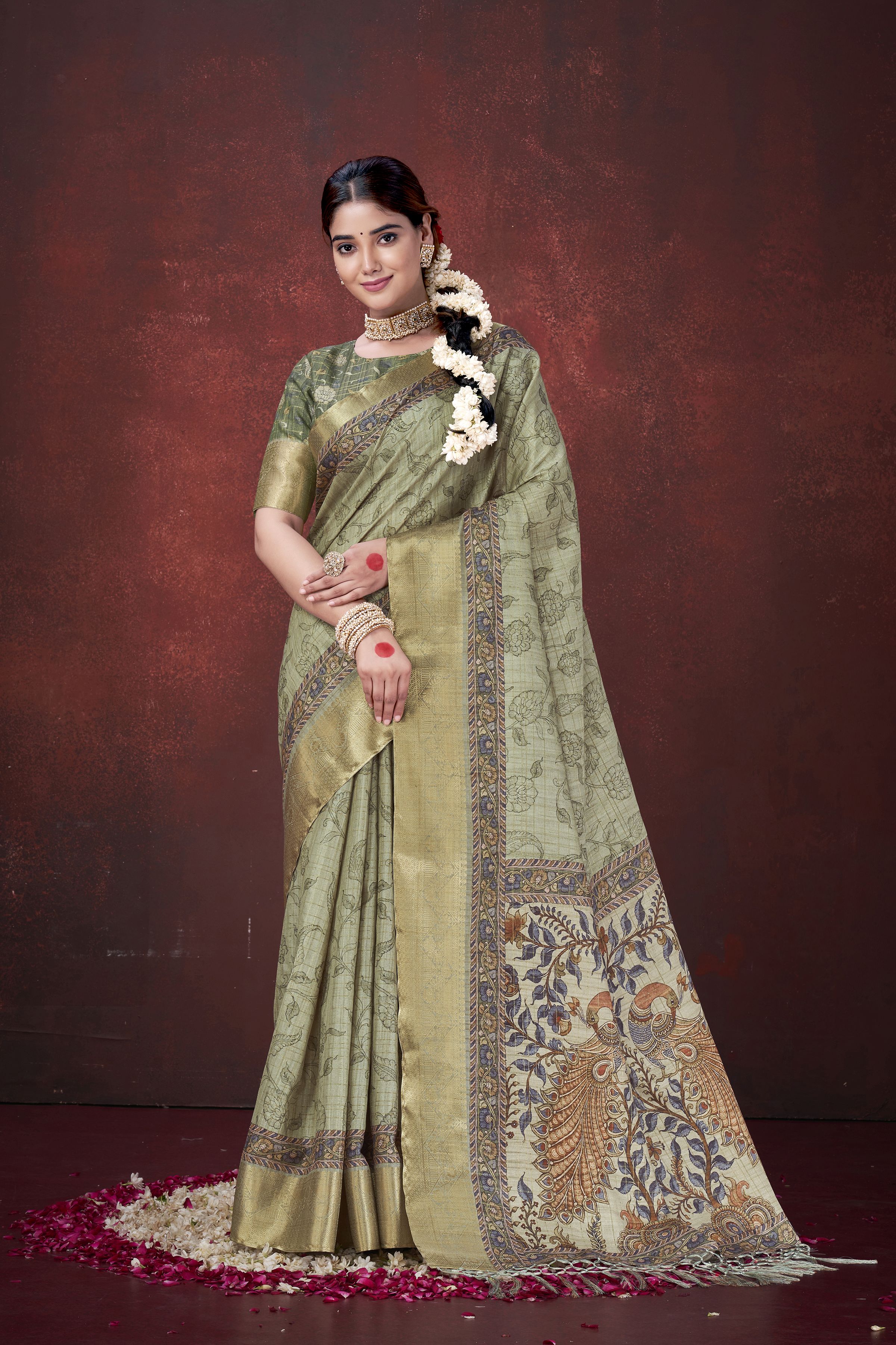 Pista Green Color Habotai Silk Fabric Flower Design print with Foil print Graceful Ceremonial Saree
