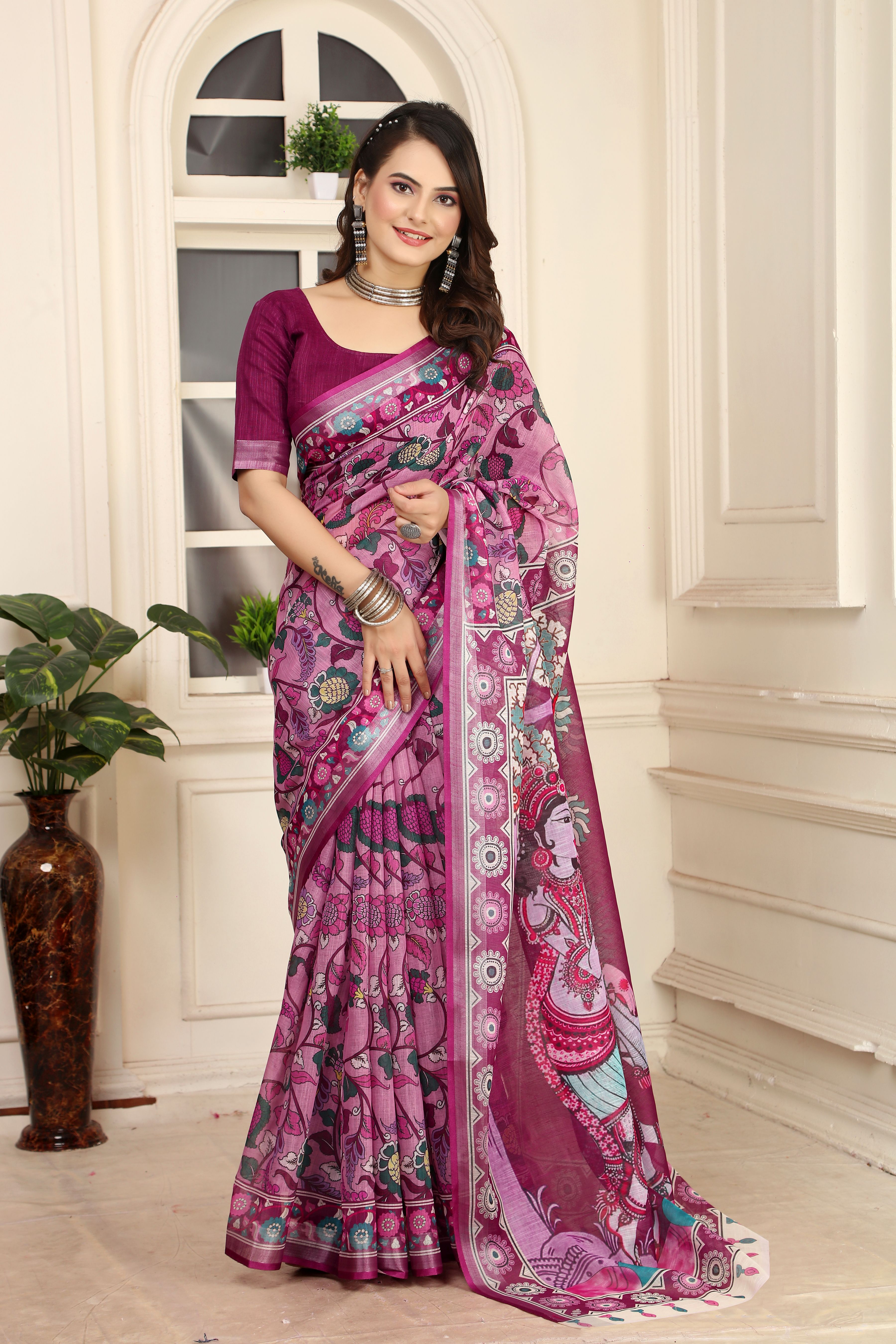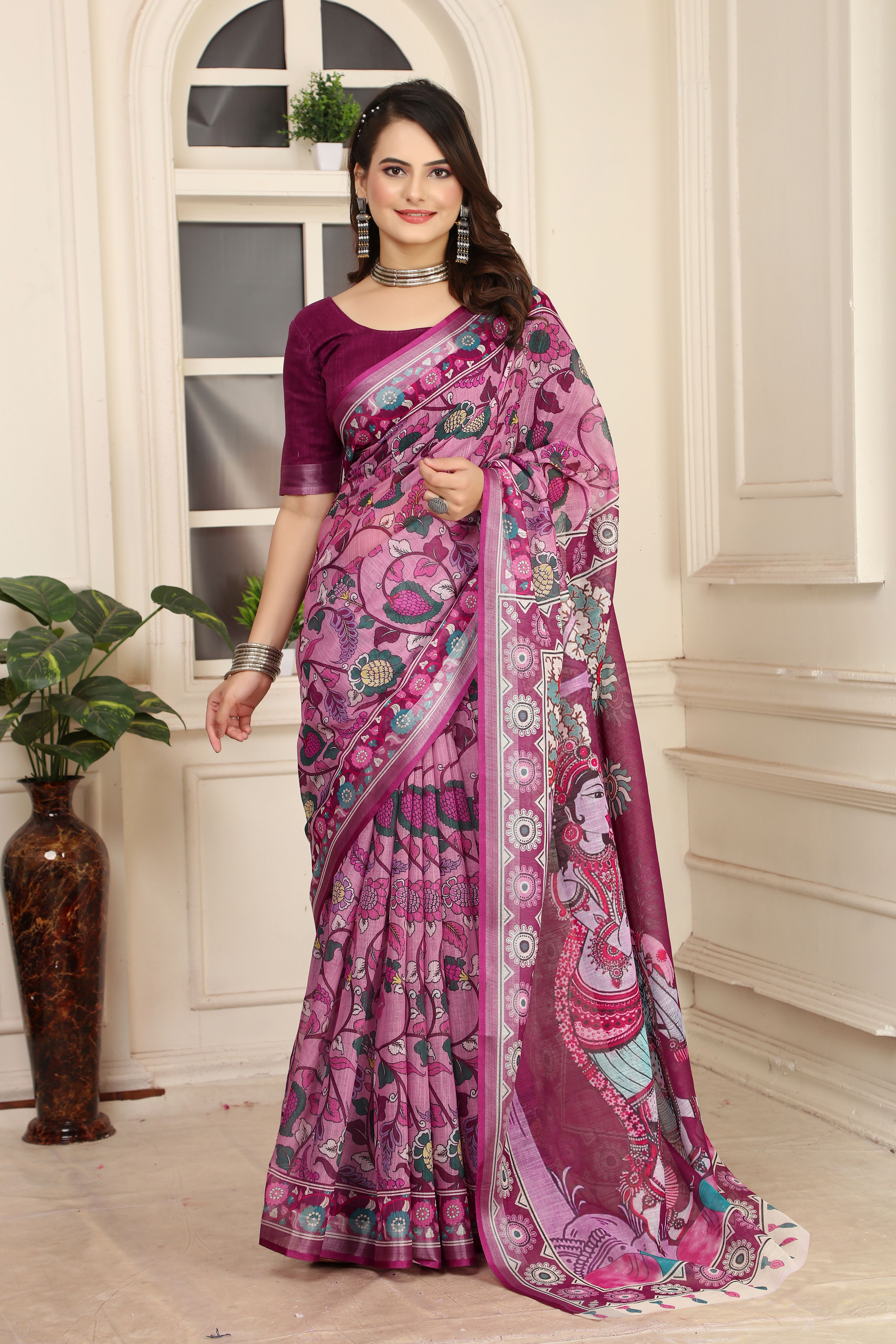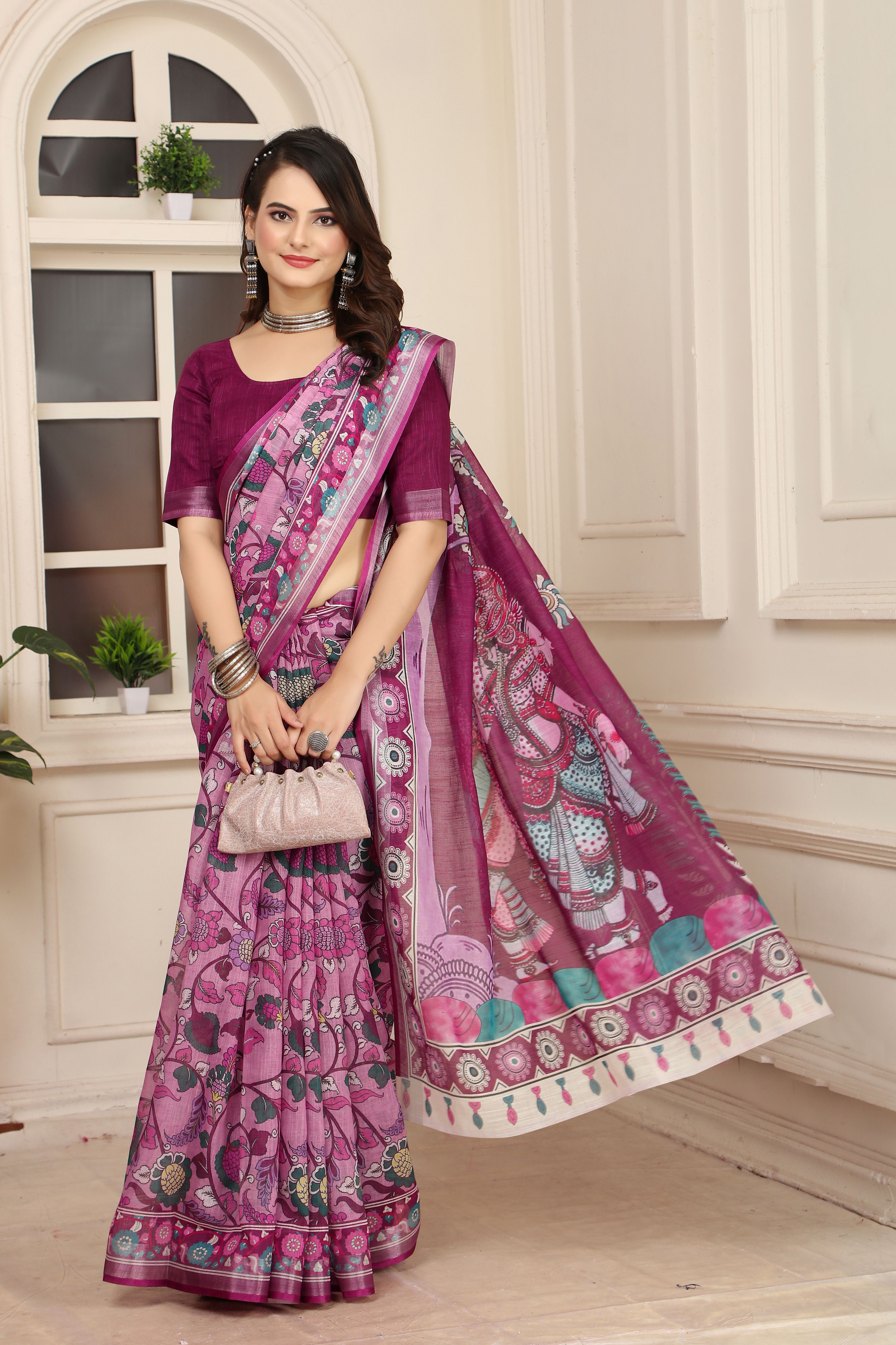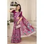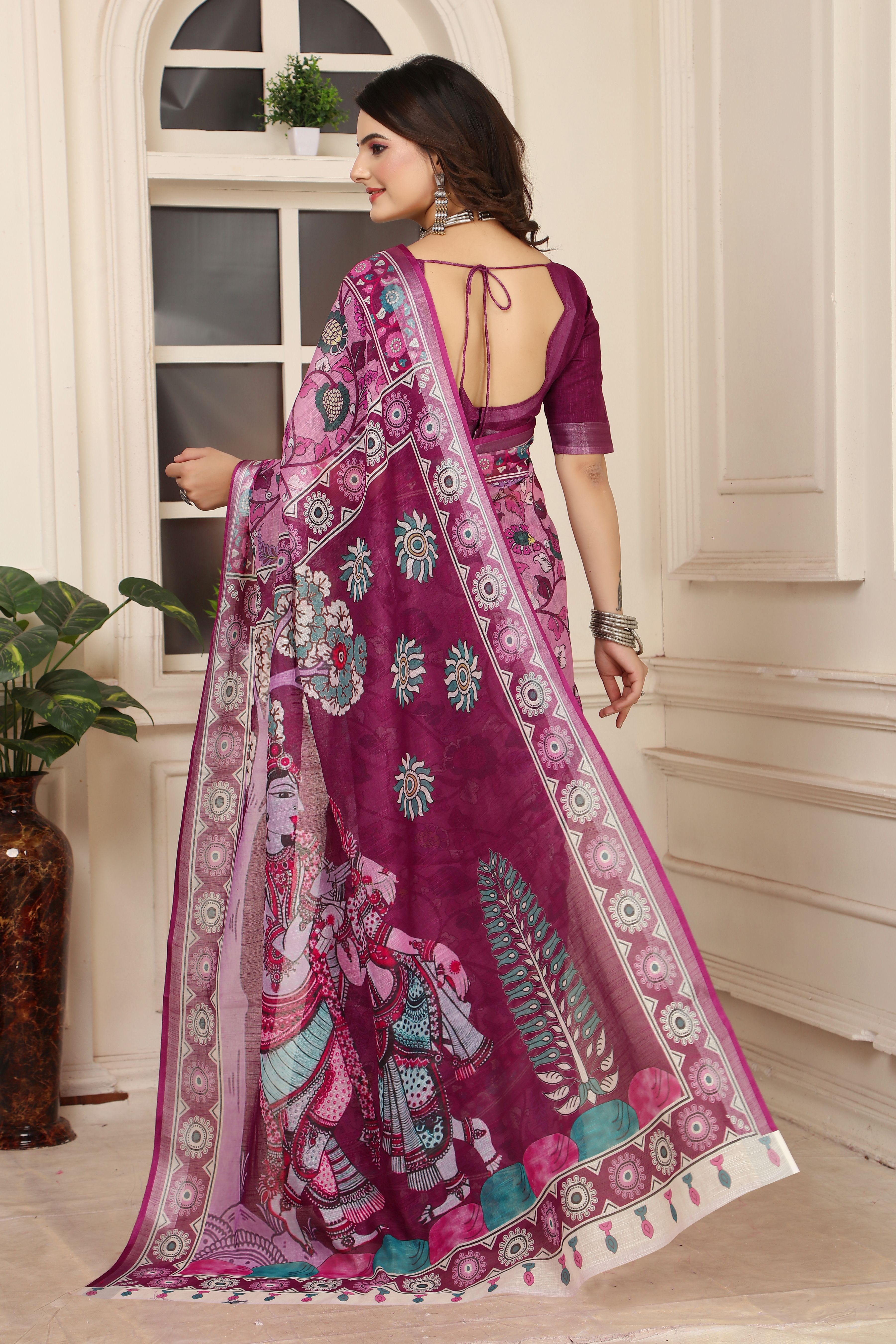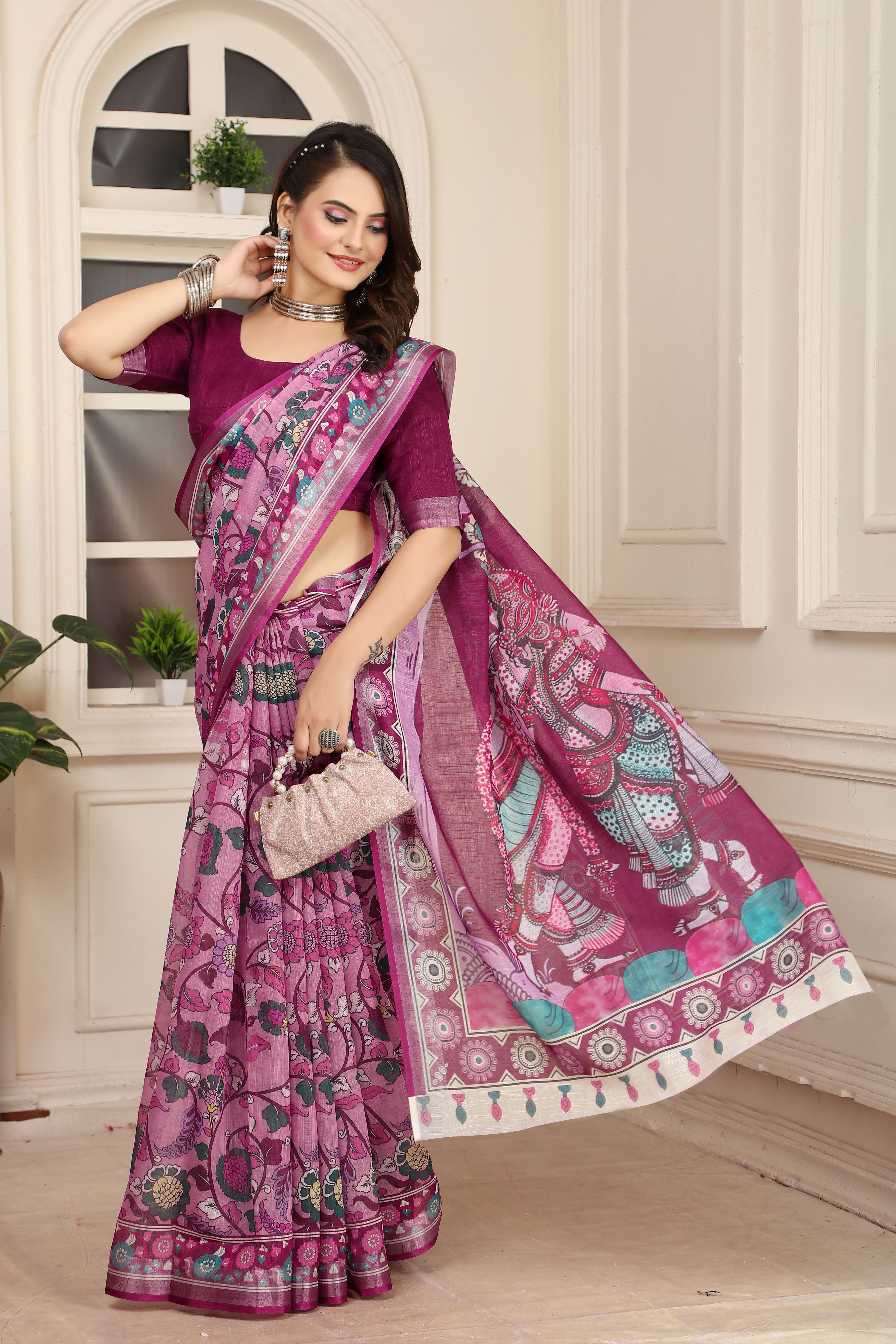 Purple Color Linen Cotton Fabric Beautiful Printed Saree