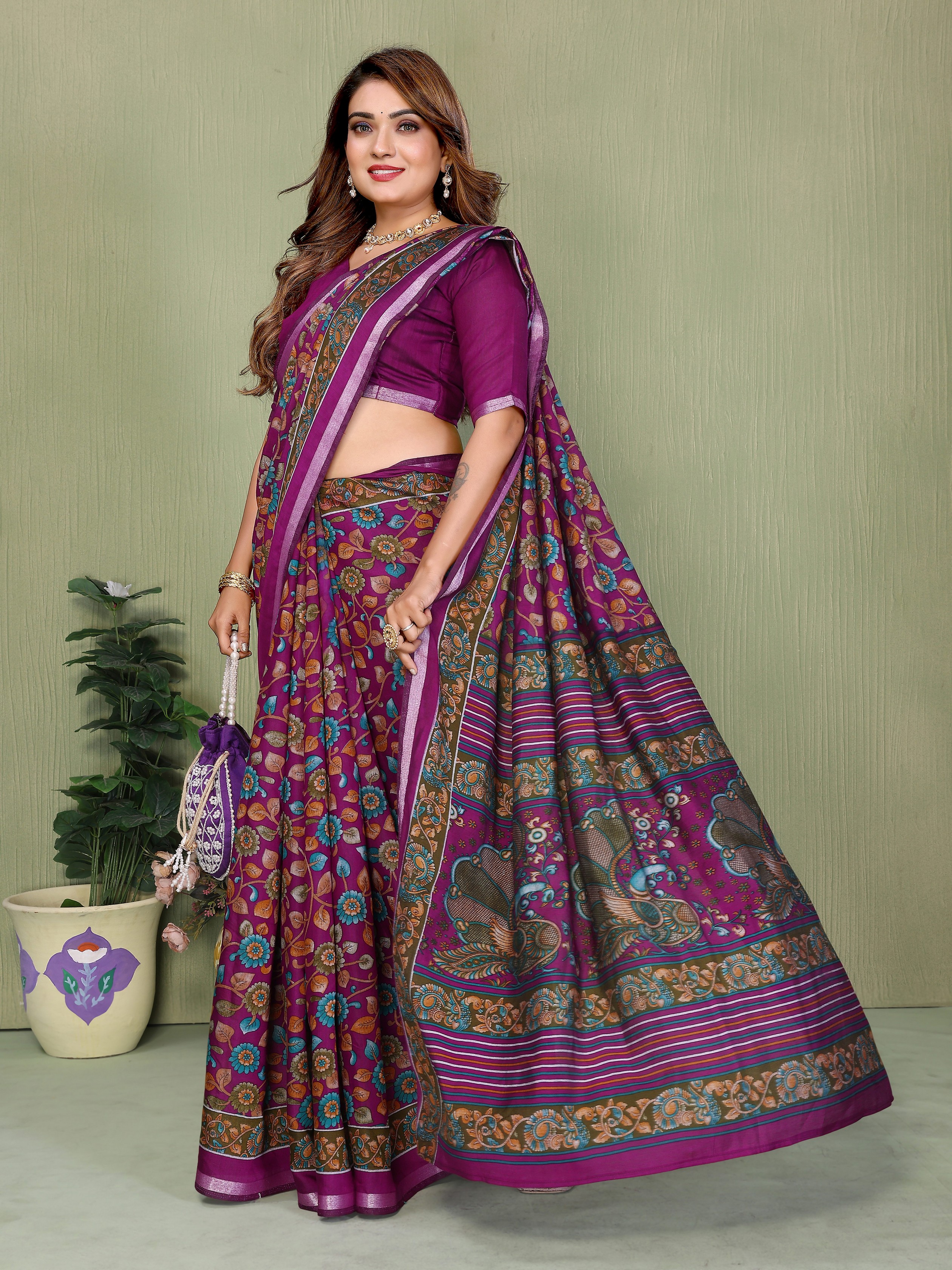 Purple Color Mul Cotton Fabric Designer Printed Partywear Saree