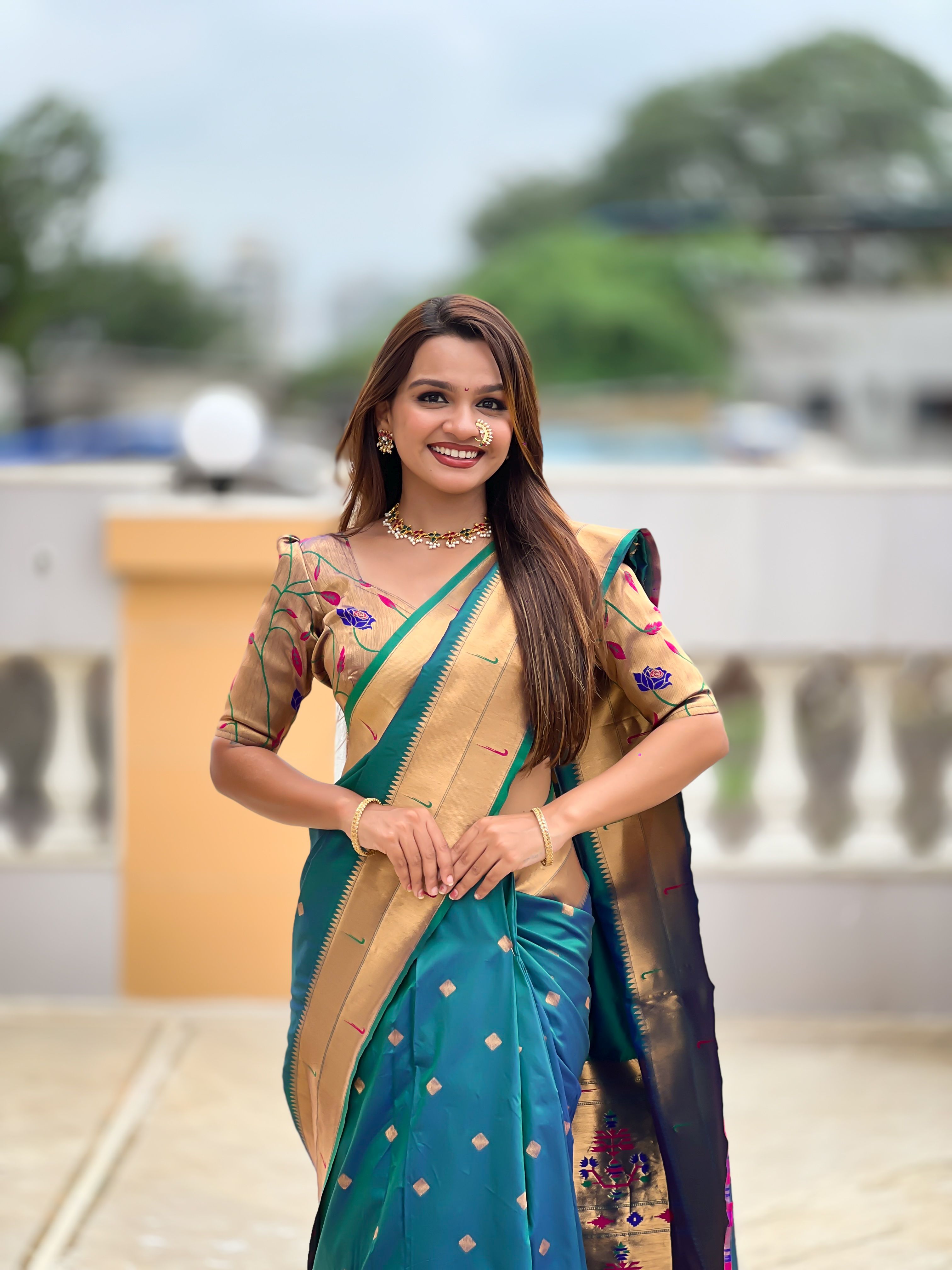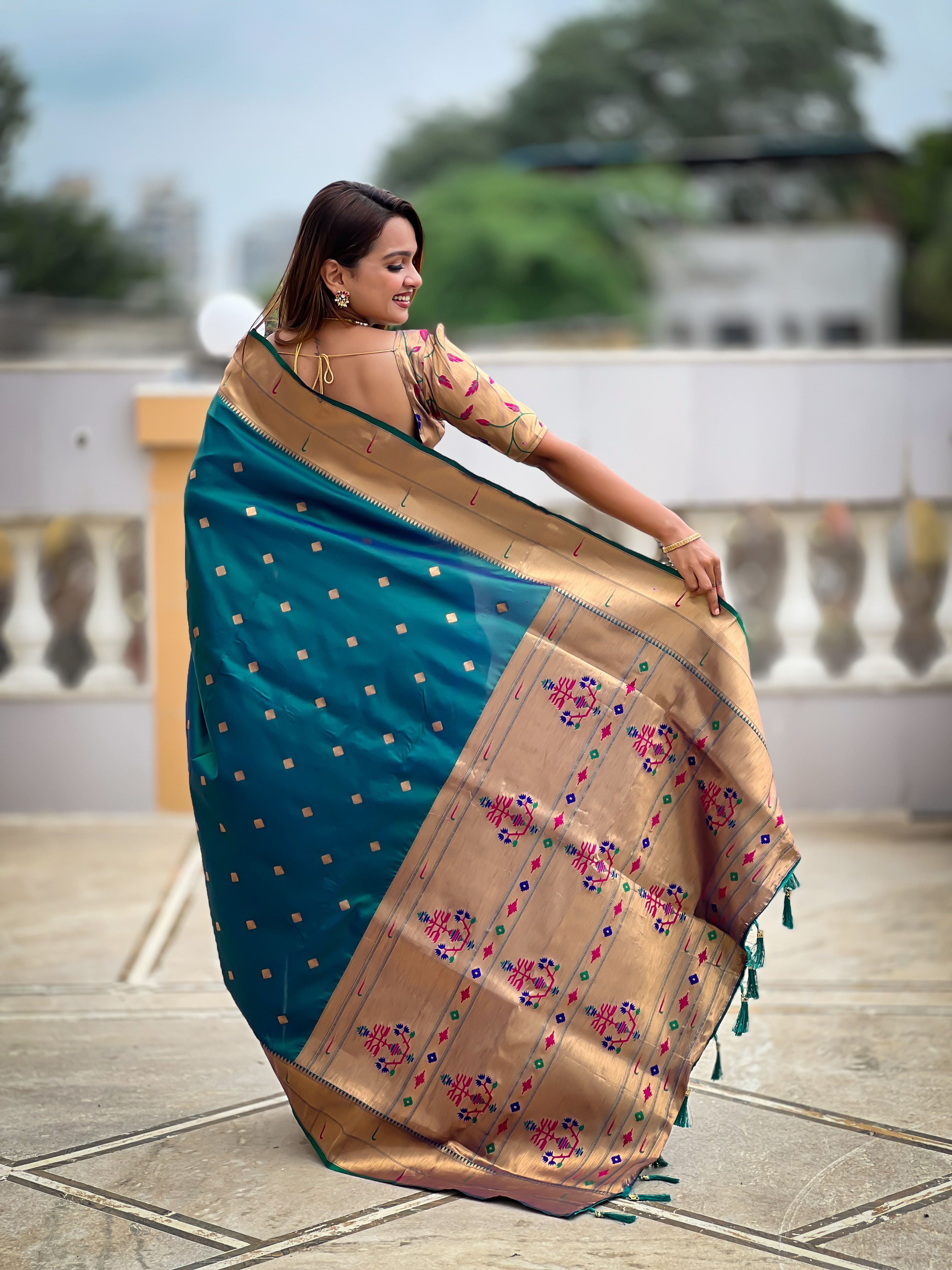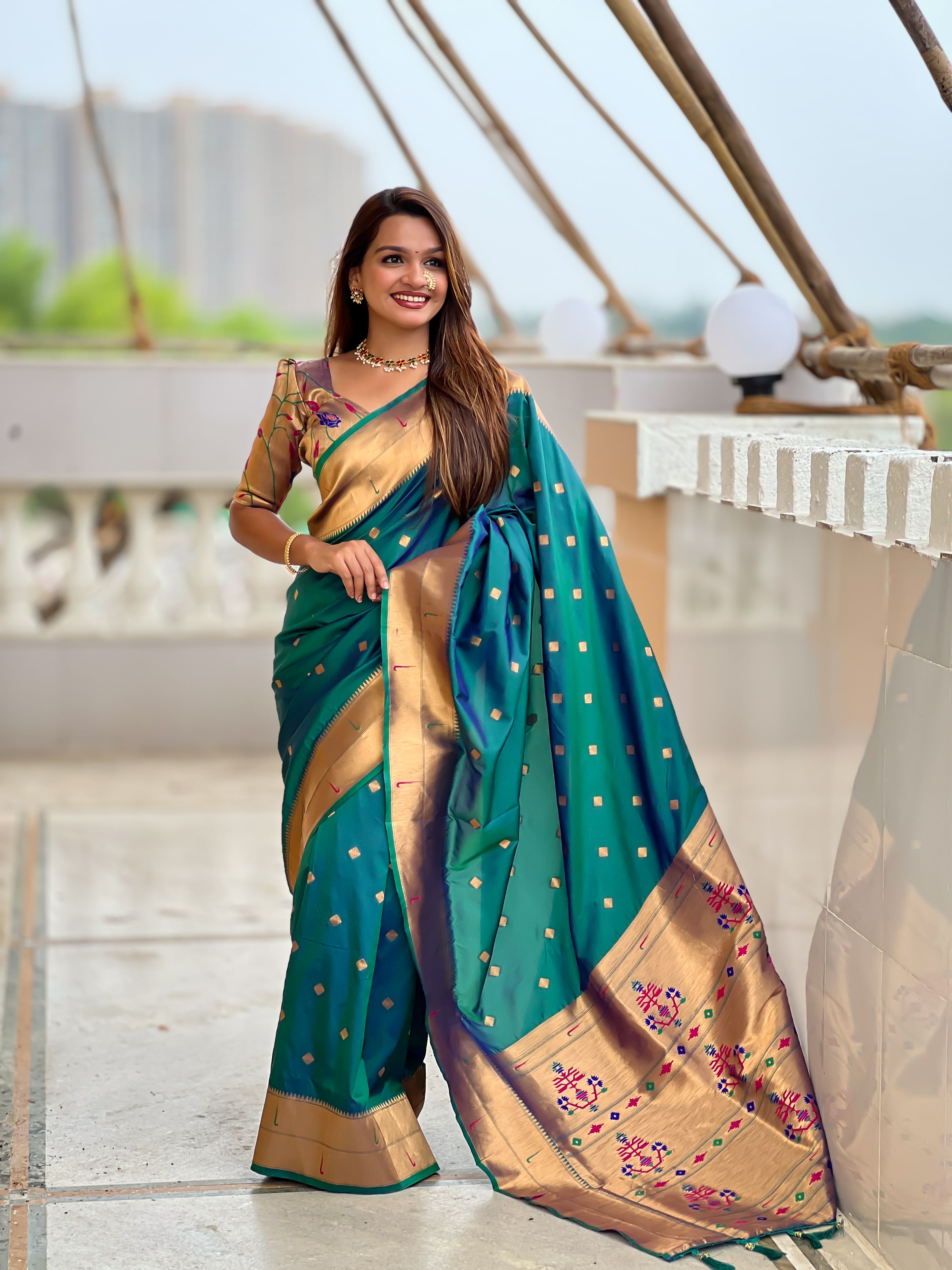 Rama Color Paithani Silk Woven Jacquard Jari Designer Ethnic Saree