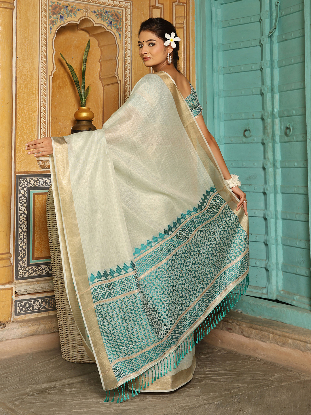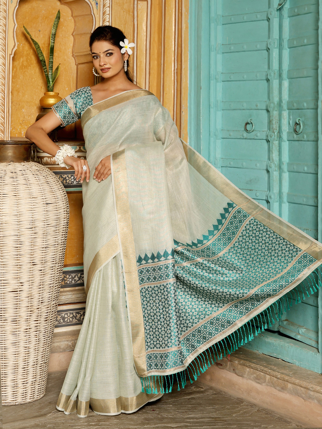 Rama Green Color Linen Fabric Woven Designer Beautiful Fancy Saree