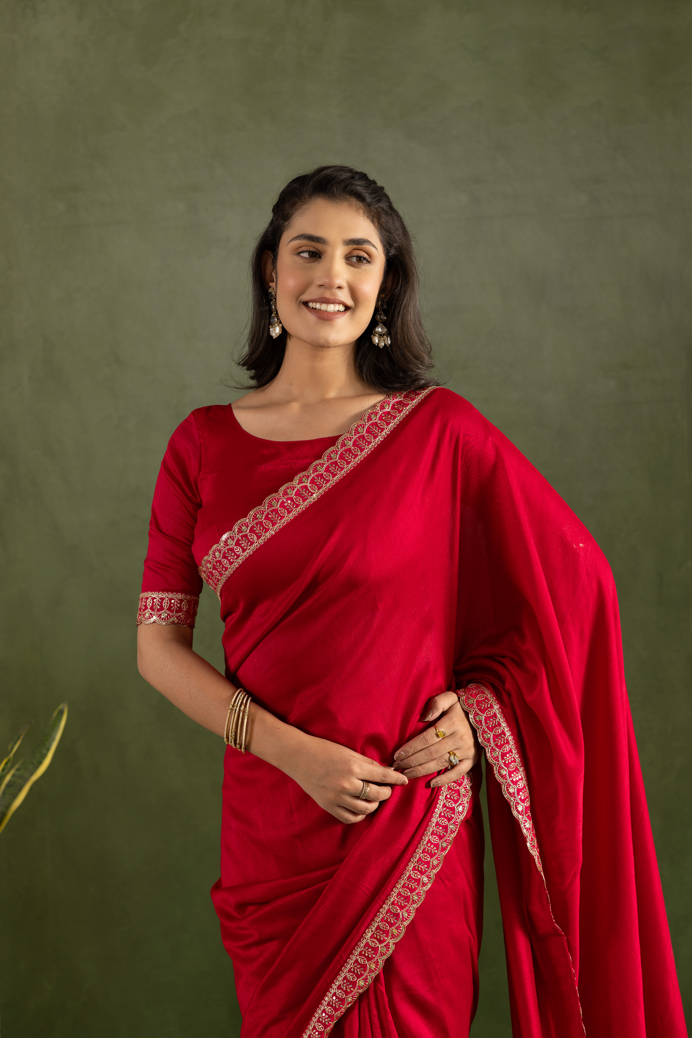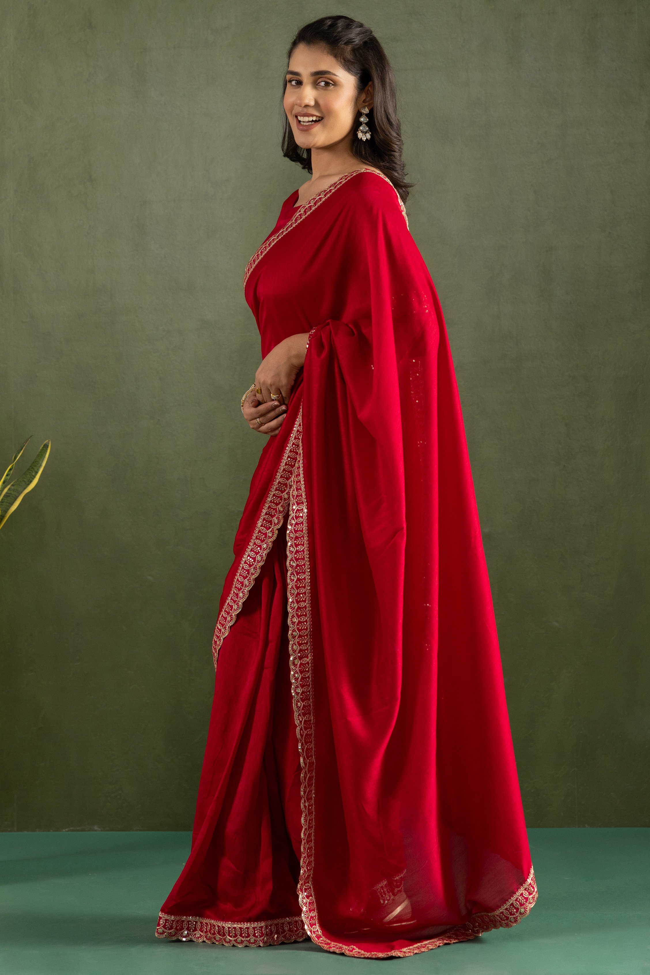 Red Color Chiffon Fabric Ready To Wear Saree For Graceful Bollywood Style Saree