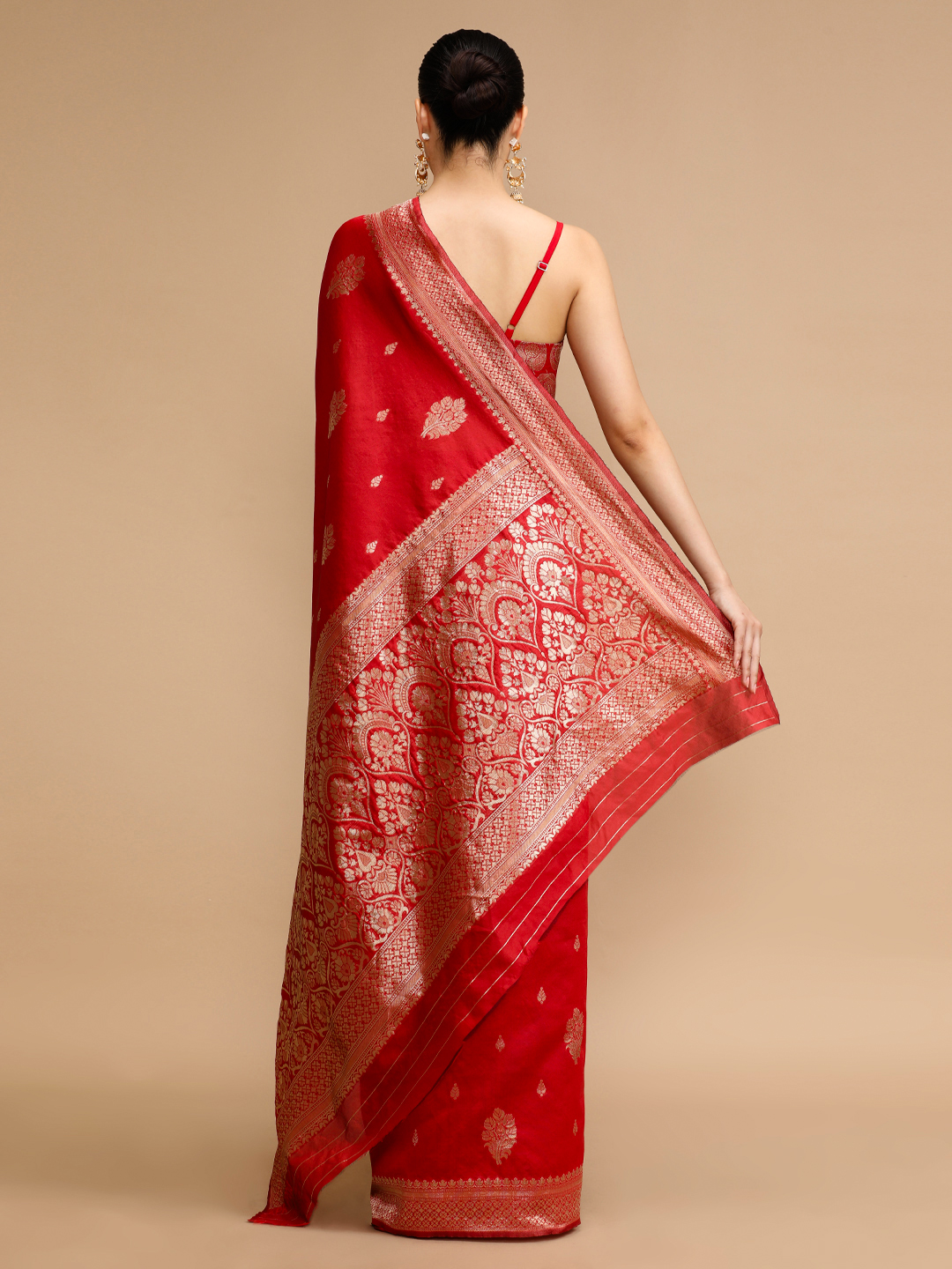 Red Color Lichi Silk Saree Woven Jacquard Designer For Ceremonial Looks