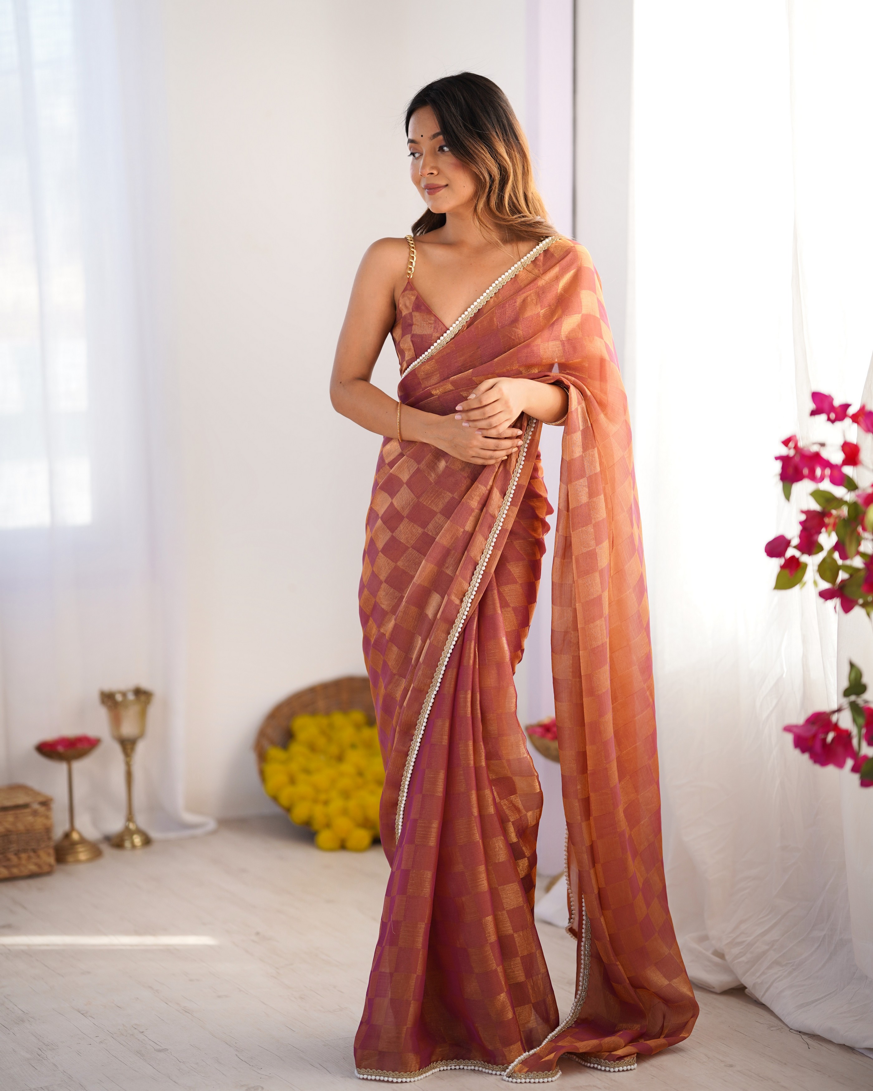 Rust Color Woven Chiffon Fabric Ethnic Bollywood Party Saree