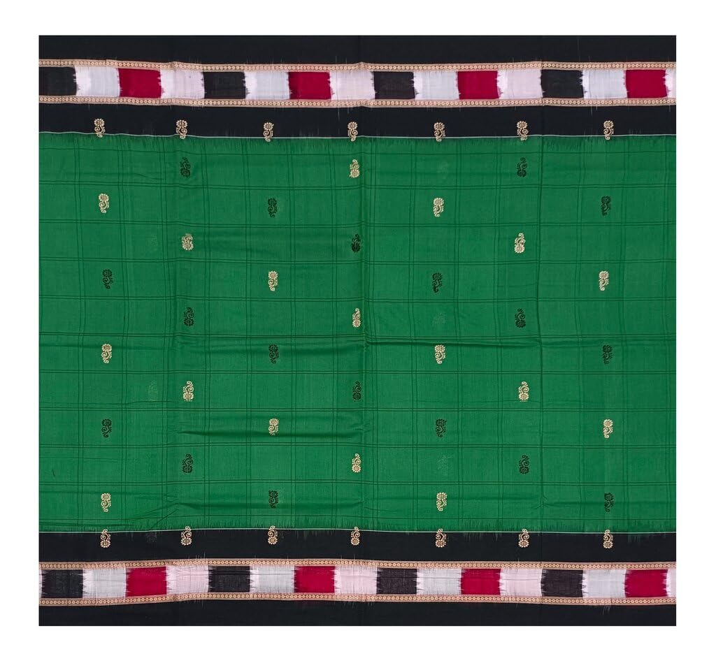 SAMBALPURI BANDHA CRAFT Sambalpuri bomkai cotton saree with blouse piece(Flower motifs in green color base with check check design boarder)