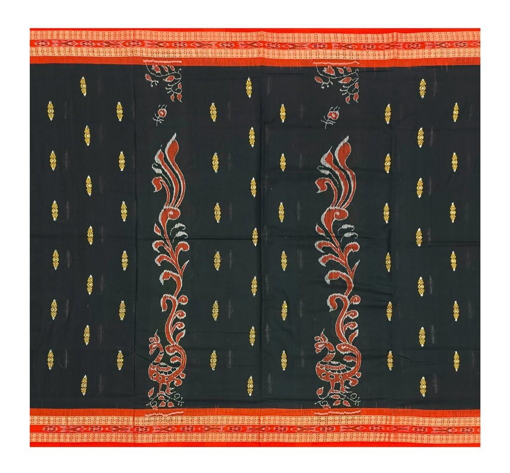 SAMBALPURI BANDHA CRAFT sambalpuri bomkai cotton saree wth blouse piece(Peacock and bomkai design in black color base)