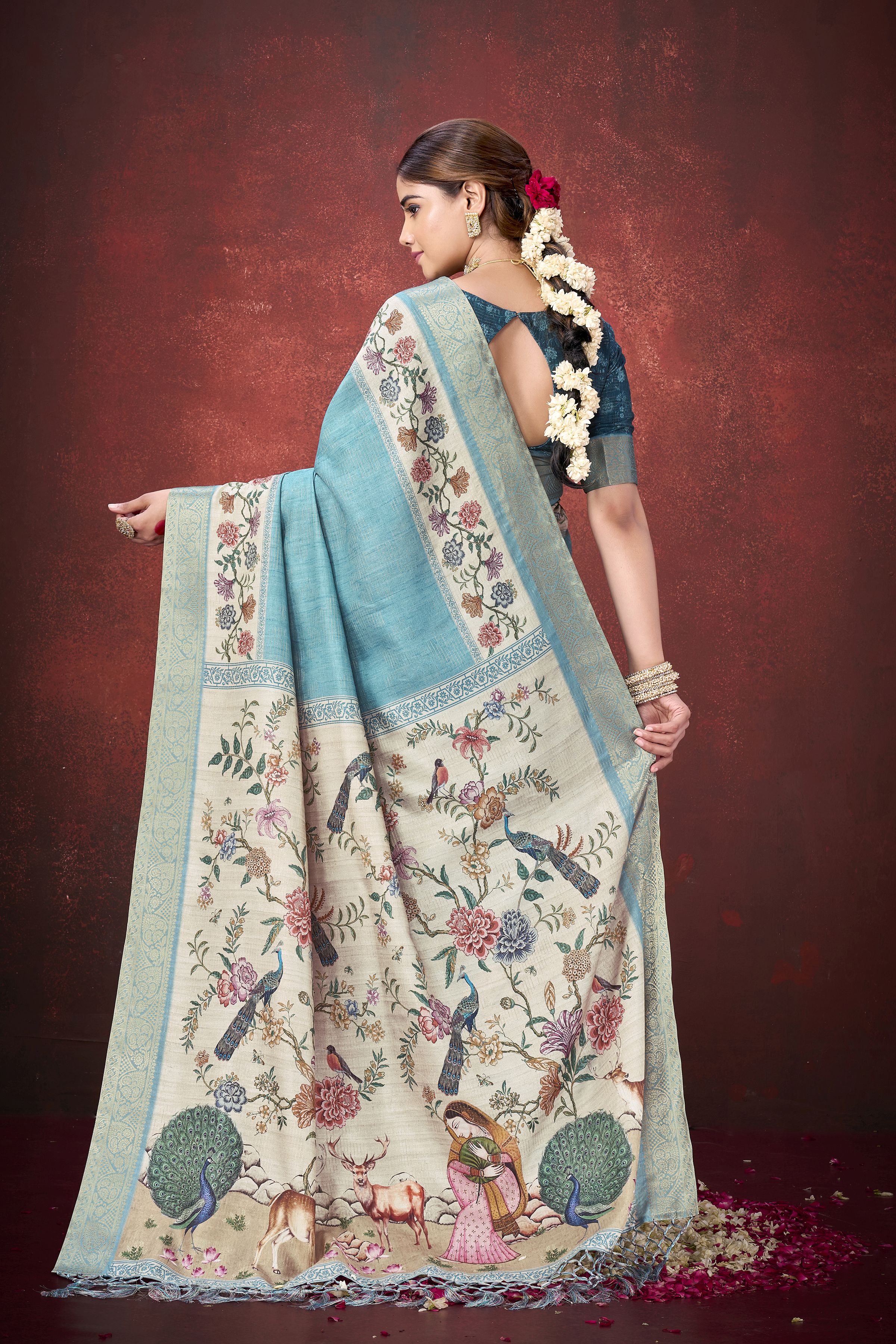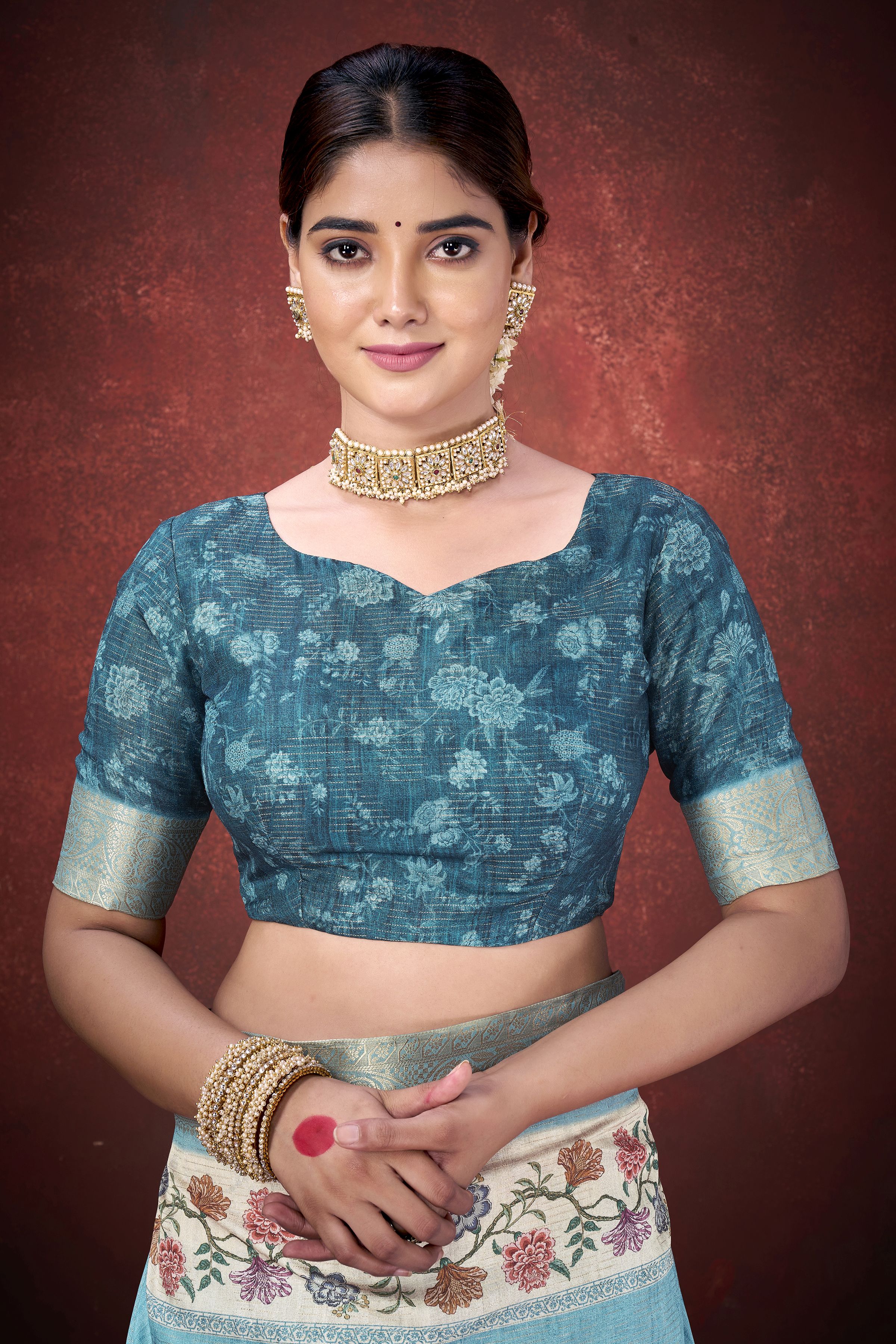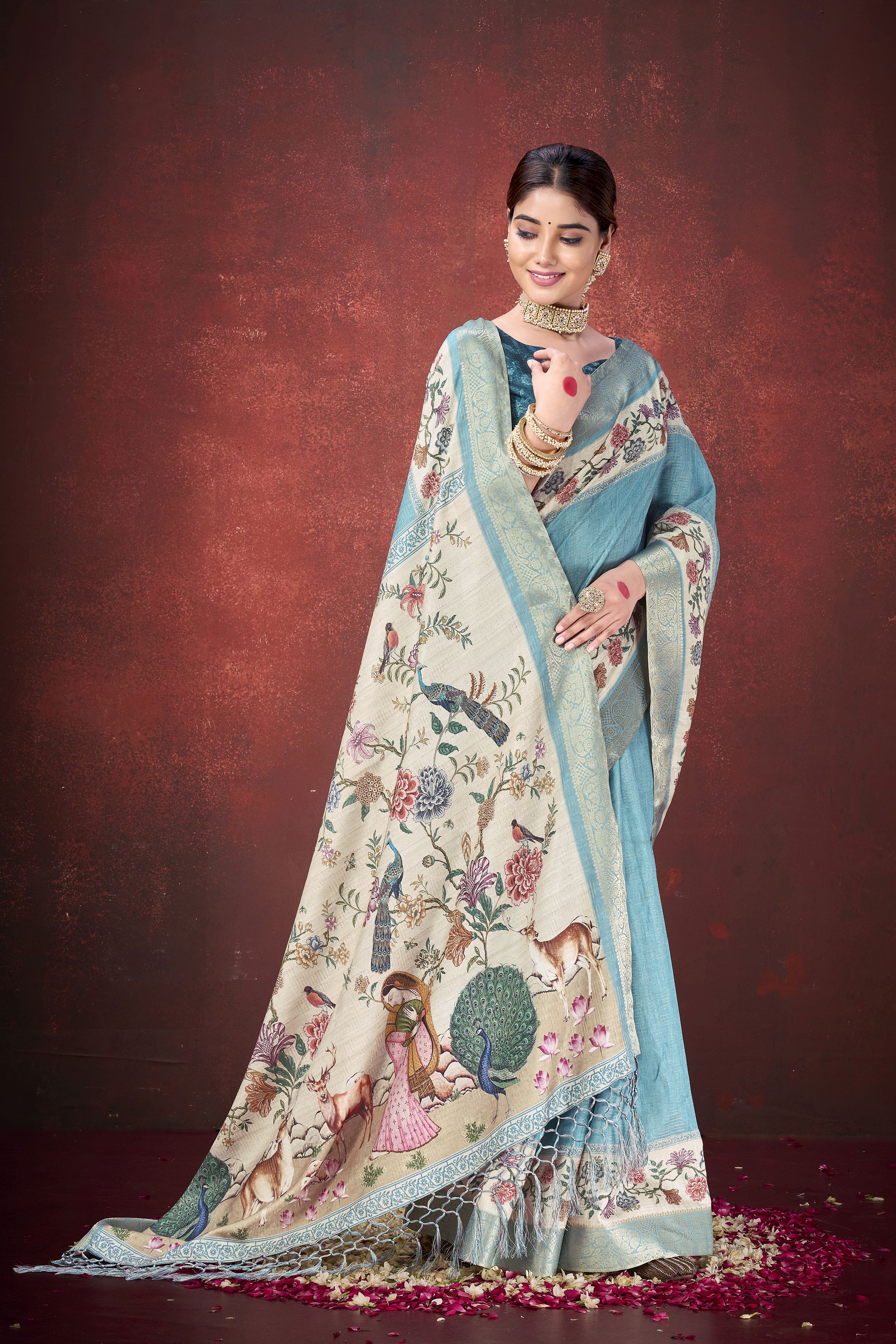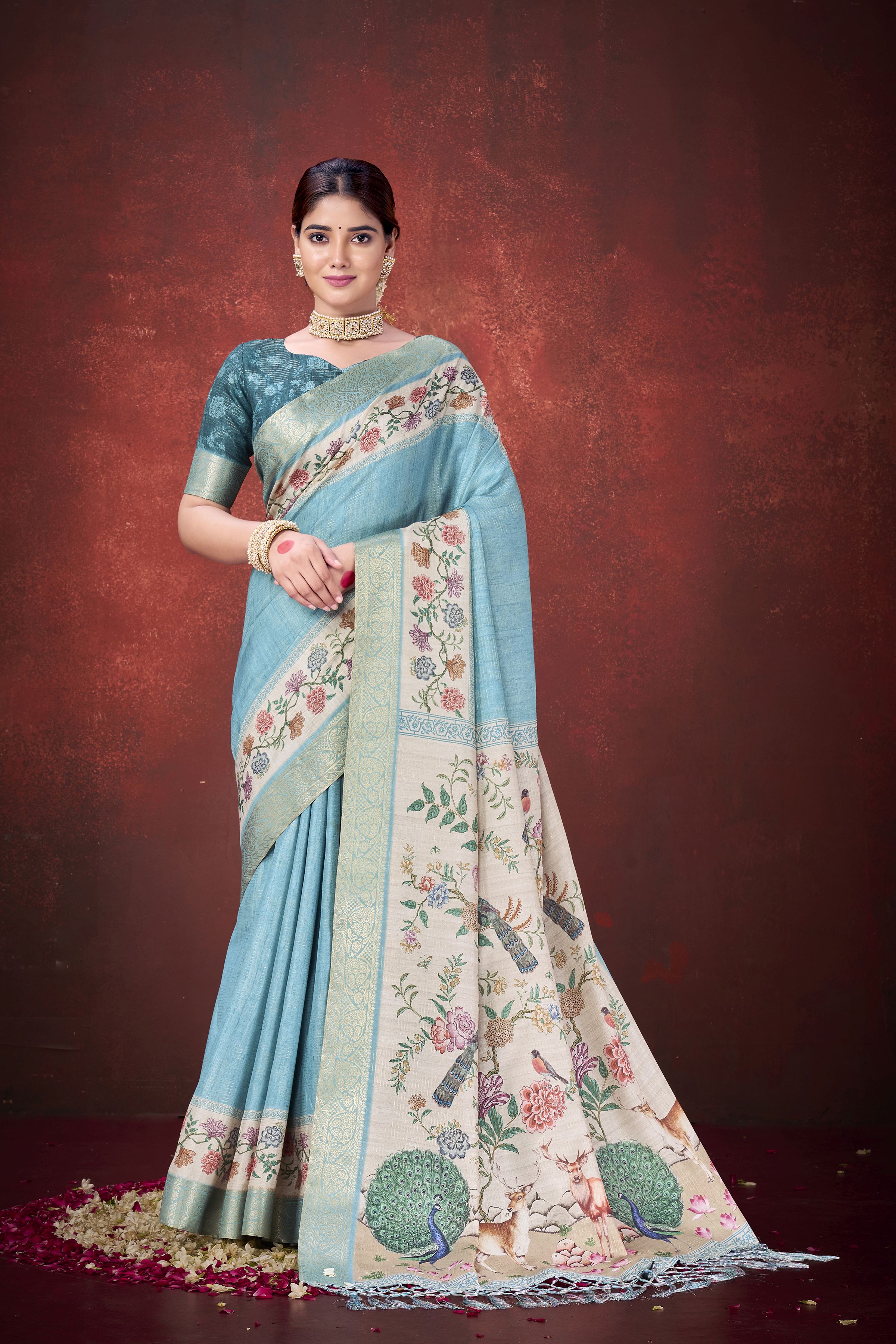 Sea Green Color Smart Partywear Kantha Jari Silk Traditional Print Saree