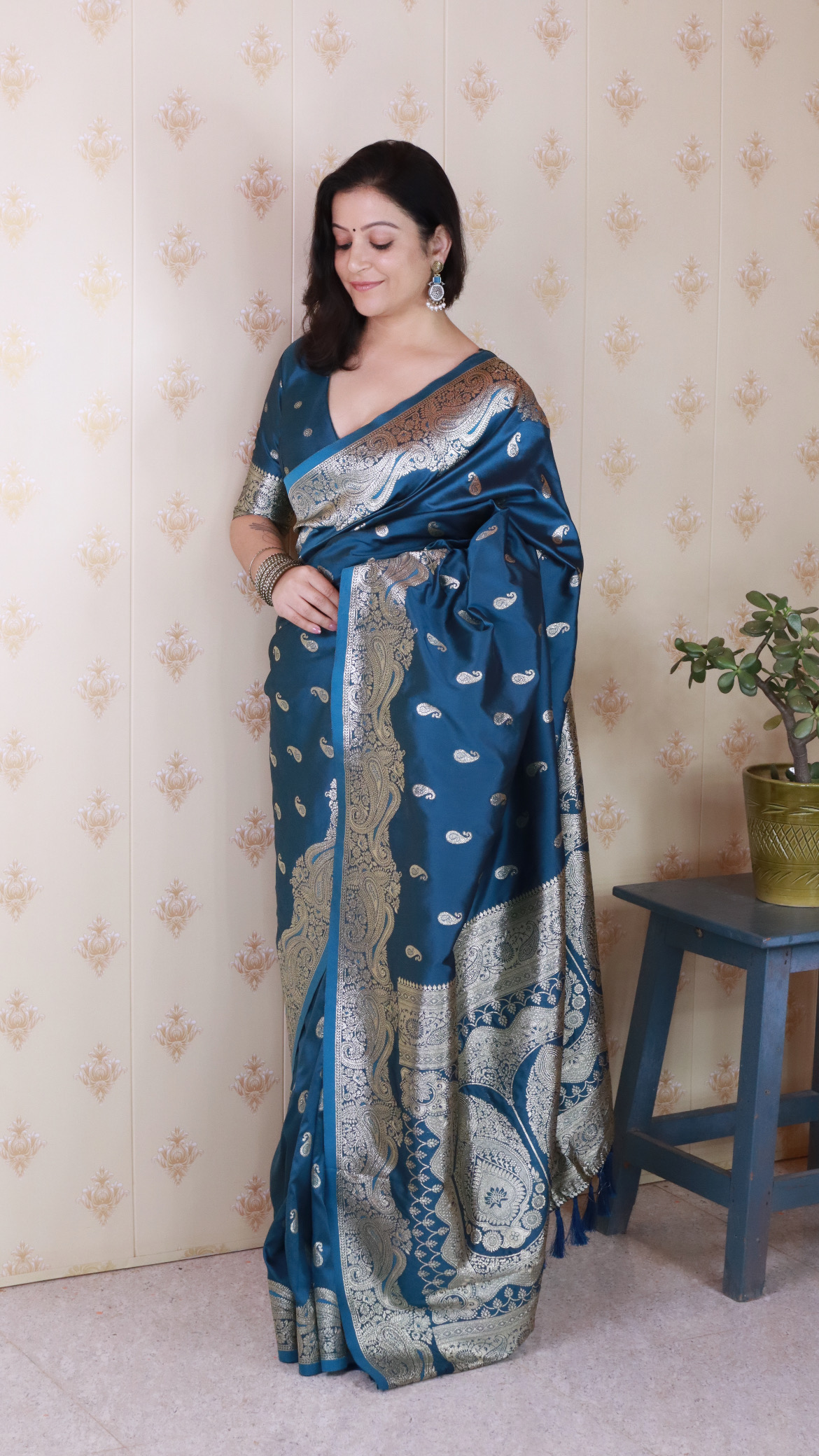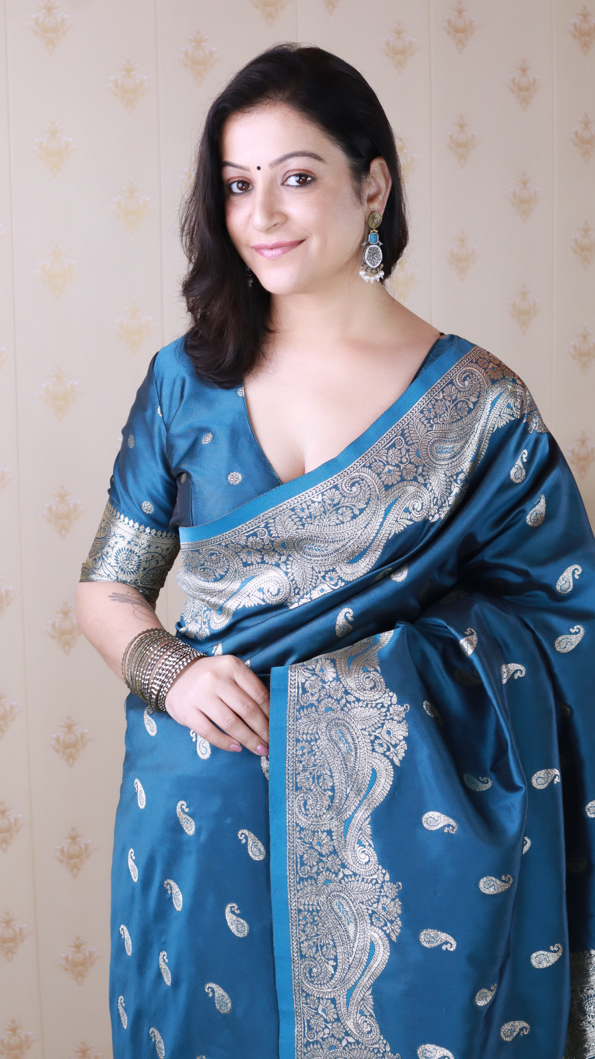 Teal Blue Color Banarasi Silk Saree Woven Silver Jari Designer Ceremonial Partywear Saree