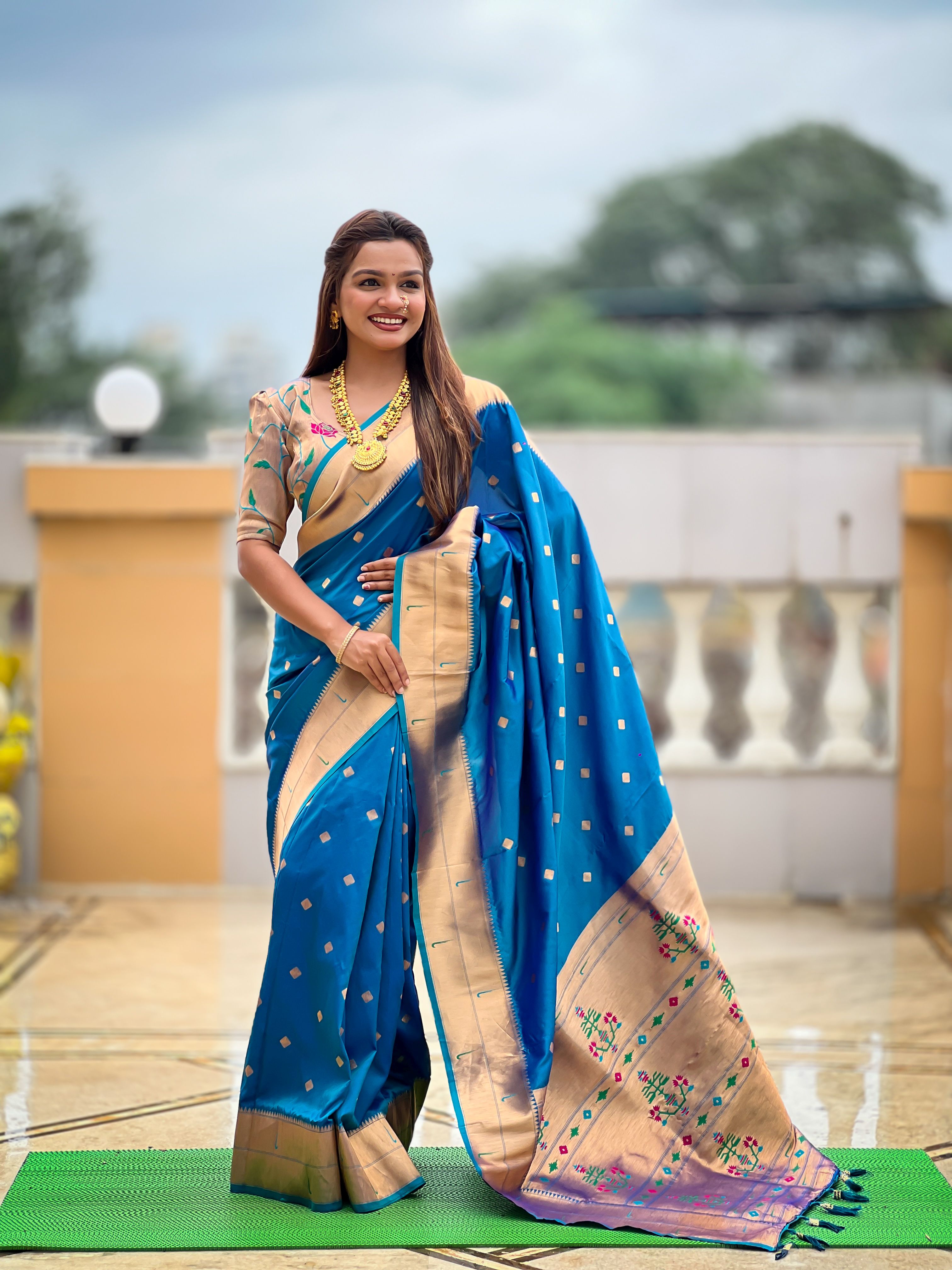 Teal Blue Color Paithani Silk Woven Jacquard Jari Designer Ethnic Saree
