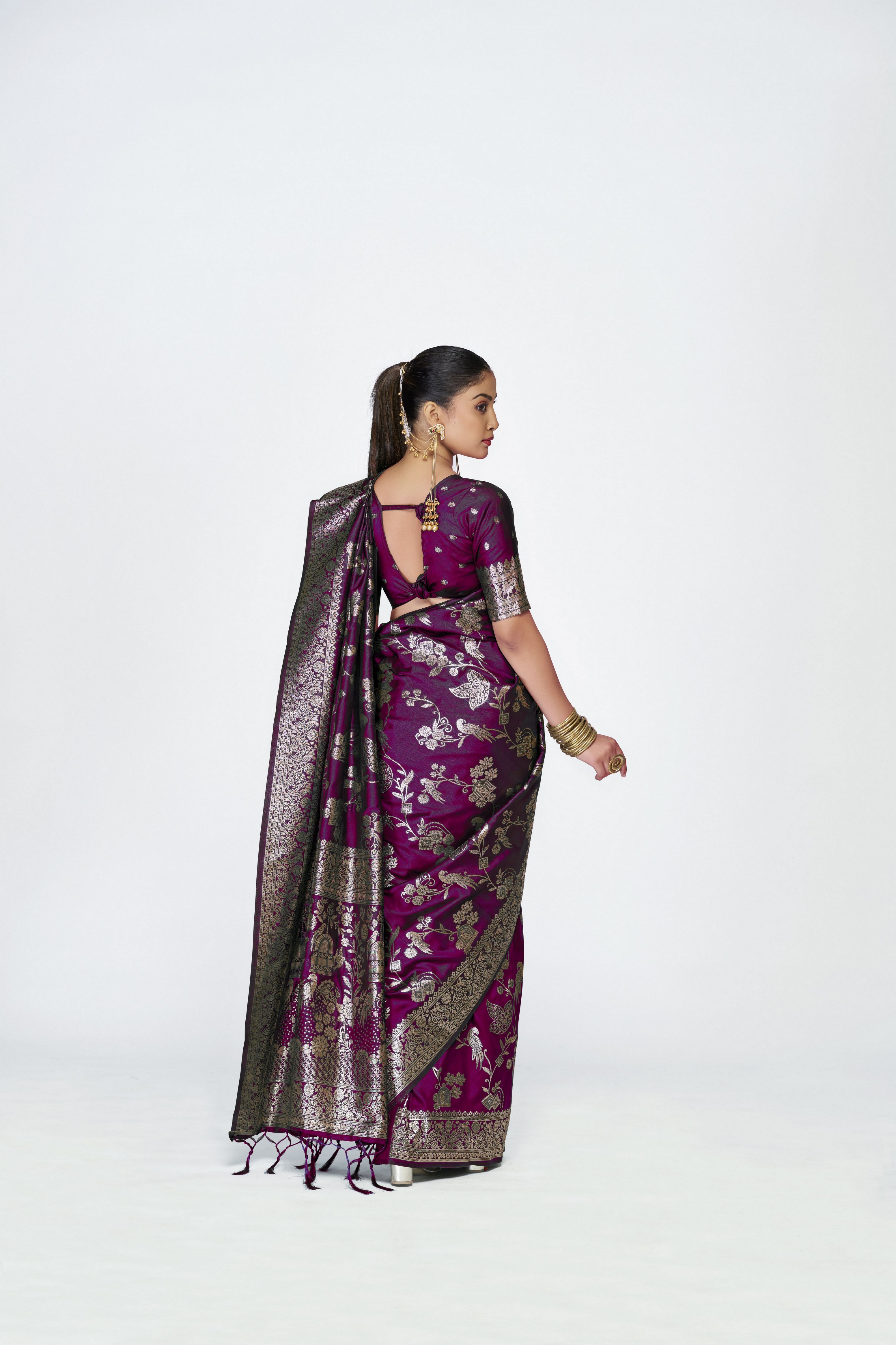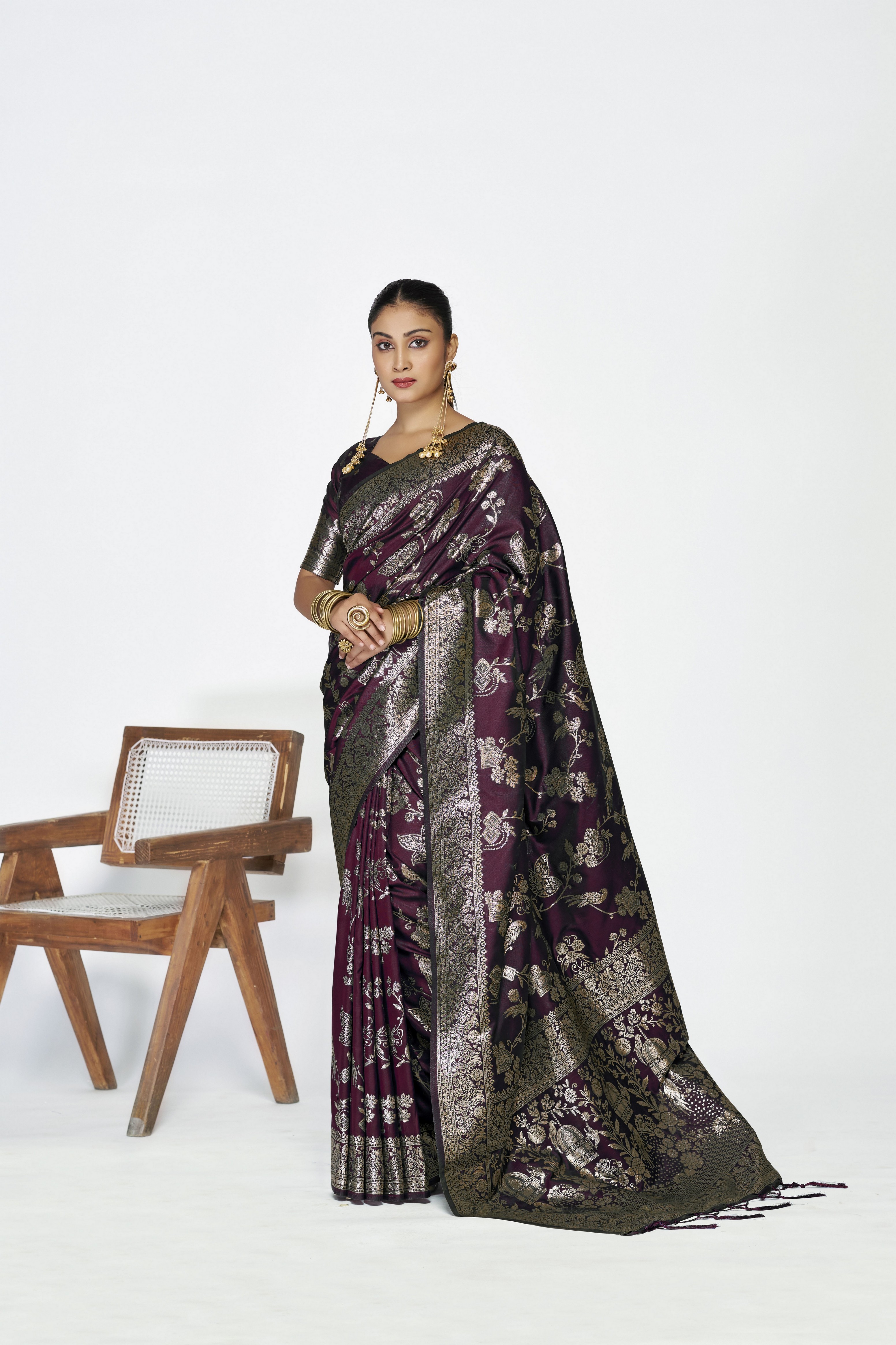 Wine Color Banarasi Silk Fabric Woven Jari Designer Ceremonial Partywear Saree