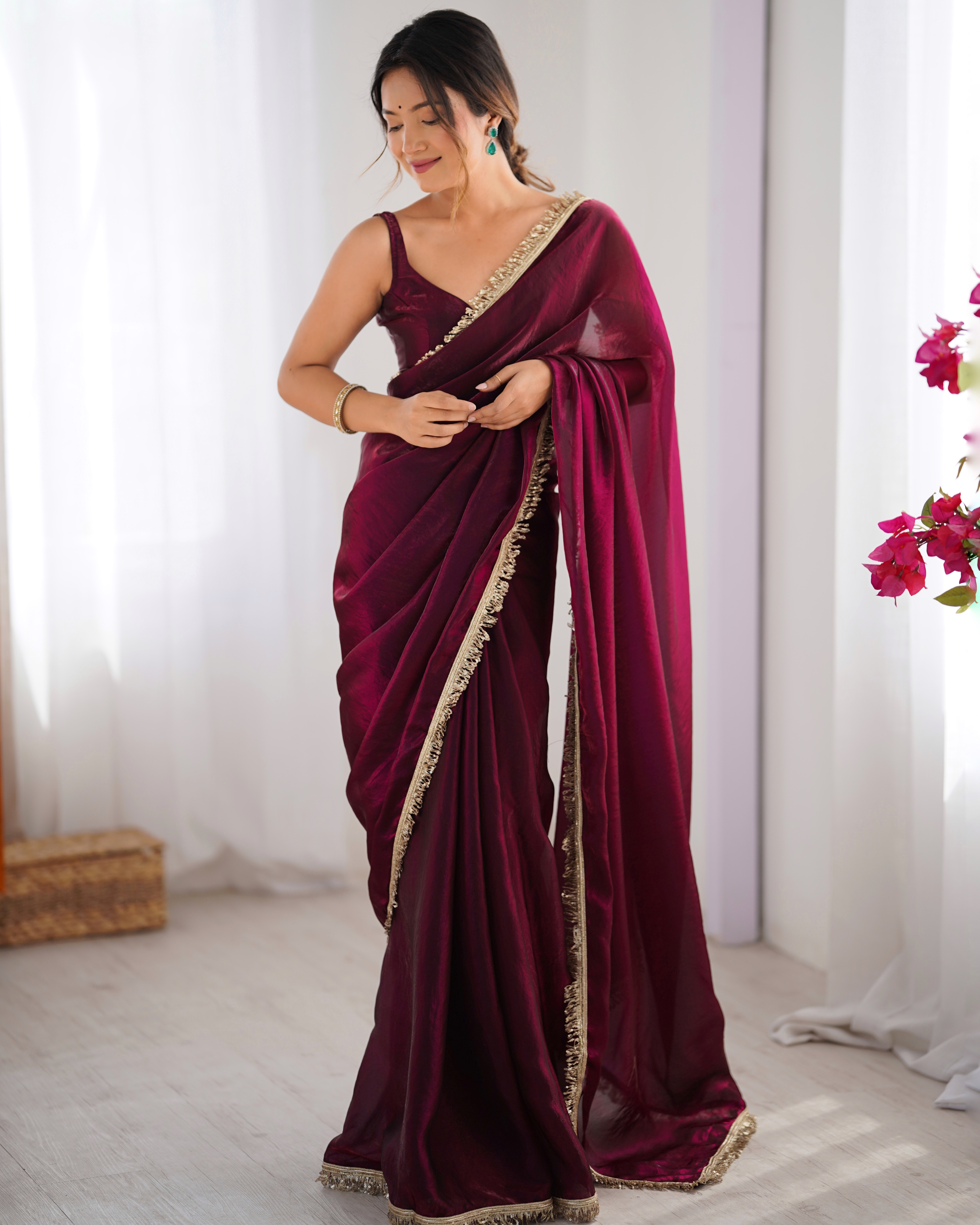 Wine Color Fendy Satin Rich Looks Ceremonial Girlie Saree