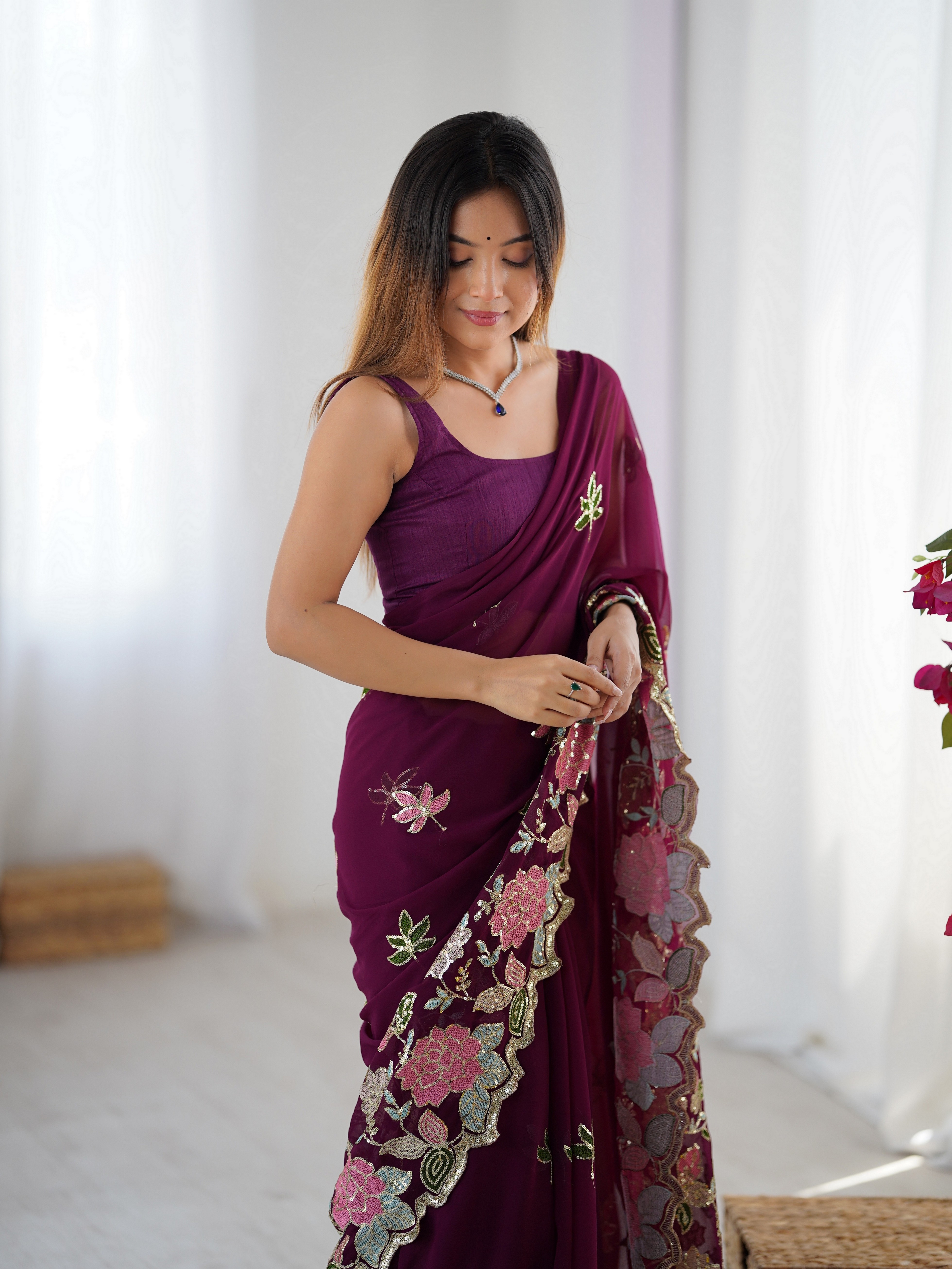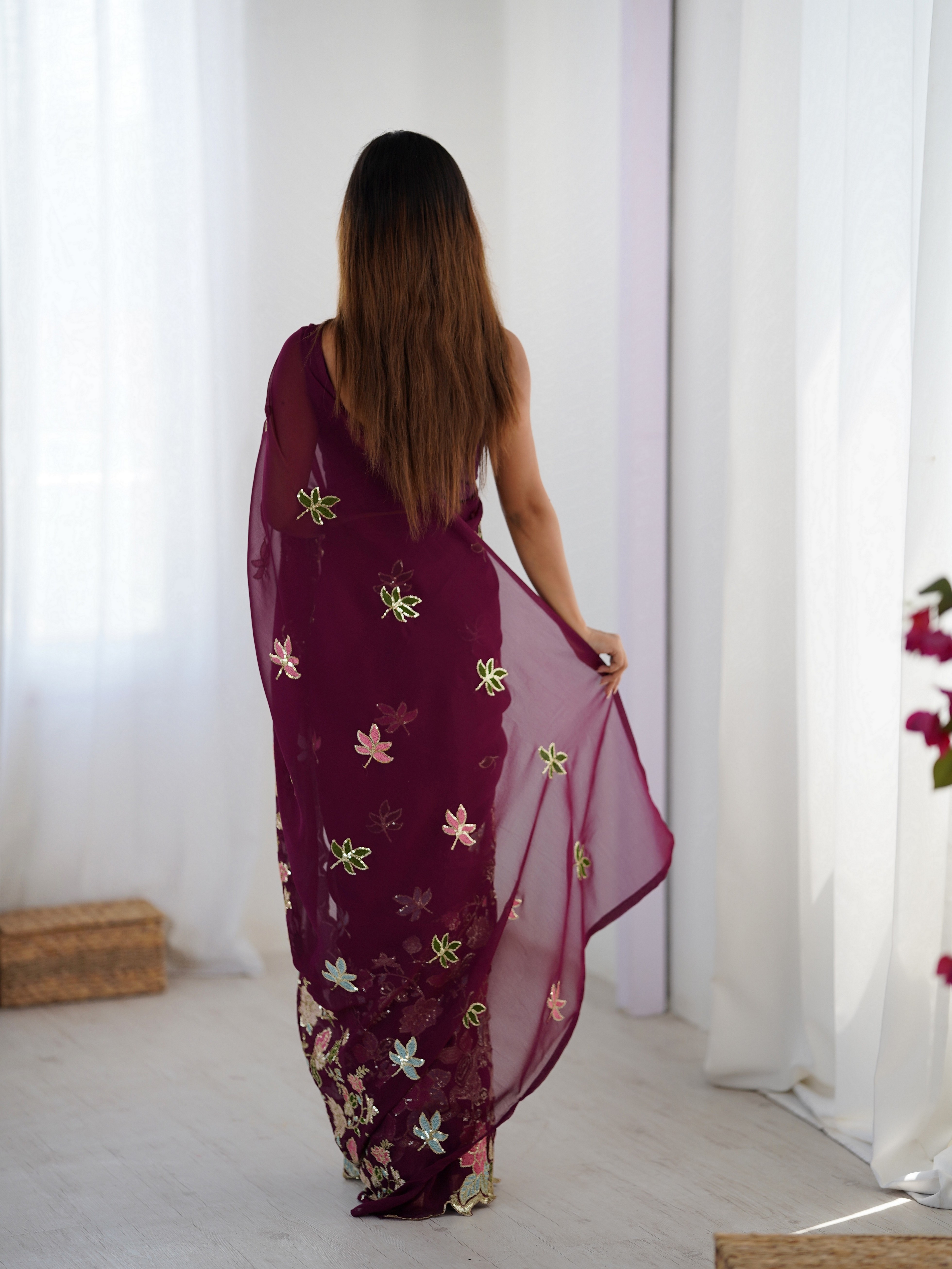 Wine Color Floral Embroidered Sequins Work Partywear Saree