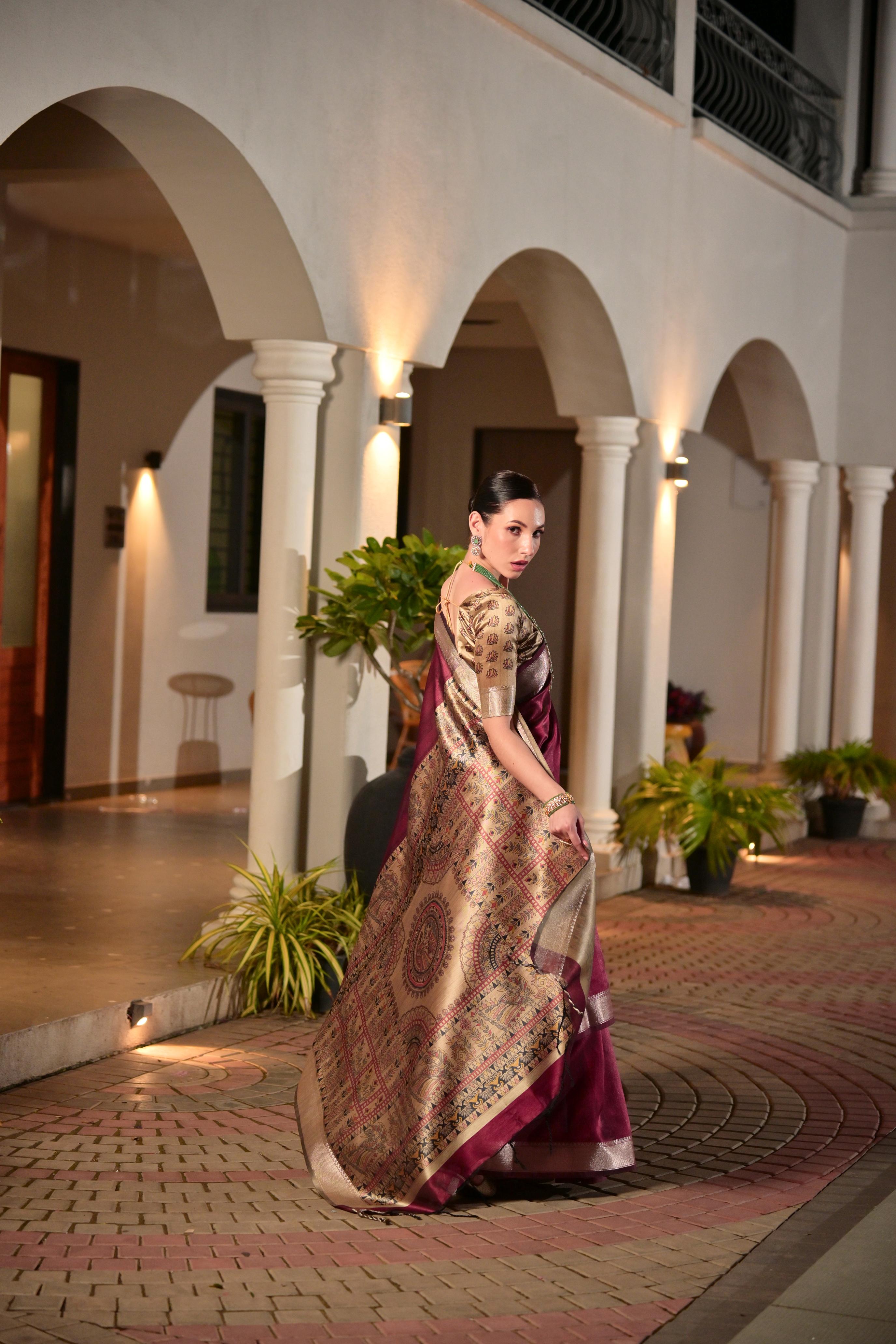 Wine Color Smart Khadi Raw Silk Saree With Graceful Madhubani Style Print