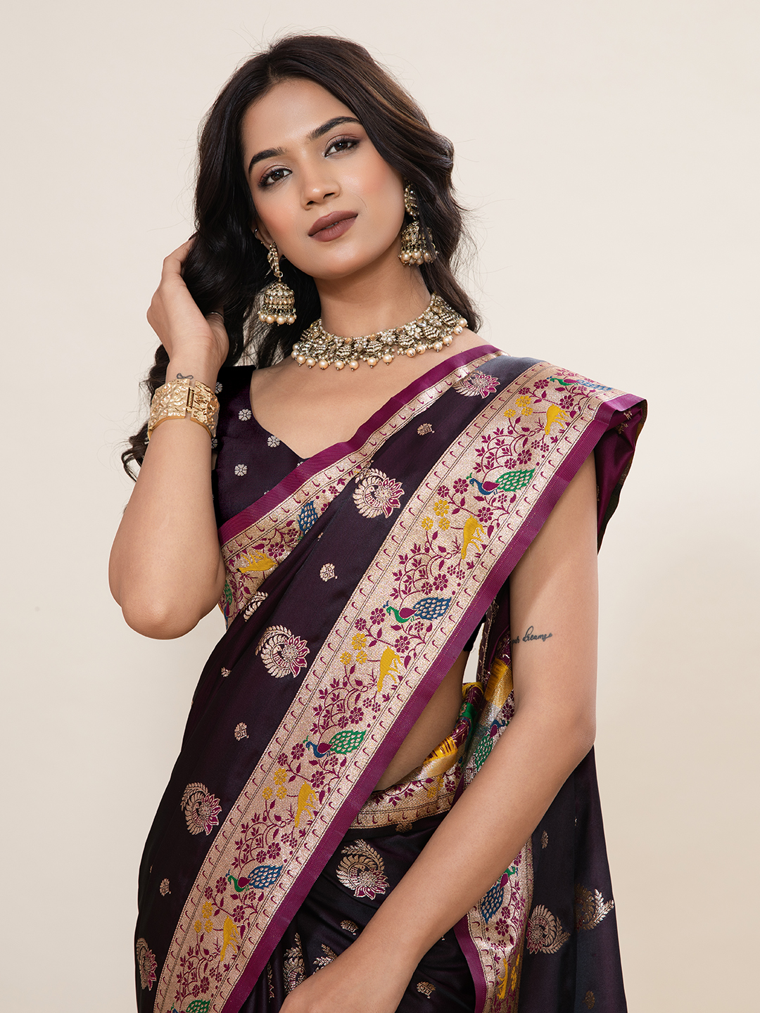 Wine Color Wine Fabric Wevon Meenakari Designer Sophisticated Ceremonial Saree